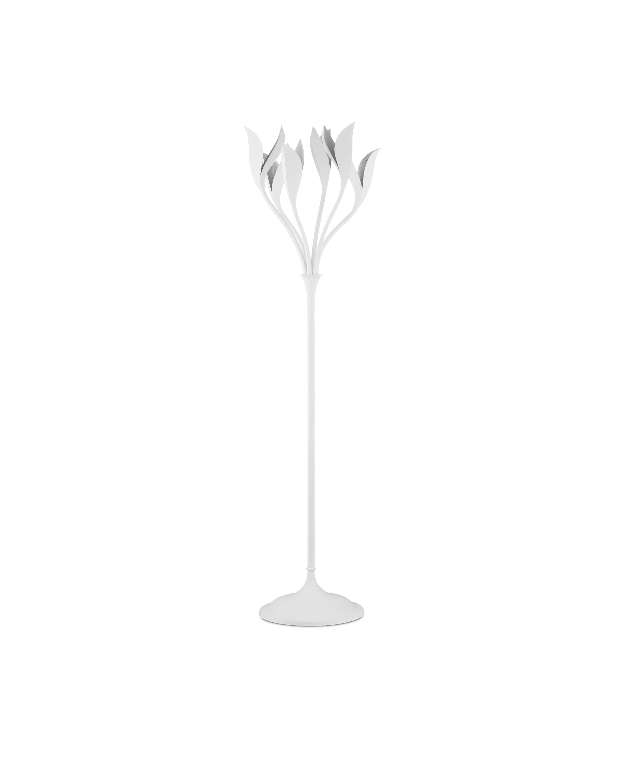 • The big, beautiful blossoms of the Snowflower Floor Lamp and the body they flow up from are made of wrought iron in a gesso white finish. Unfolding toward the ceiling, the undulant petals direct the light upward. The pale finish that flows into the interiors of the blooms turns warm when the bulbs illuminate it. The white floor lamp with its wild botanical personality has a foot switch for ease of turning it off and on.