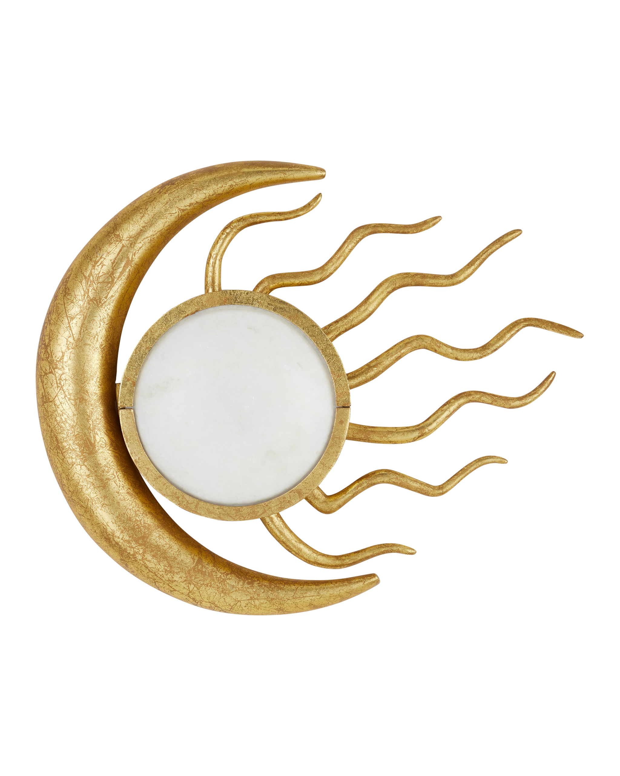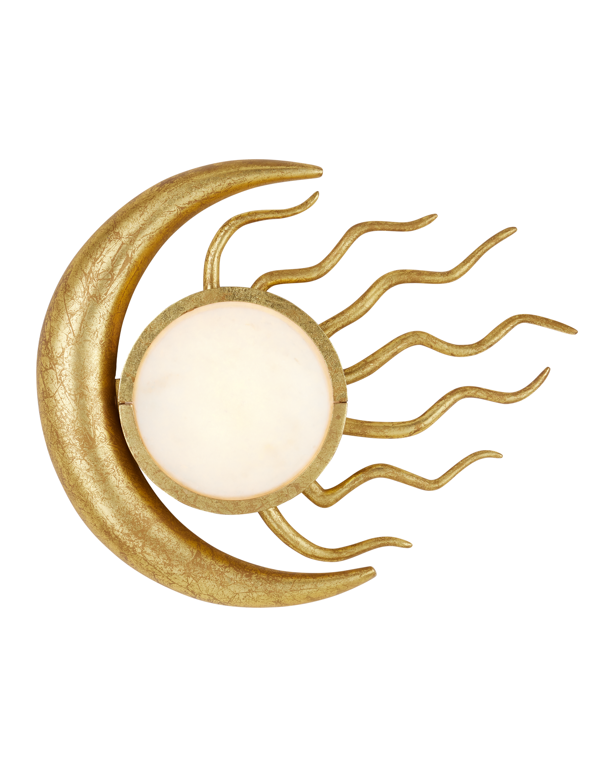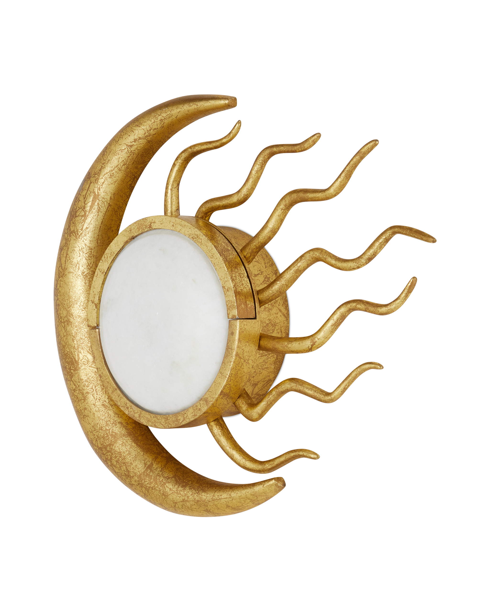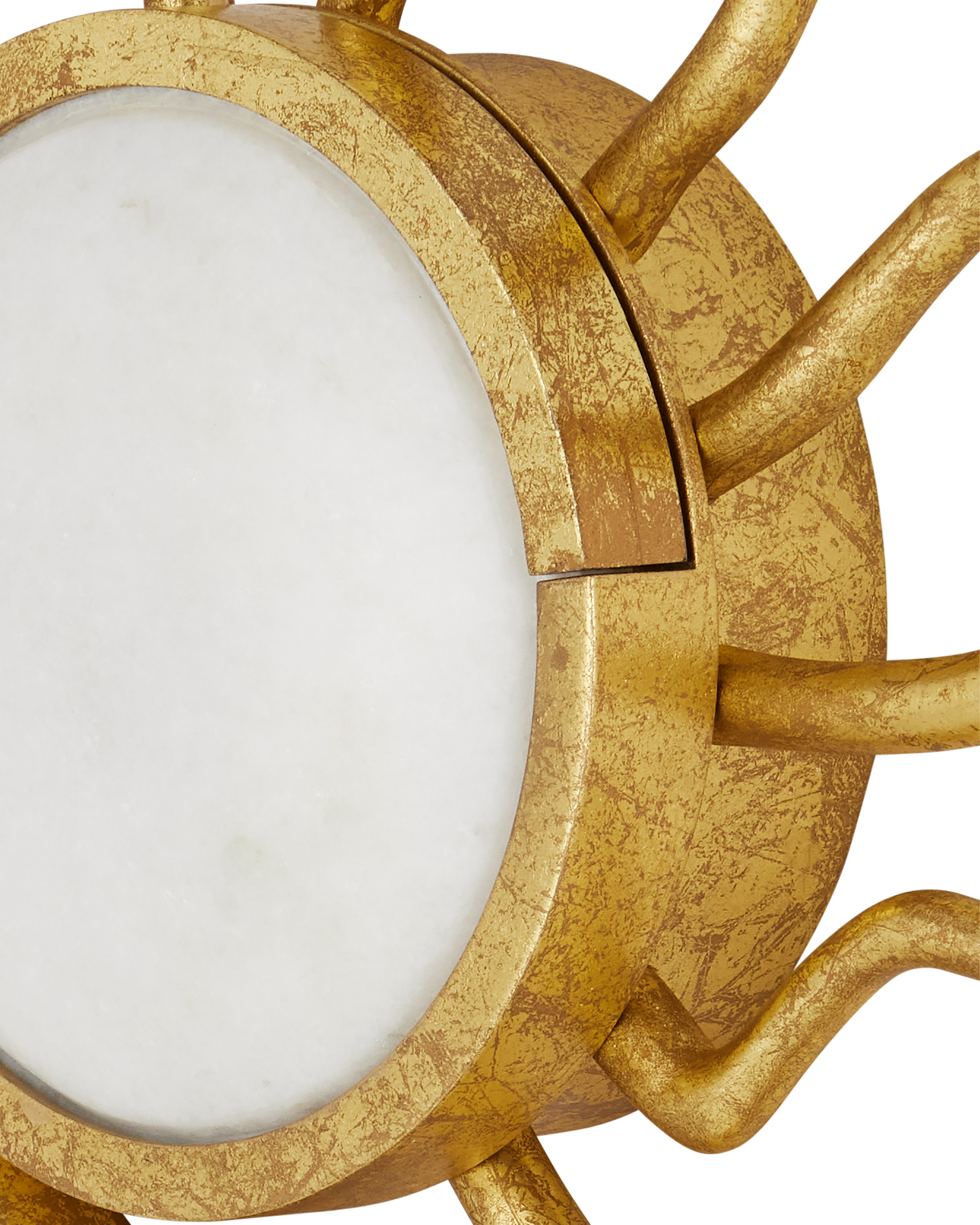 • In Nahuatl, one of the ancient languages of the Aztec culture, Tona means Sun. It is in the spirit of honoring these early people in Mexico that Marjorie Skouras designed the Tona Wall Sconce. Her initial spark was a vintage brooch she found that spoke to her of the motifs proliferating throughout the country during that dynamic era. Made of iron in a gold leaf finish, the wavy rays emanate from a circular disc of white marble that glows warmly when the lights are on. The artistry with which the finish has been applied to this ADA-compliant gold sconce brings it a luxe feel.