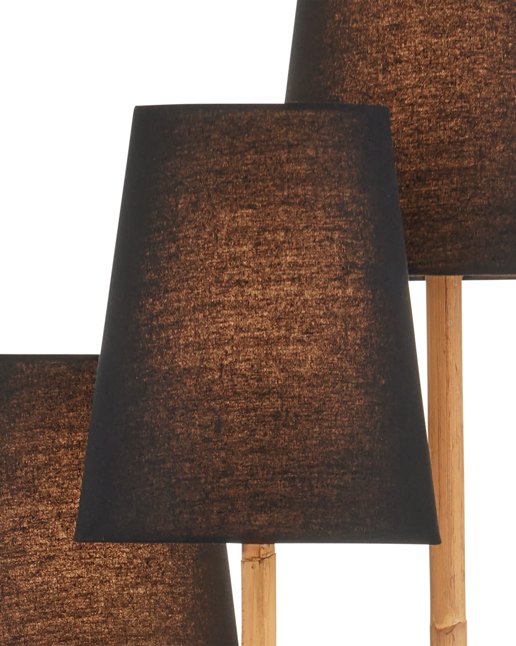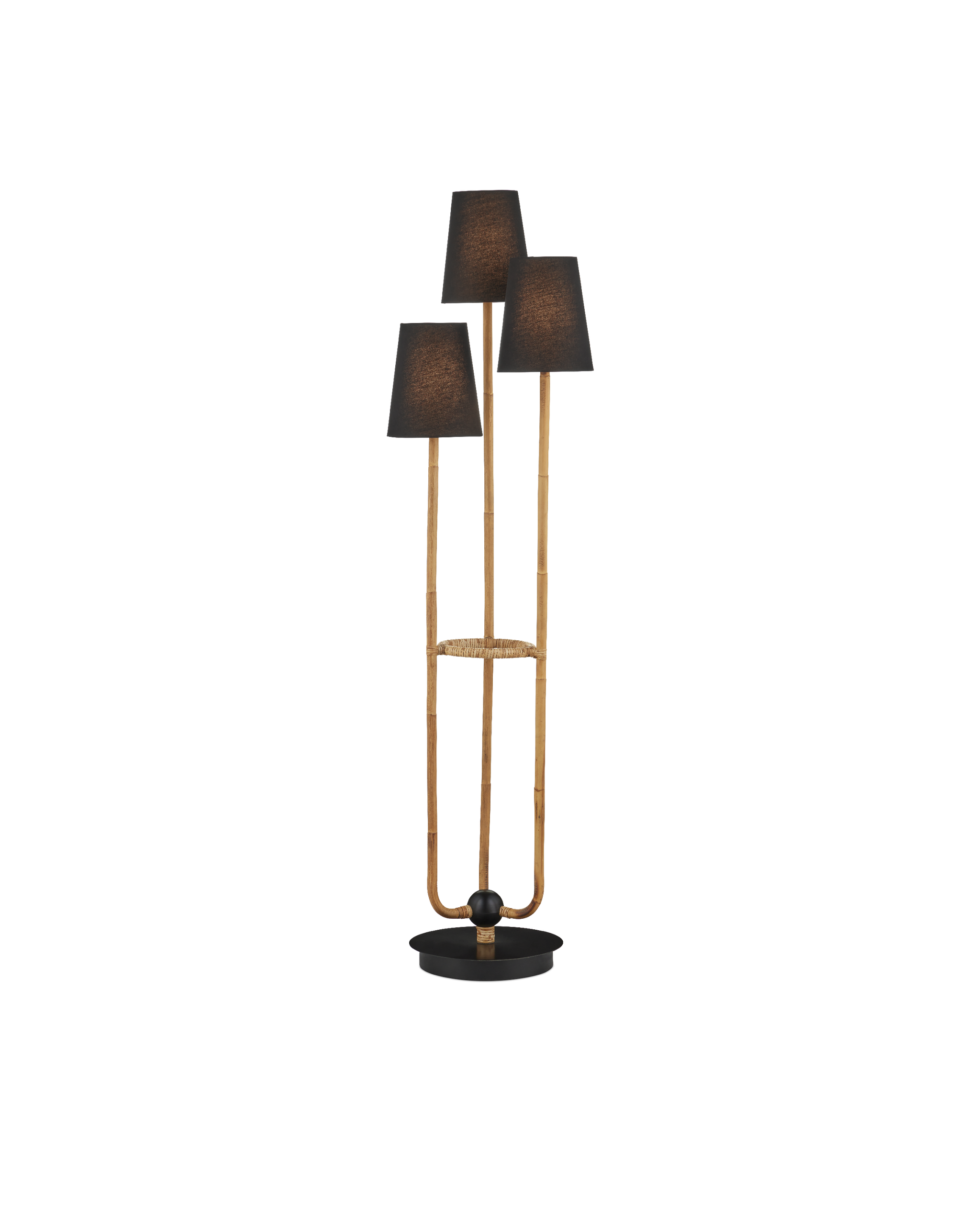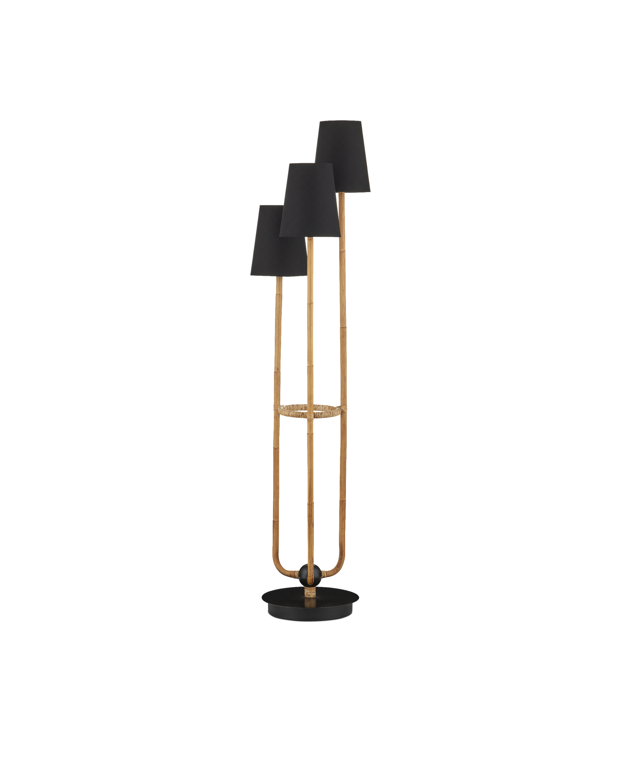 • The three stems of the Triptych Floor Lamp that flow up from the satin balck base are covered in natural rattan until they disappear under the black fabric shades. There are a number of special attributes to this design: the combination of black and neutral tones, and the cascading effect of the three shades as their supports grow shorter. These design details make the rope-wrapped floor lamp a stylish choice for a room. A foot switch enhances easy off and on maneuvering even if the floor lamp is tucked behind a piece of furniture.