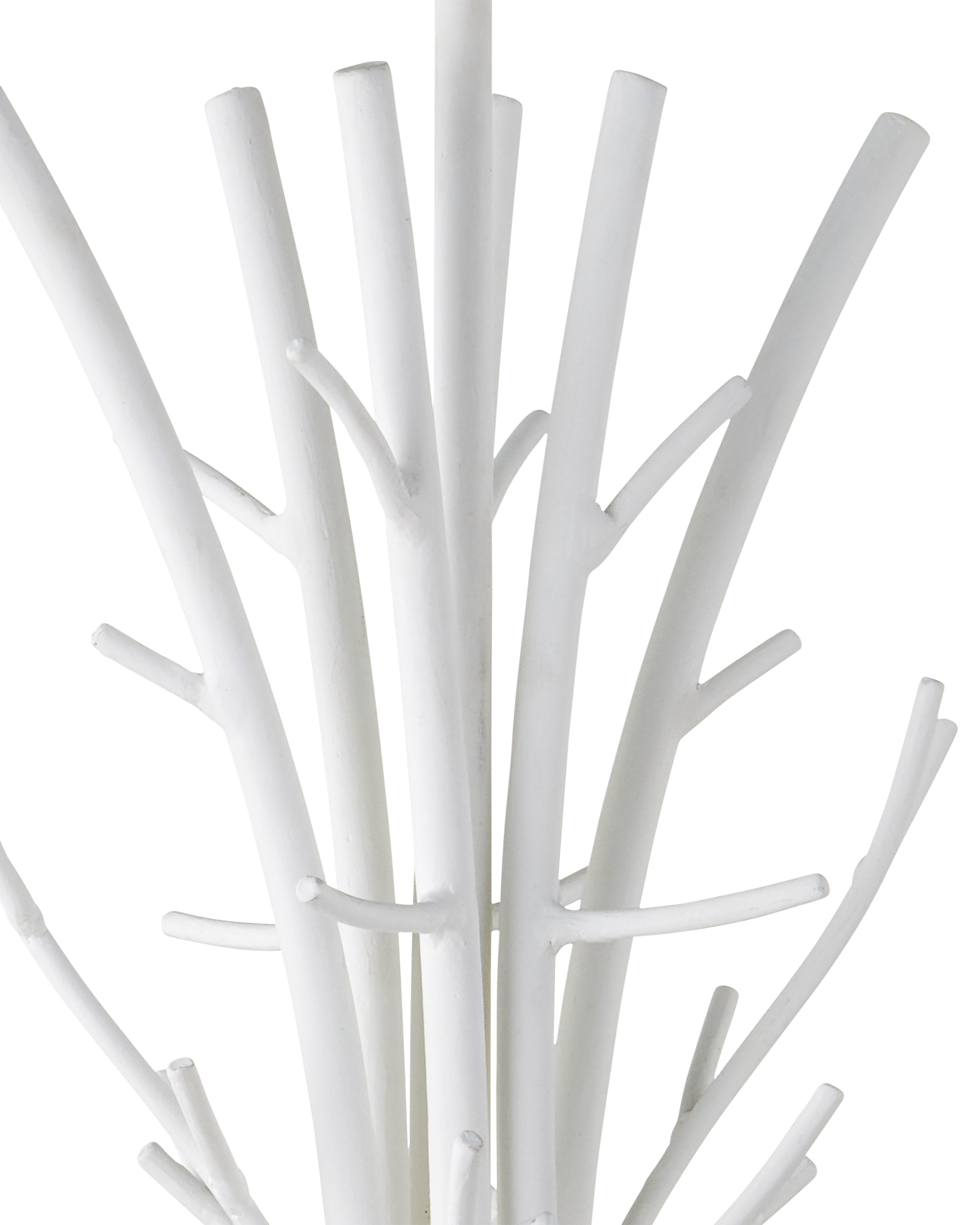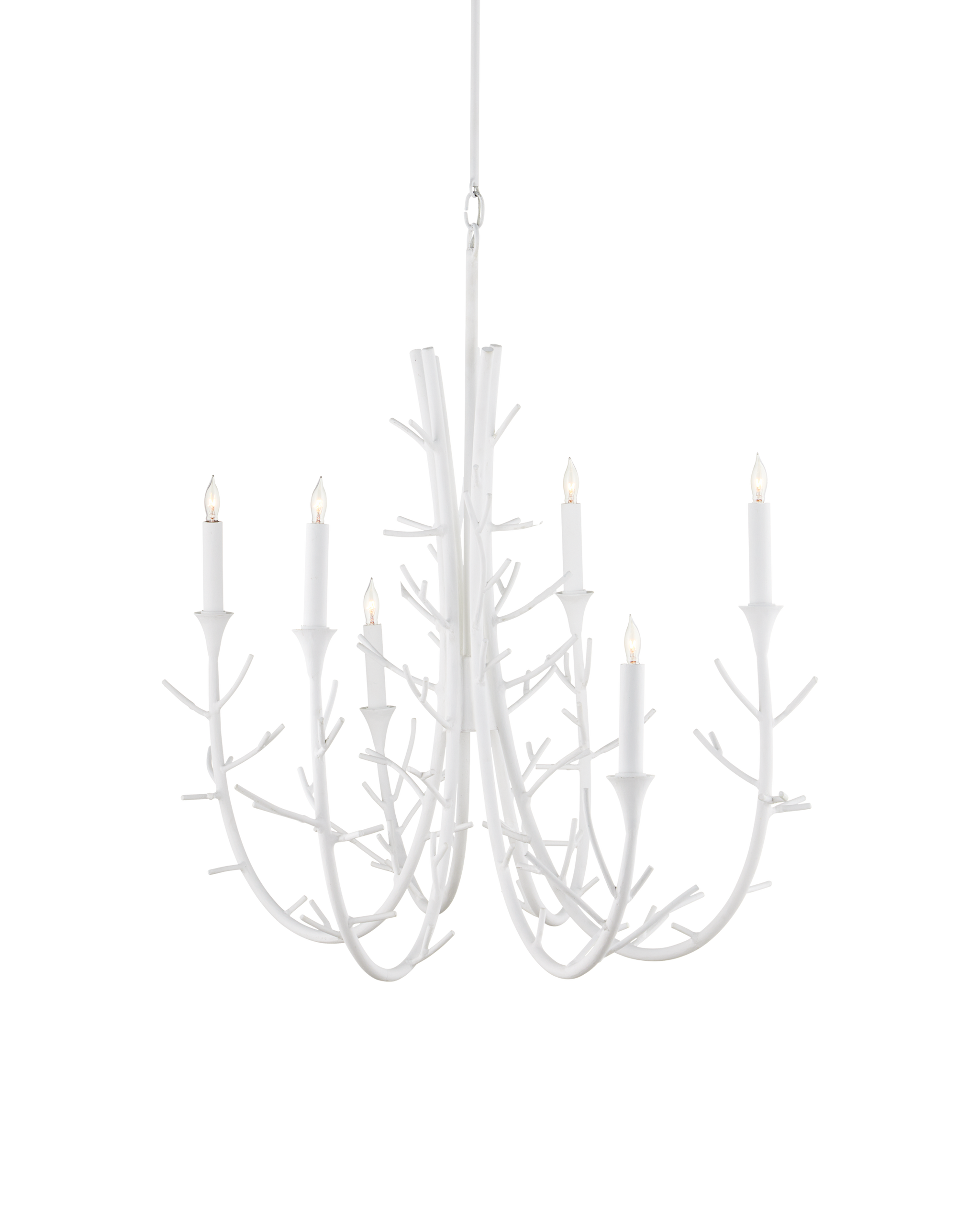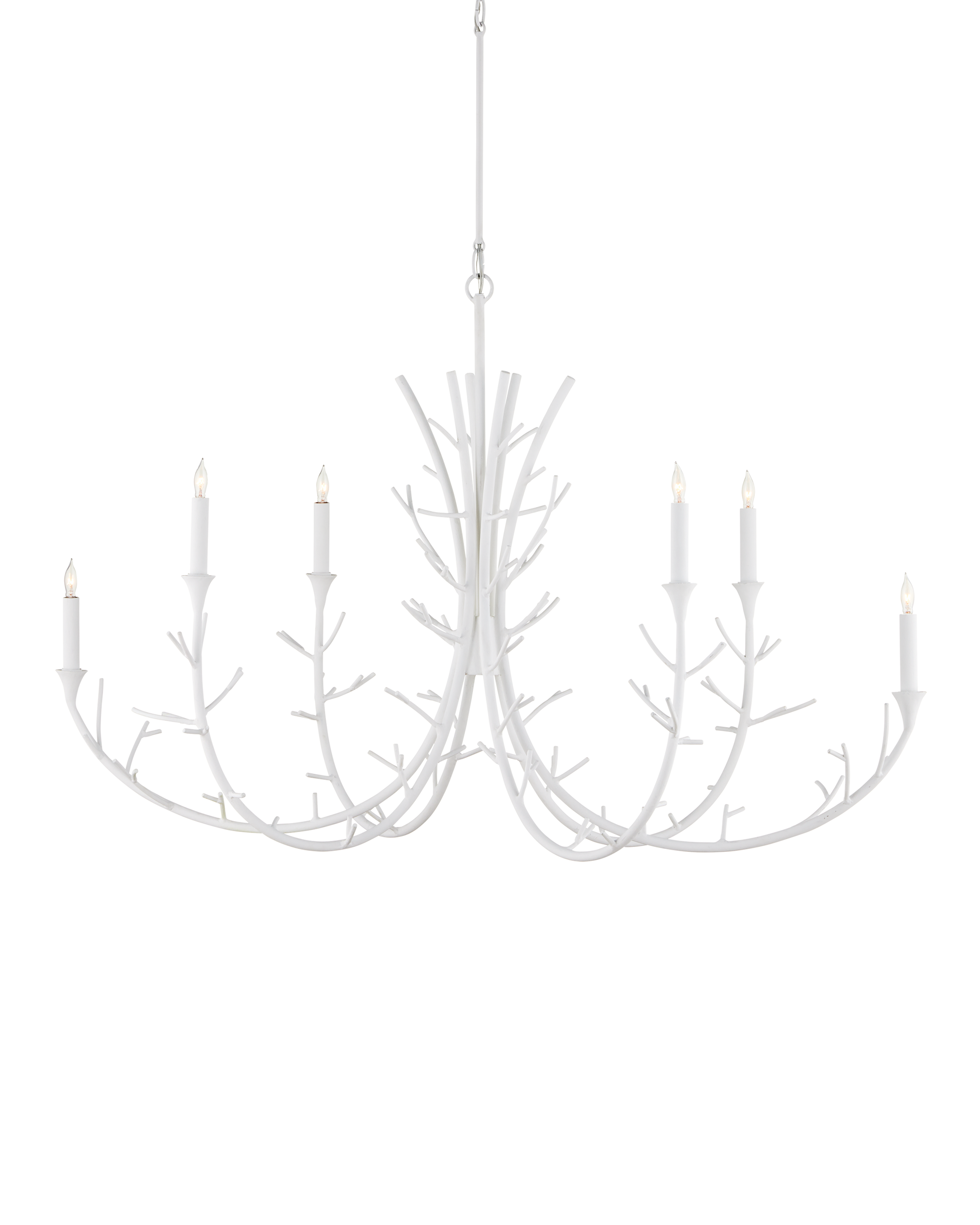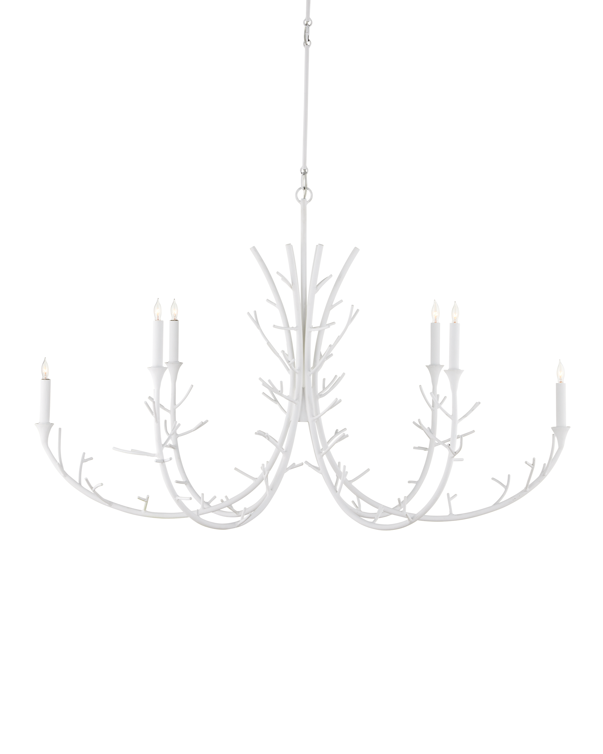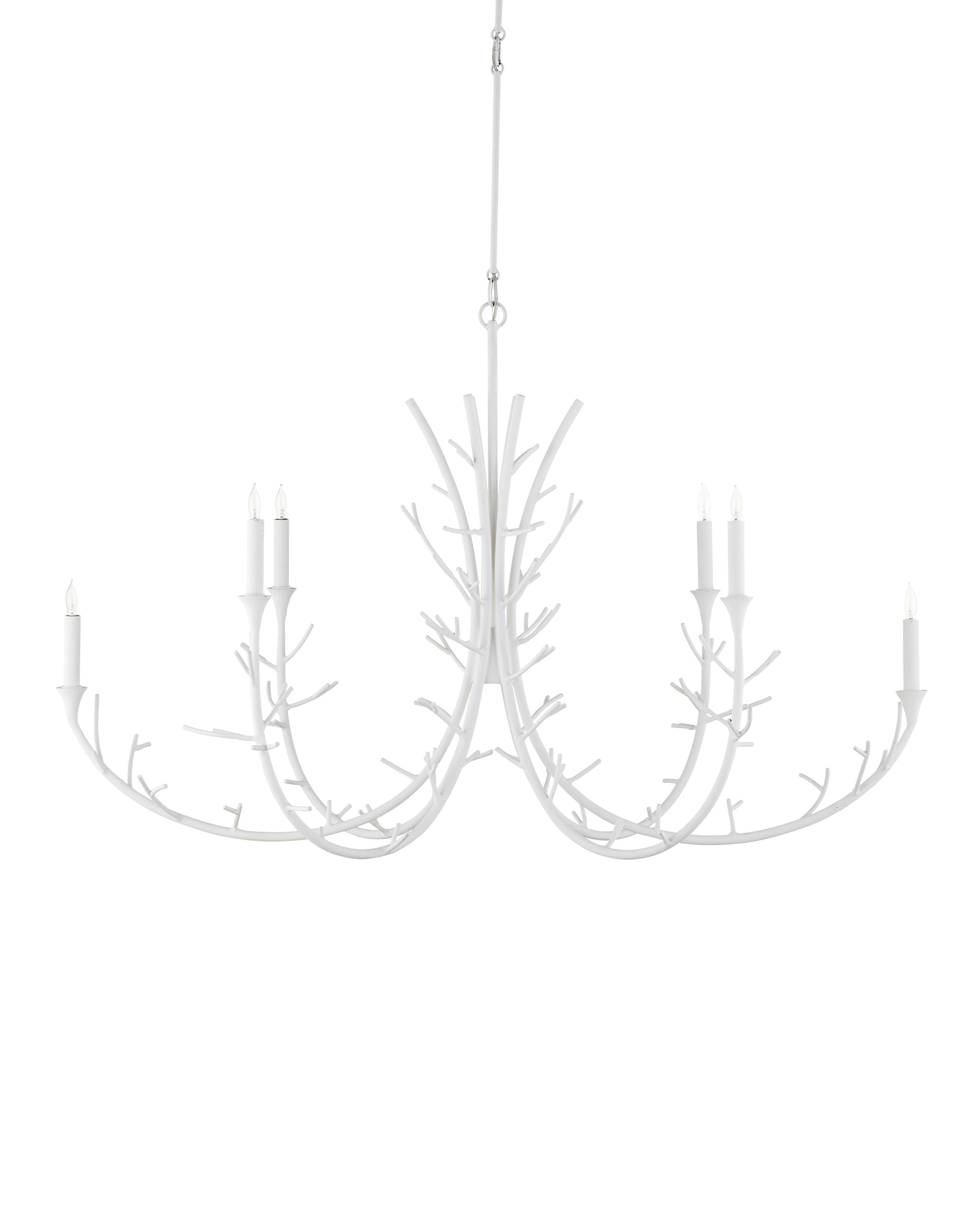 • The Twiggy Oval Chandelier draws inspiration from snowy landscapes, with arcing limbs ornamented with spiky twigs. The design aims to capture the way snow collects on the leafless branches of trees, creating a visually striking and evocative piece. The gesso white wrought iron design is oblong, making it ideal for illuminating rectangular dining room tables or long kitchen islands. Adjustable from 47.5" to 112.5" with use of included chain/rod kit/cable. If your space calls for a longer drop, additional chain/rods/cable is available for purchase.