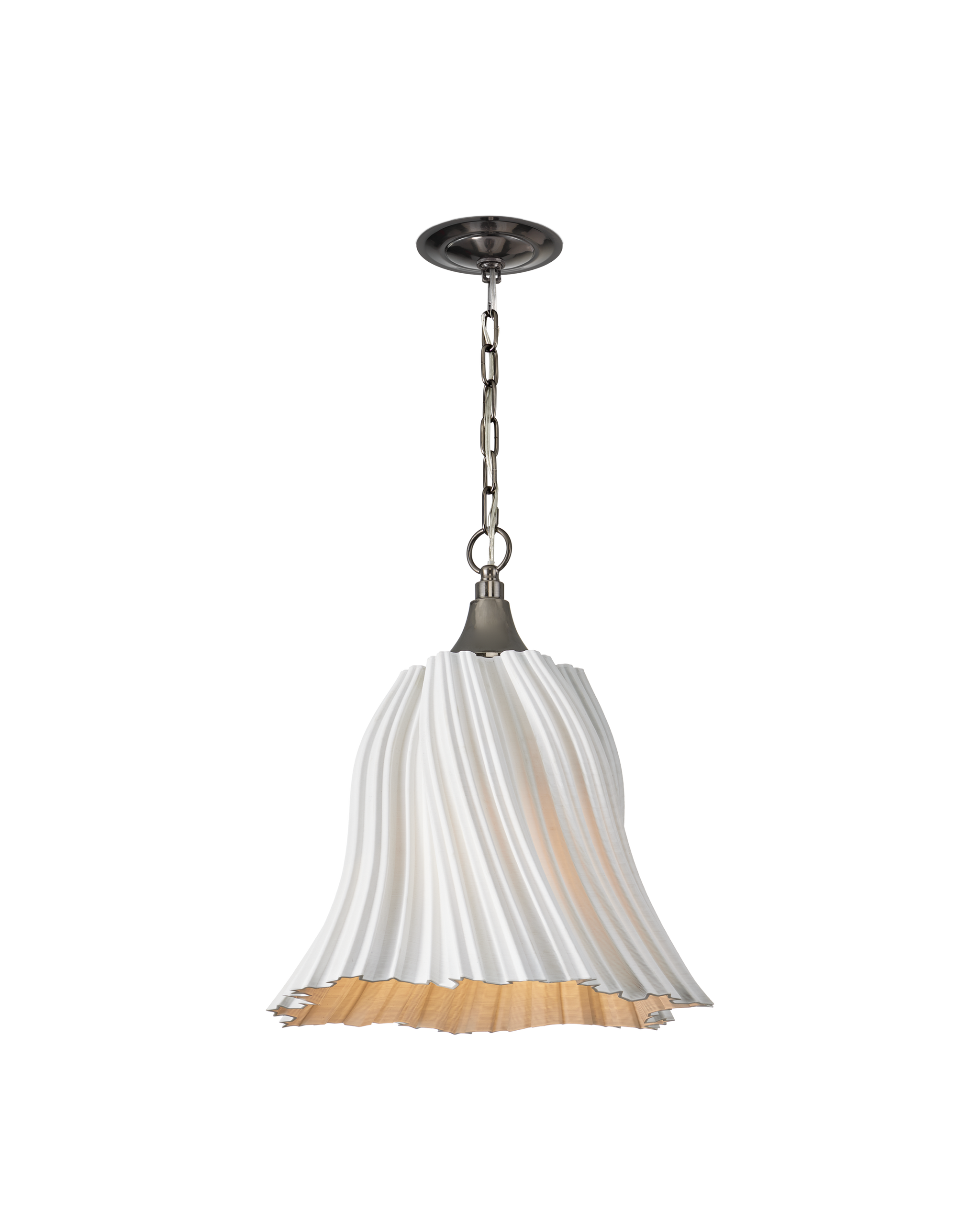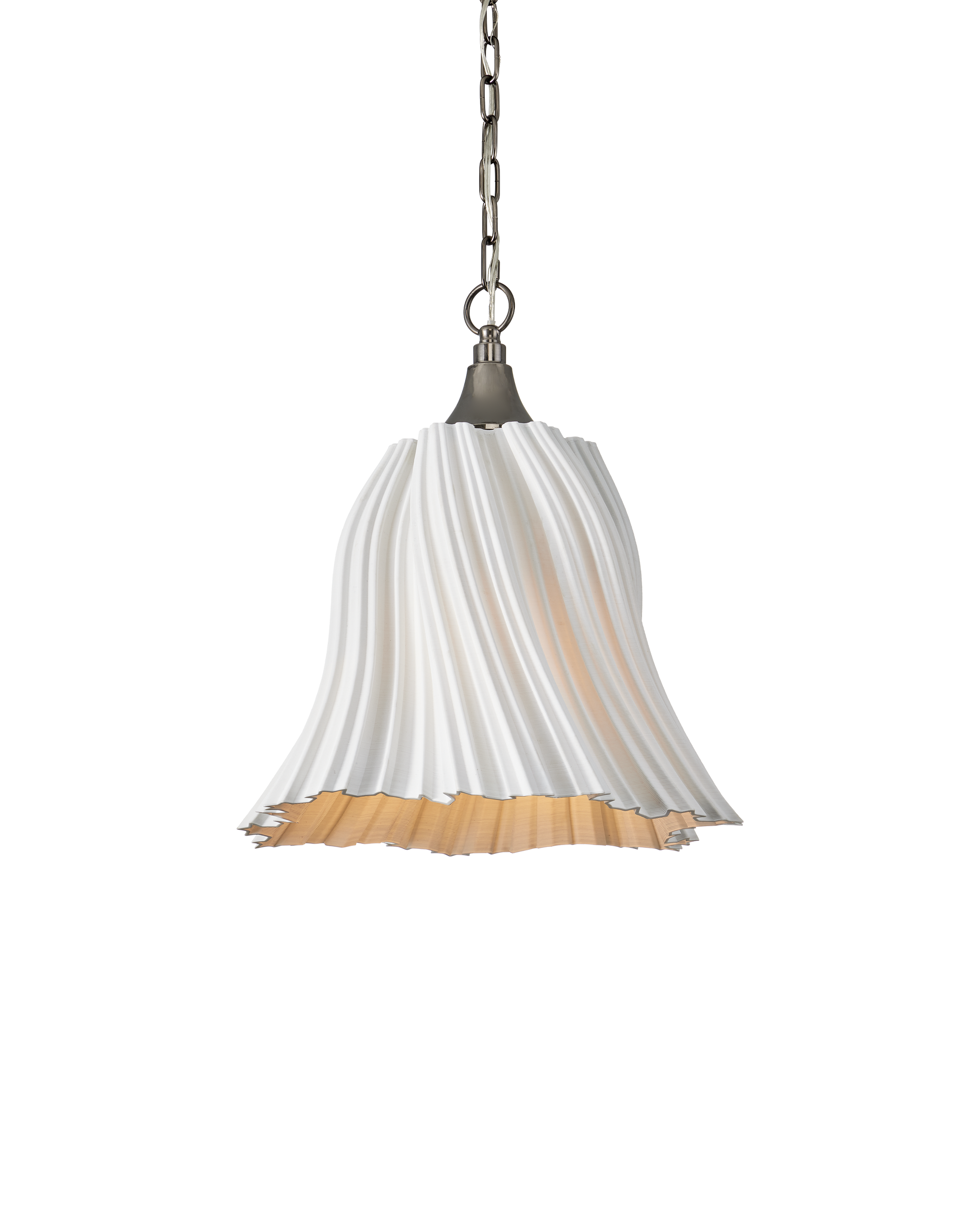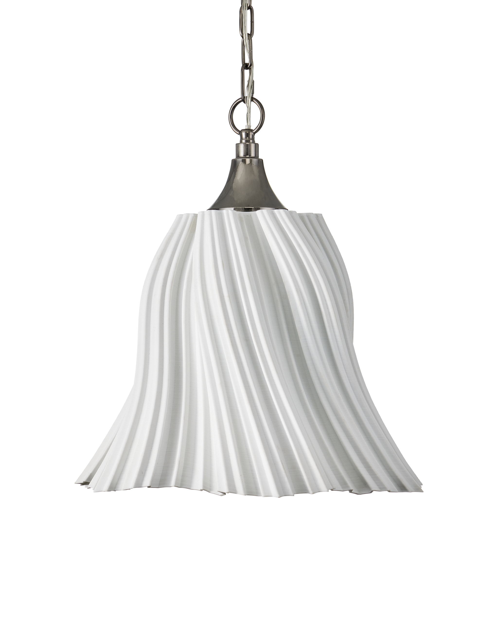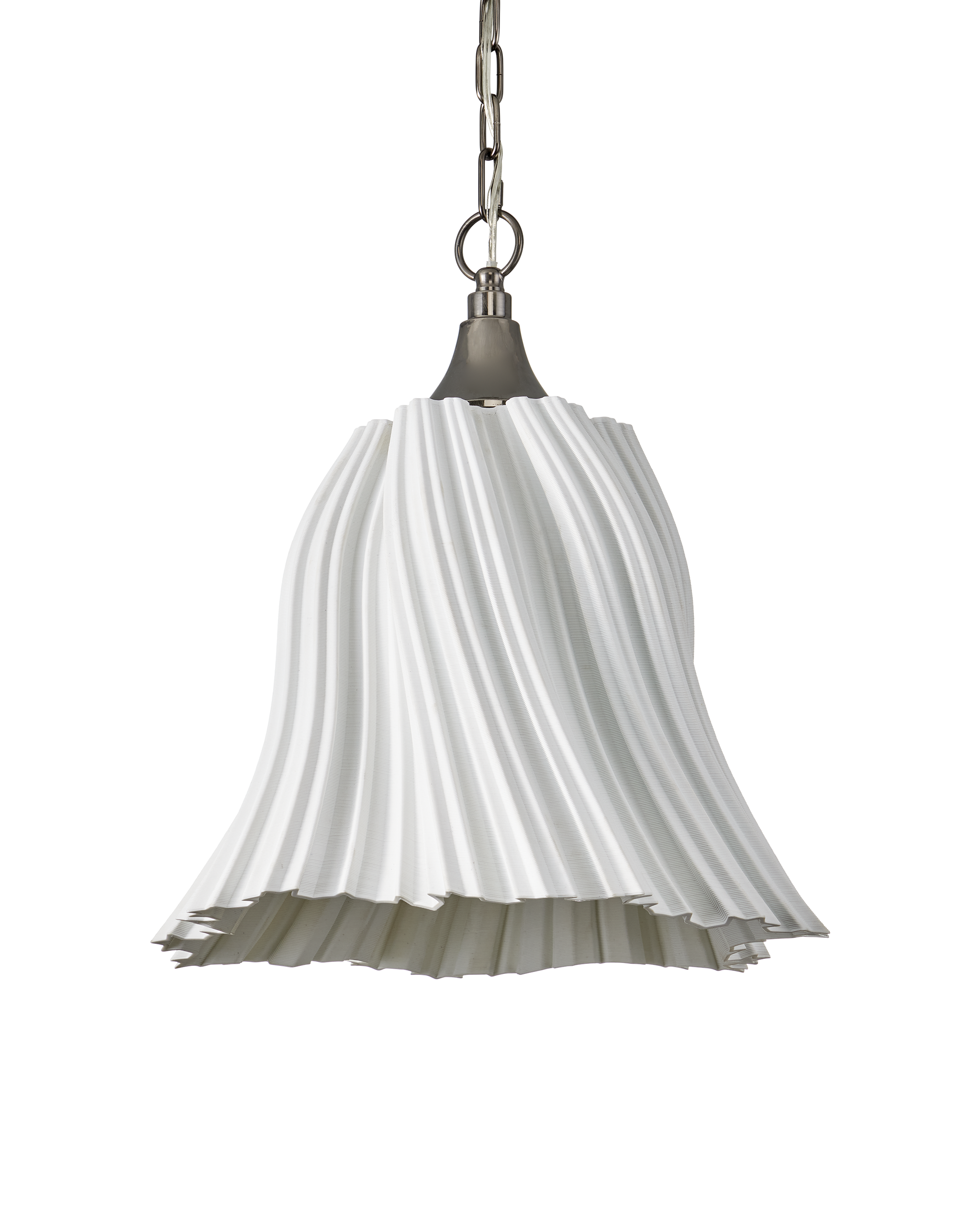 • The Twirl White Pendant is made of 3-D printed porcelain to create the illusion that the shade is twisting as it flows downward. This sense of movement implied by the rigid white clay fools the eye into believing it is made of fabric set into motion. The metal in an antique brushed nickel finish contrasts the paleness of the shade on the one-light pendant, which is dimmable. Adjustable from 26" to 94" with use of included chain/rod kit/cable. If your space calls for a longer drop, additional chain/rods/cable is available for purchase.