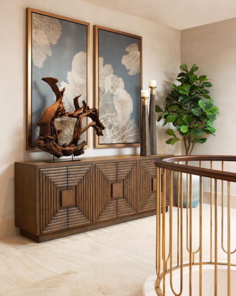 Notable for its extraordinary functionality and cool design, the Morombe Credenza is nothing short of artistry in wood. A deep-toned distressed cocoa finish highlights the skillfully carved patterns of natural wood that form embedded squares in a stylish geometric illusion of depth. Each of the three doors on this credenza has an array of adjustable and fixed shelving for a variety of storage solutions. Also available in white.