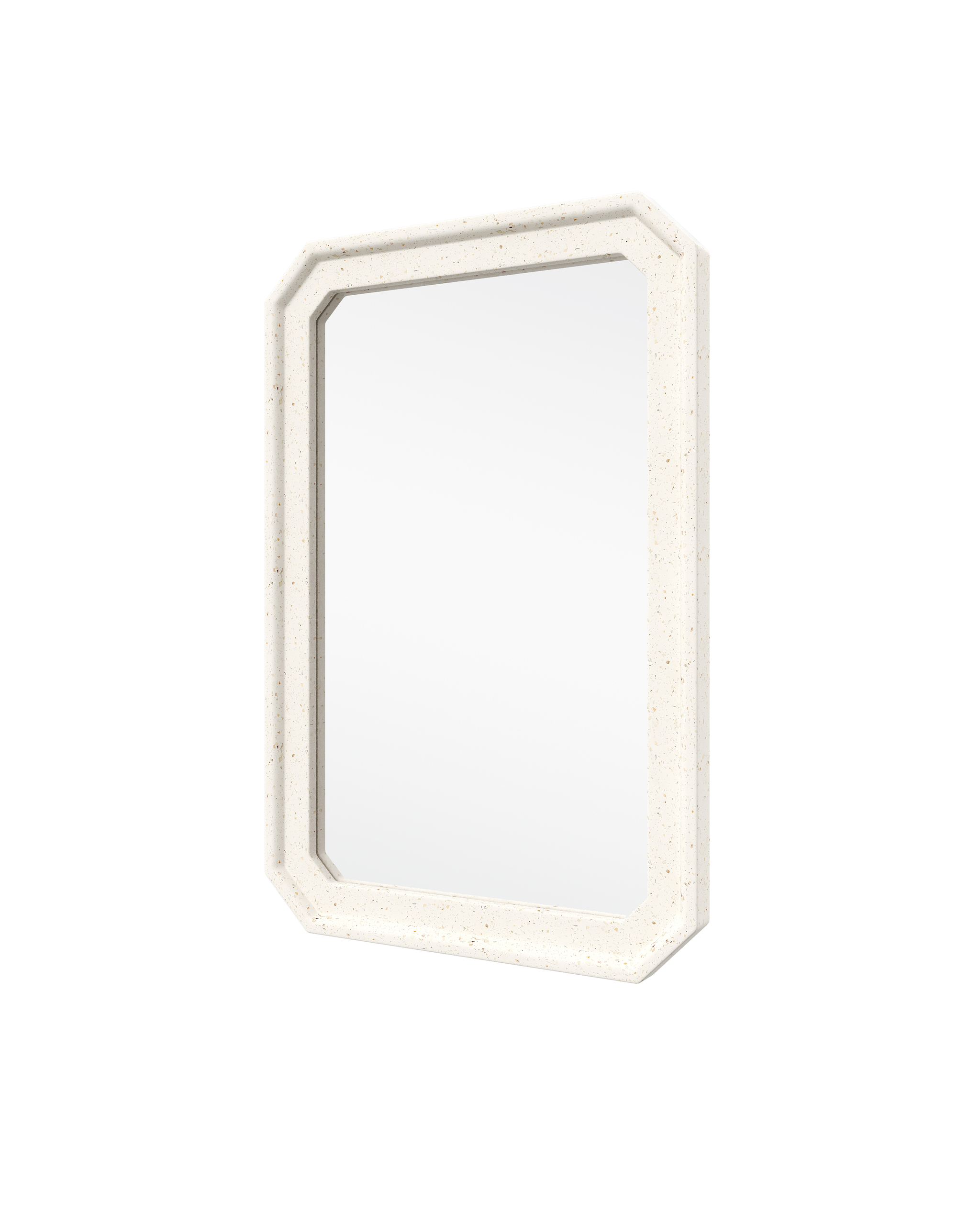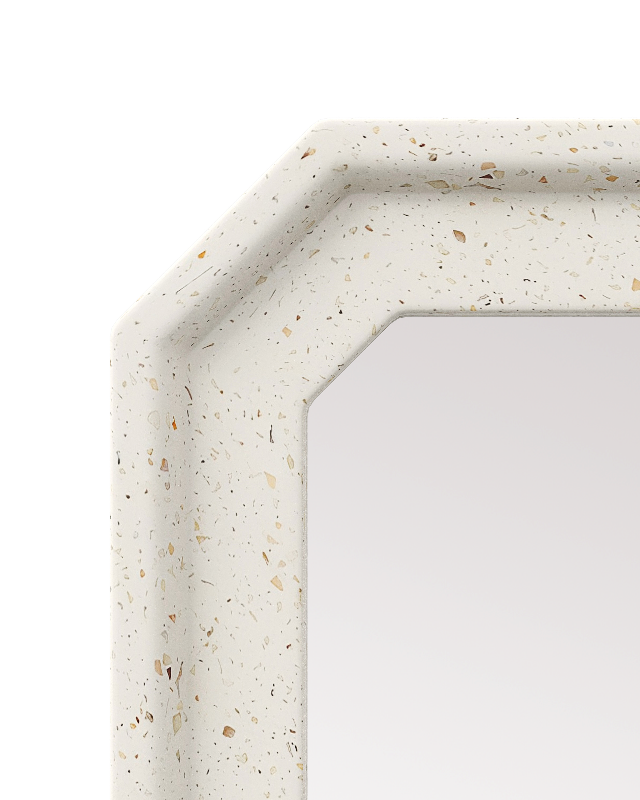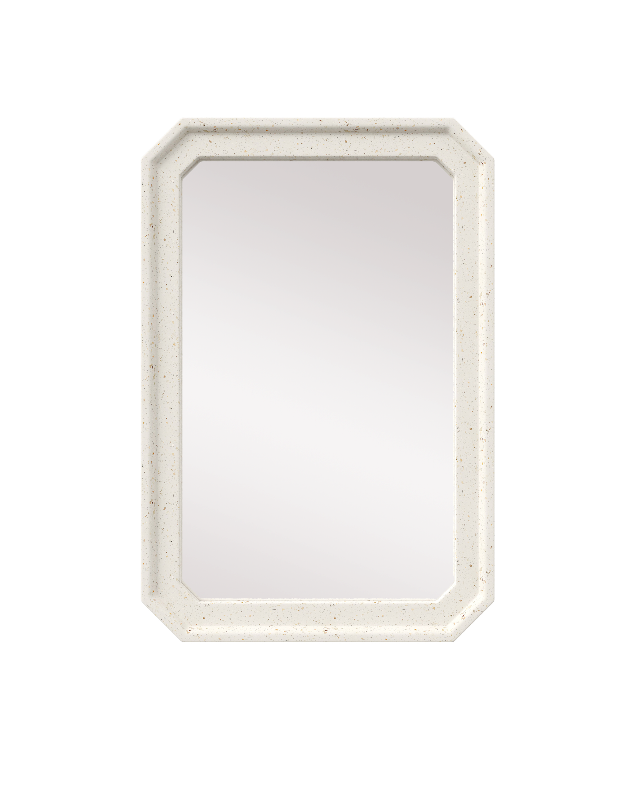 • The Carson Ivory Mirror combines modern durability with refined elegance, making it a standout piece for both indoor and covered outdoor spaces. Designed with a sturdy concrete frame, it features an ivory terrazzo finish sprinkled with tempered glass fibers that create soft amber and metallic flecks. Built to withstand covered outdoor conditions, this mirror will be just as fitting for patios as for entryways or living areas. The mirror, which is poured in one solid piece, measures 43 inches by 29 inches.
