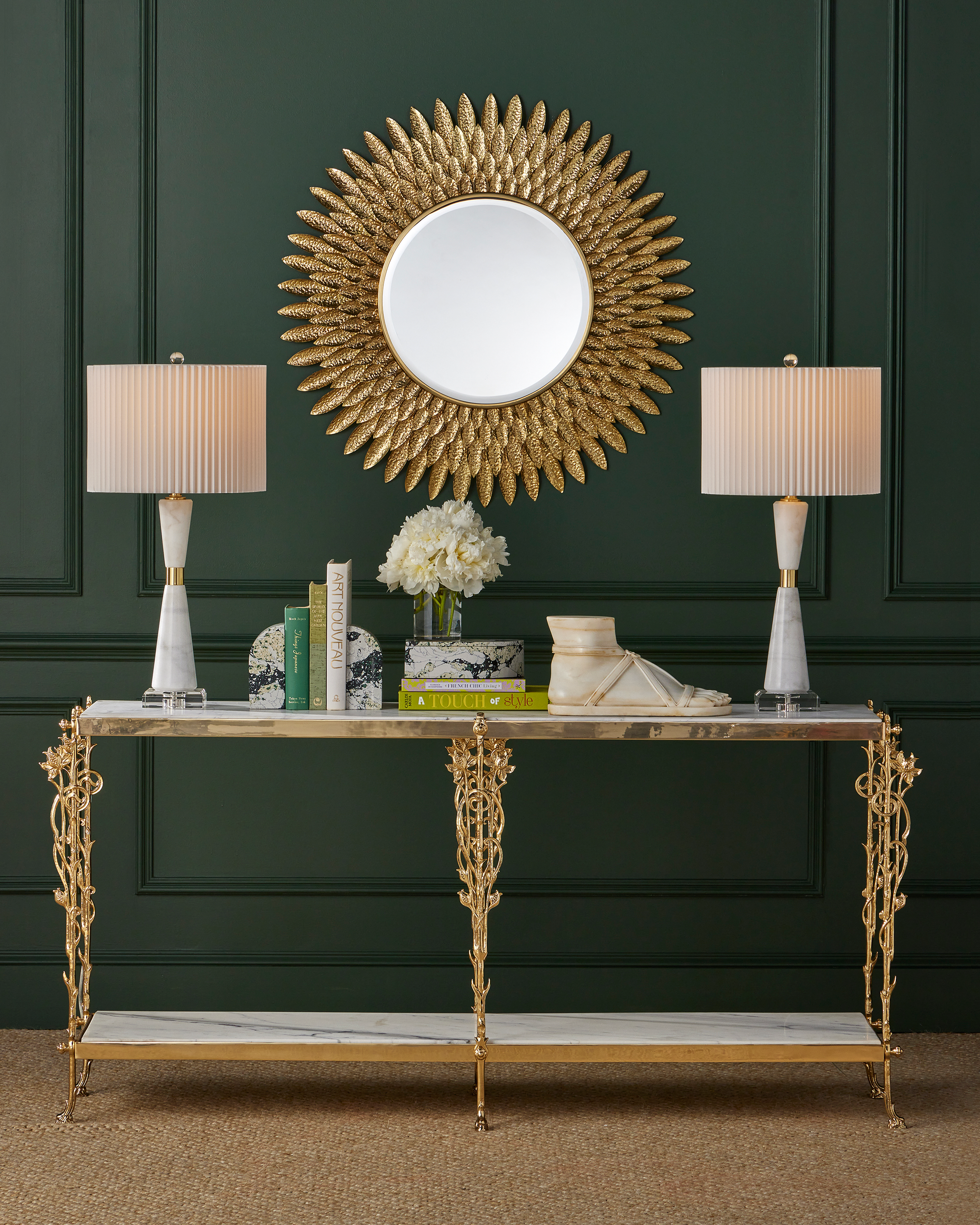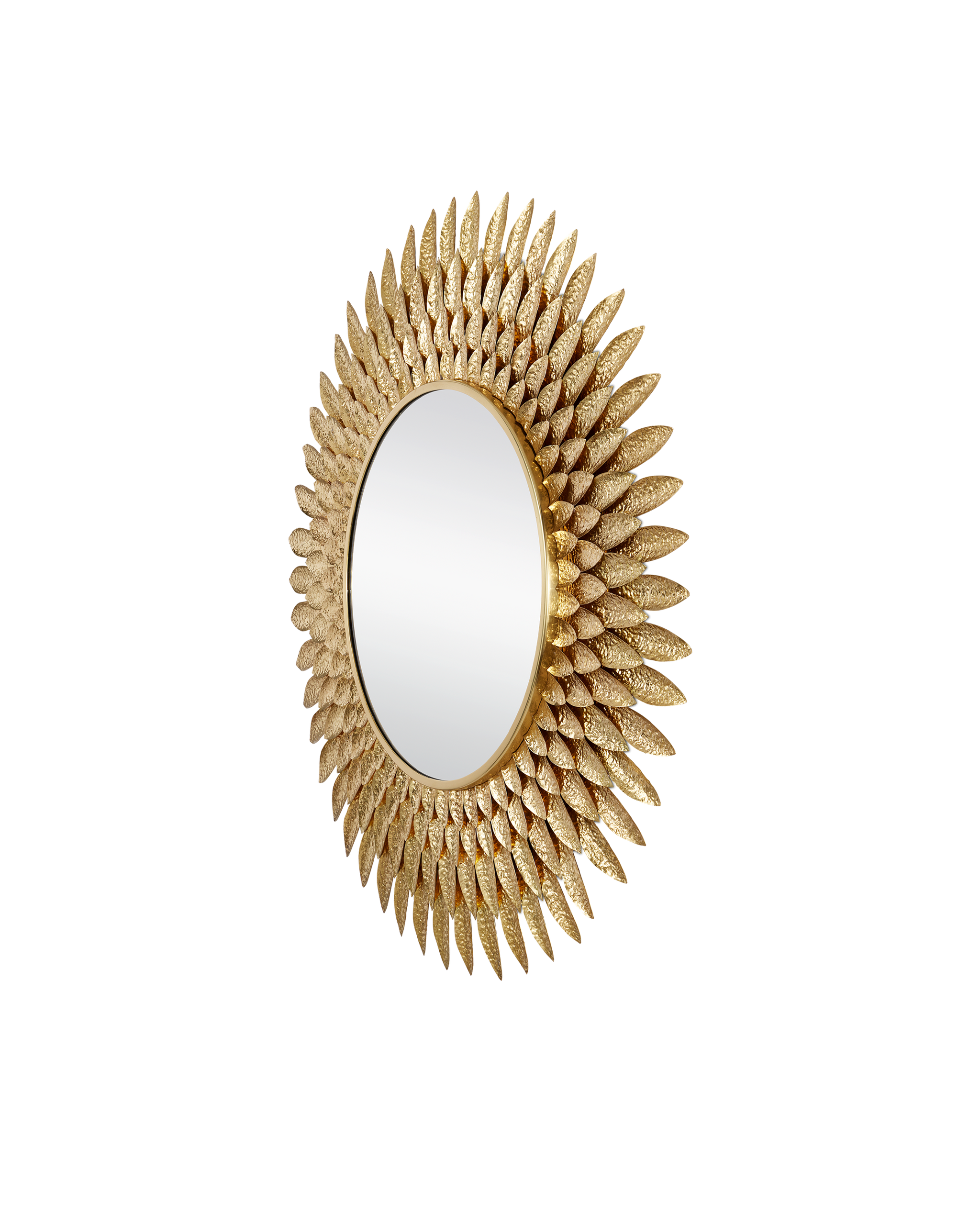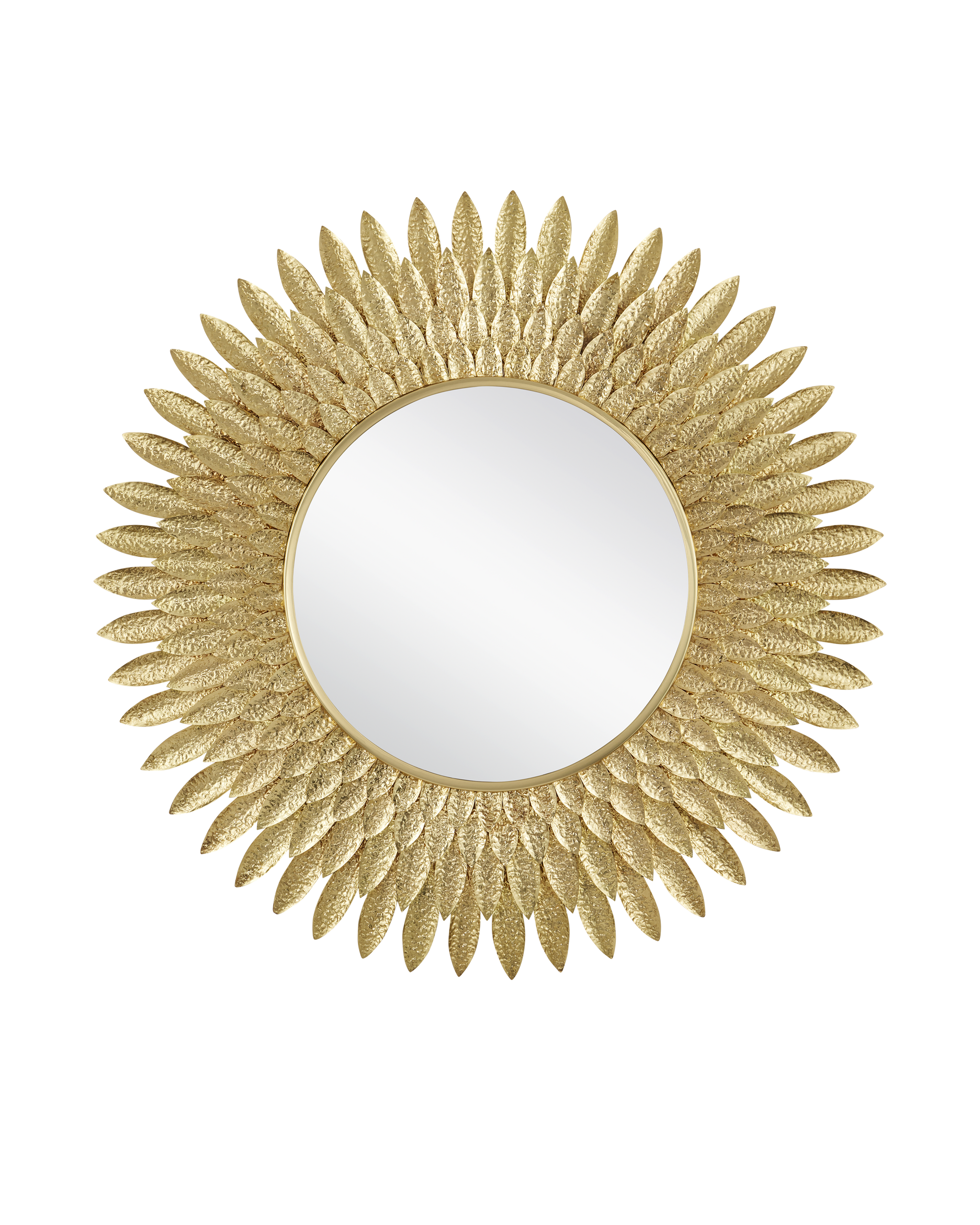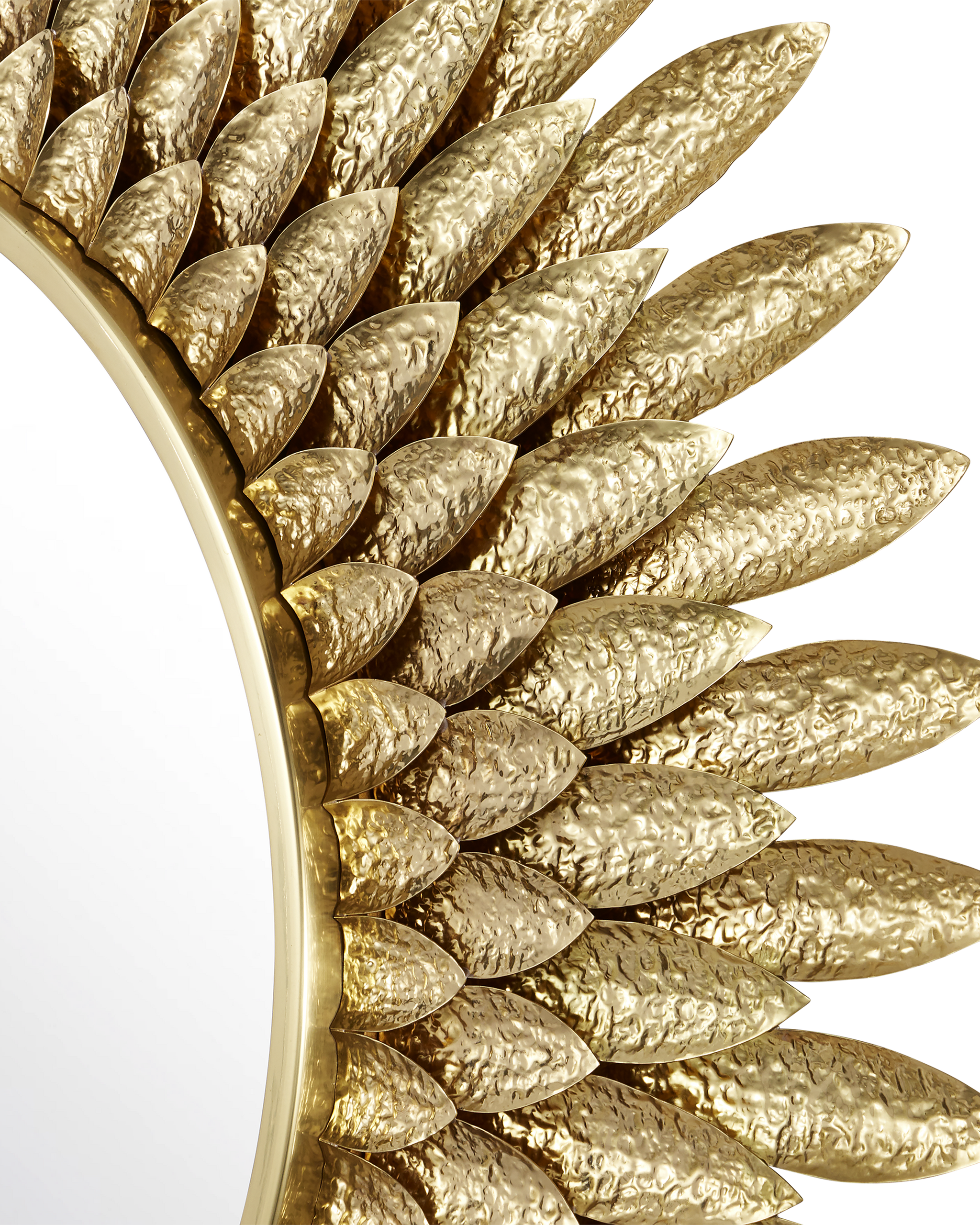 • A beautiful burst of brass feathers, the Plume Round Mirror is a remarkably artistic creation, with each of the hundreds of hand-cut and hand-hammered faux feathers affixed to the frame one after another by artisan hand. The rows graduate from largest to the smallest as they move toward the mirrored glass.