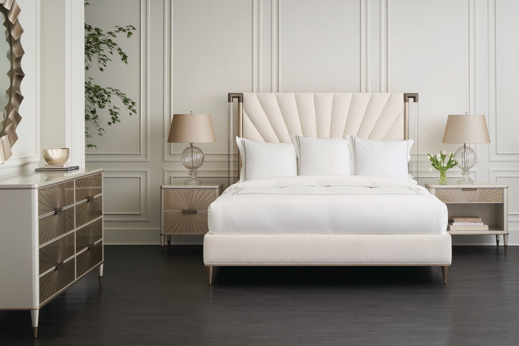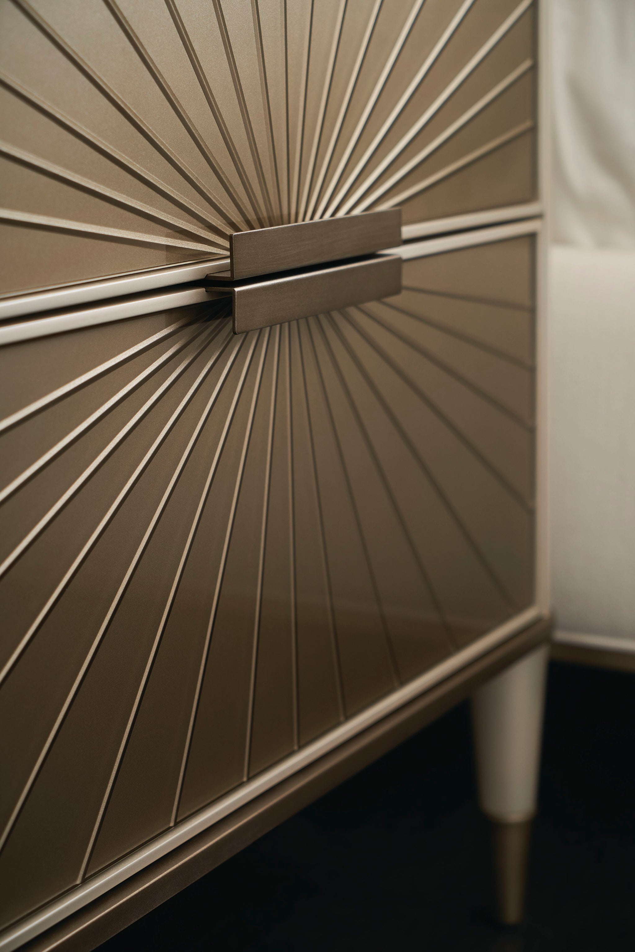 • Warmly reflective, the Valentina small nightstand makes an alluring bedside companion in a shimmering mix of materials and finishes. Its mirror-like drawer fronts are created from v-groove cut, back-painted glass to create a striking radial pattern. A silkscreened pinstripe detail frames the top and adds a touch of luxe, complemented by tapered legs dressed in Bronze Gold metal ferrules. A USB port along the back allows for discreetly charging media.