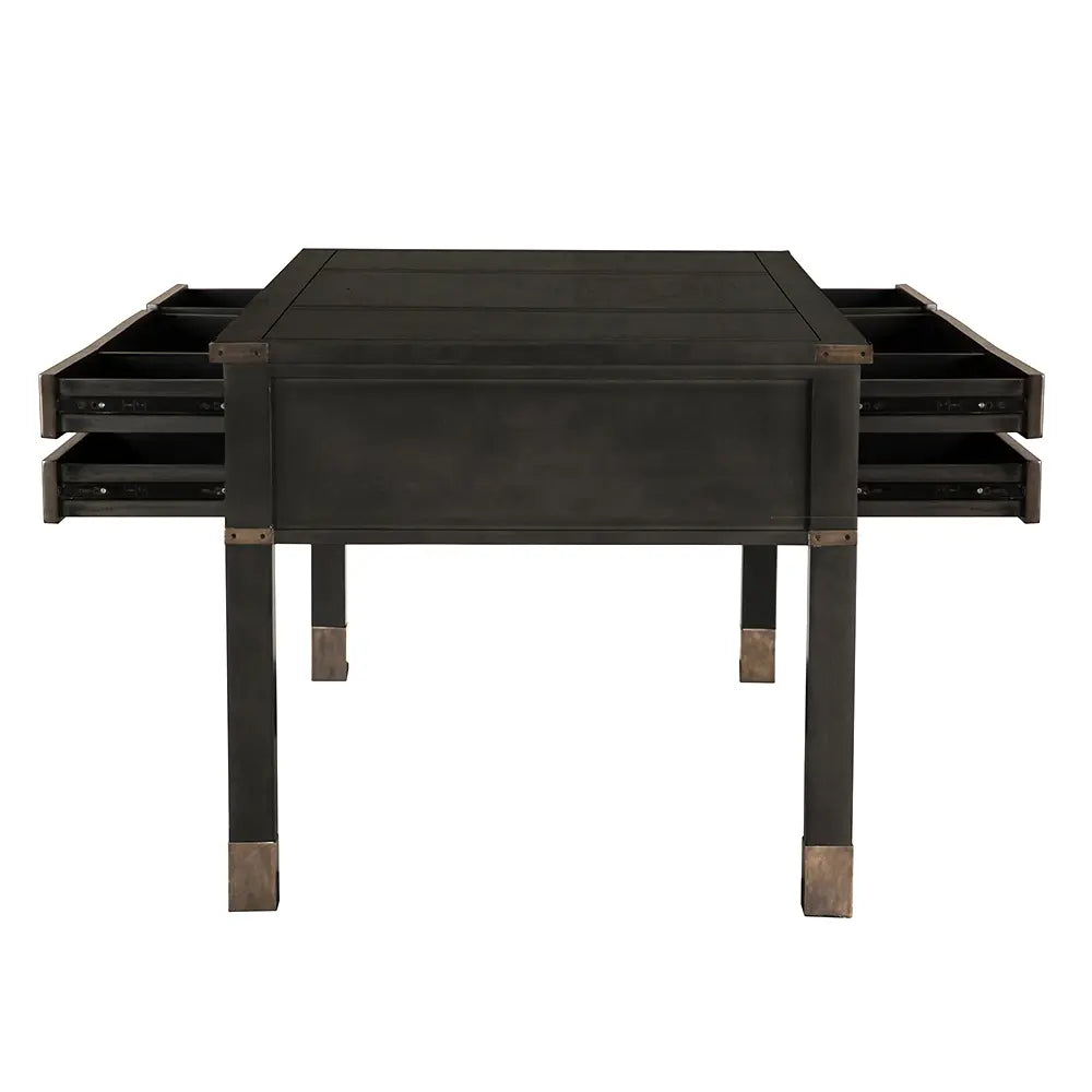 • The Campaign Partner Desk brings classic craftsmanship into the modern workspace. Built from mahogany and finished in a soft Pale tone, its surface feels warm, refined, and ready to be lived in. Brass pulls, side plates, and base legs lend a grounded elegance, giving the desk its signature heirloom appeal.
