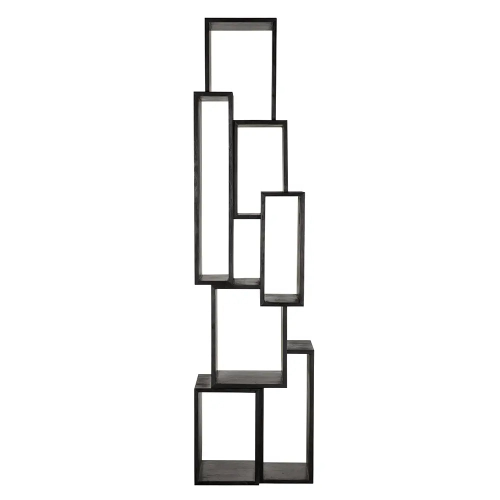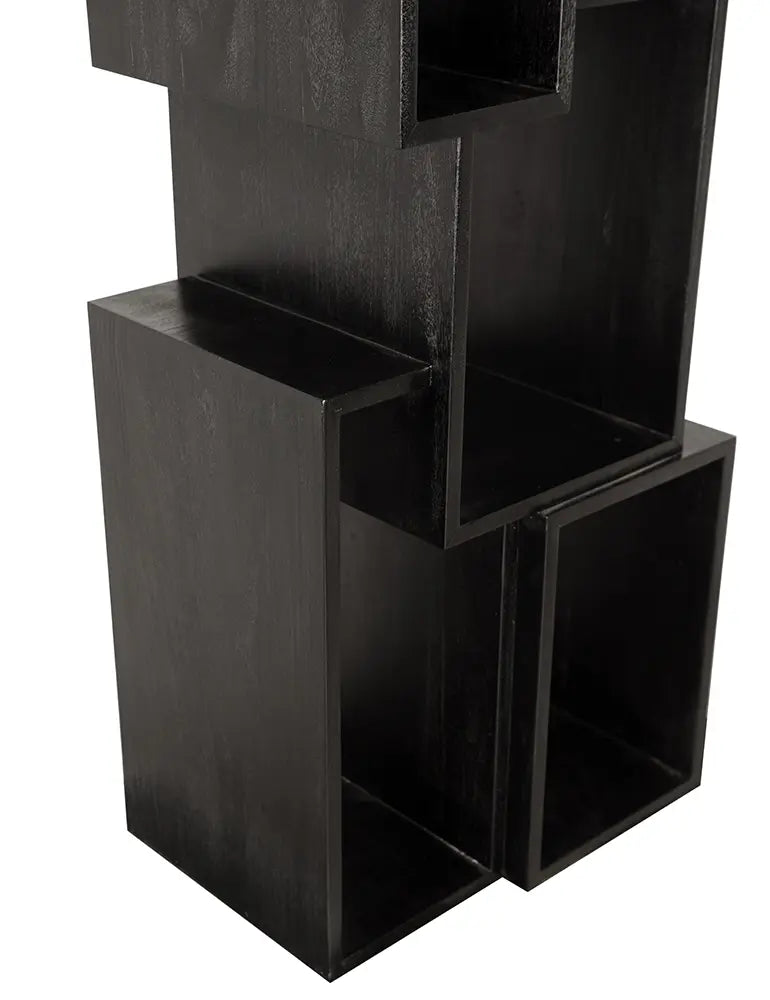 • This sculptural Charcoal Black shelving features an asymmetrical arrangement of open rectangular compartments. Its architectural form offers a dynamic visual while maintaining functionality.