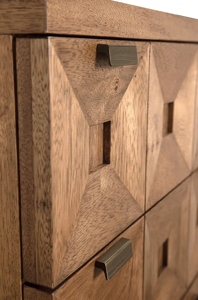 • This two-drawer cabinet in Dark Walnut features six faceted, pyramidal drawer fronts that add sculptural depth and showcase dynamic wood grain. Minimal brass pulls and a defined base provide a grounded yet refined appearance, blending artisanal details with a clean, architectural style.