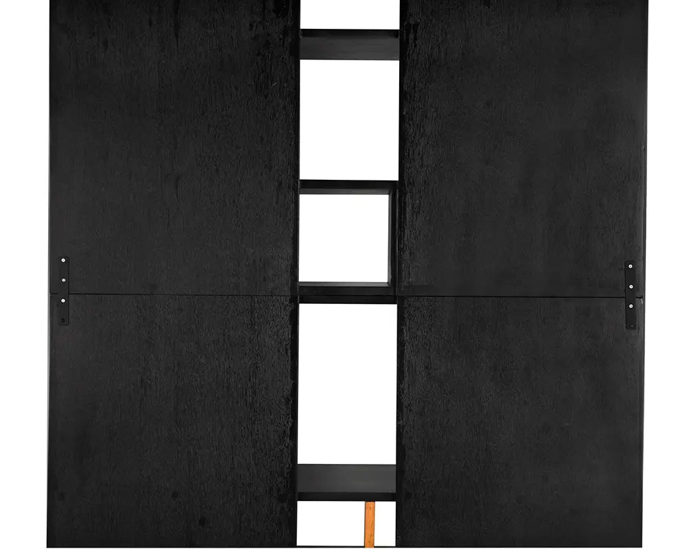 • A sculptural shelving unit featuring alternating hand-rubbed black horizontal planes and warm teak vertical dividers, creating rhythmic asymmetry, substantial visual depth, and flexible, compartmentalized display zones.