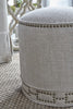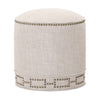 • Add additional seating or serving space with this round Marlow Ottoman by Essentials For Living. It is fully upholstered with gorgeous linen and polyester blend material. The material is performance bisque linen, making it easy to clean and maintain. It is accented with piping and gold nail head trim in a decorative design. This ottoman is a mix of farmhouse style and country chic with its muted tones and nail head trimming. You can easily slide it under other furniture, store away, or leave out as accent seating. This ottoman is ideal for bedrooms, living rooms, entryways and anywhere additional seating is required. Its small and compact size of 18.5" wide, 18.5" deep, and 20" high make it ideal for small spaces. Complete any living space with this useful and beautiful ottoman.