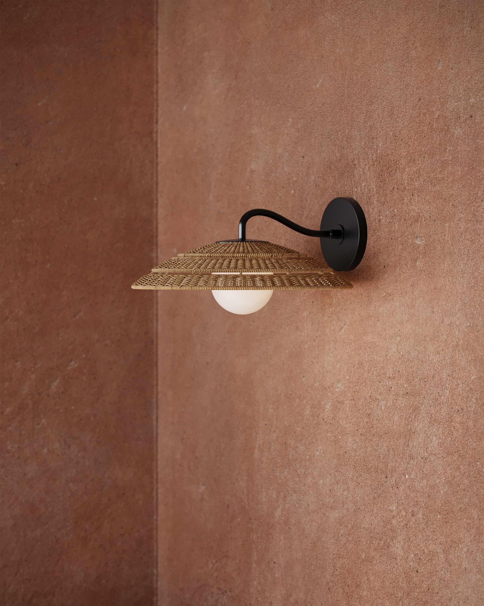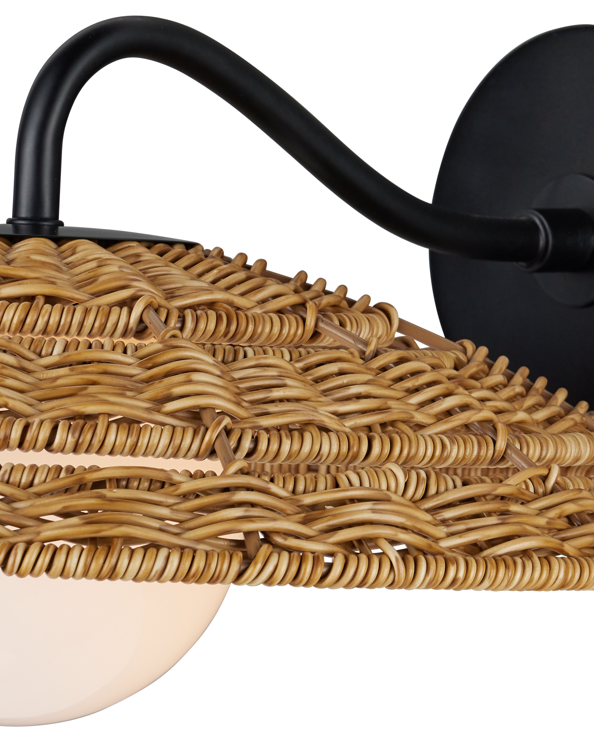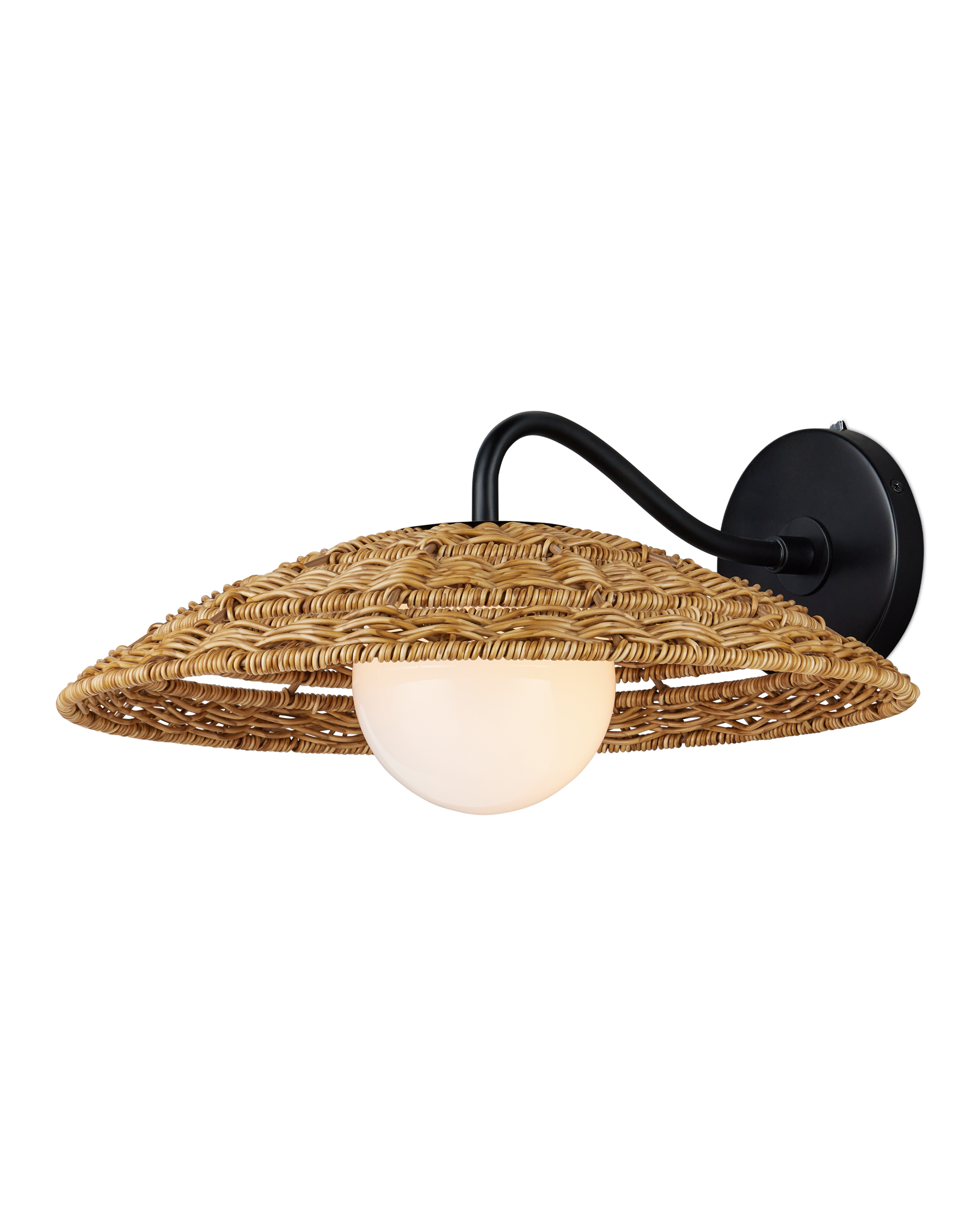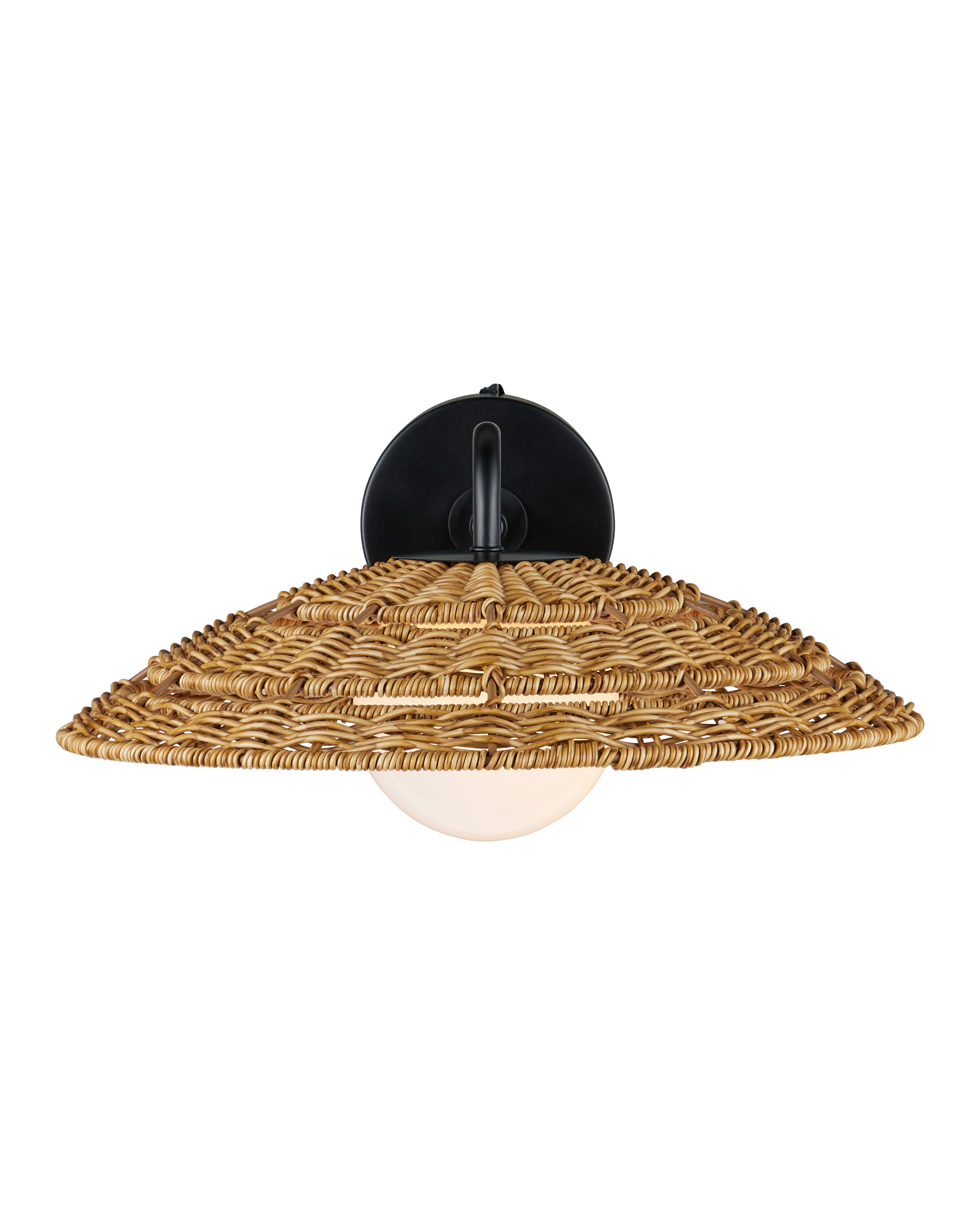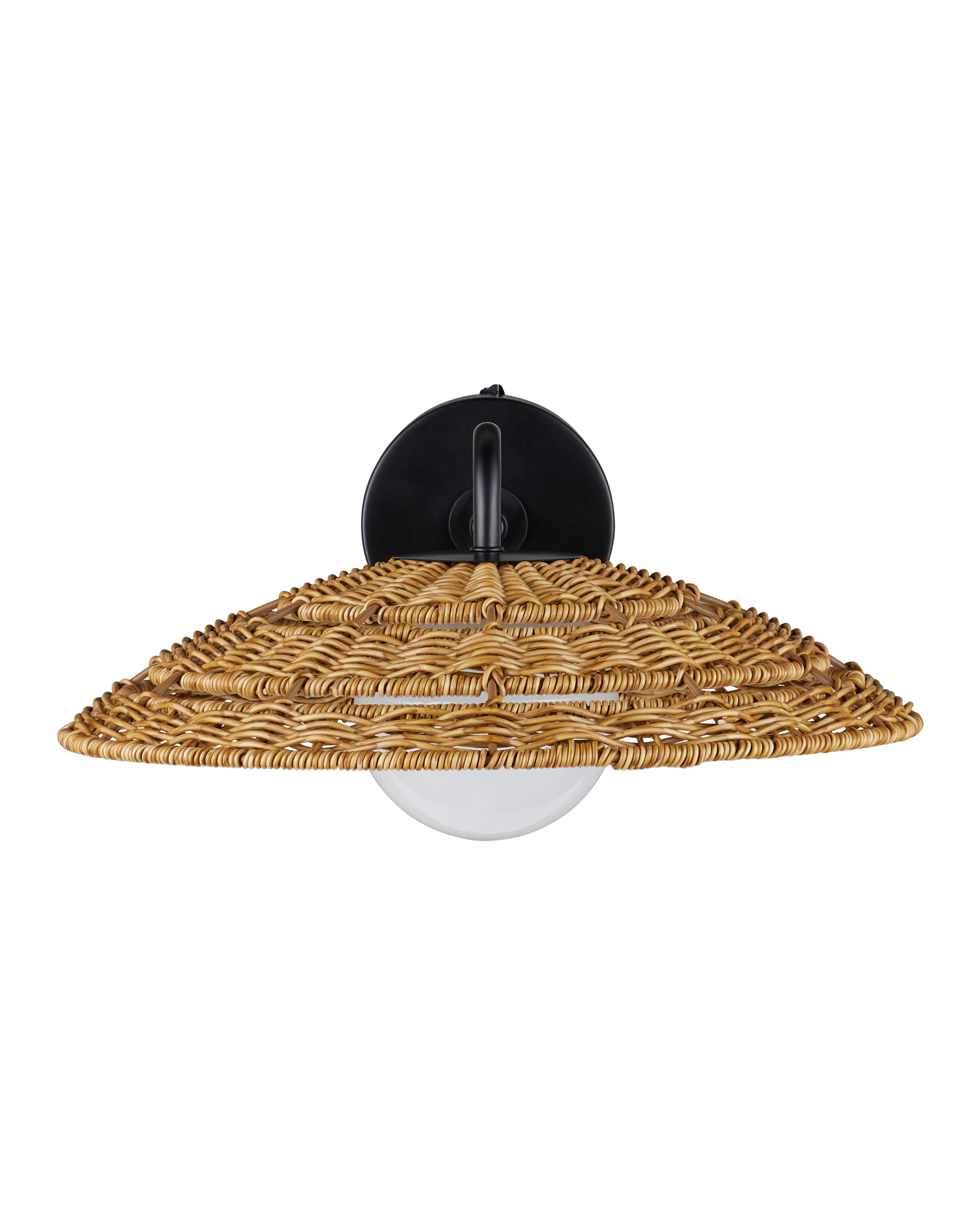 • The Barbary Outdoor Wall Sconce has an inverted bowl-shaped shade made of all-weather wicker that can easily withstand the elements, as will the metal backplate and gooseneck arm in a black powder-coated finish. The uniform weave on the tan wall sconce is painstakingly achieved by hand. Another sophisticated detail is how the milk-glass globe on the one-light sconce glows through the circular cut out. The Barbary is wet location-tested so it is ideal for illuminating patios and porches.