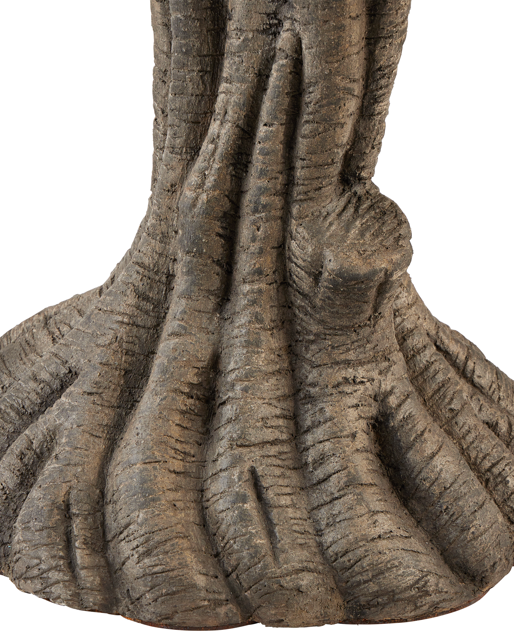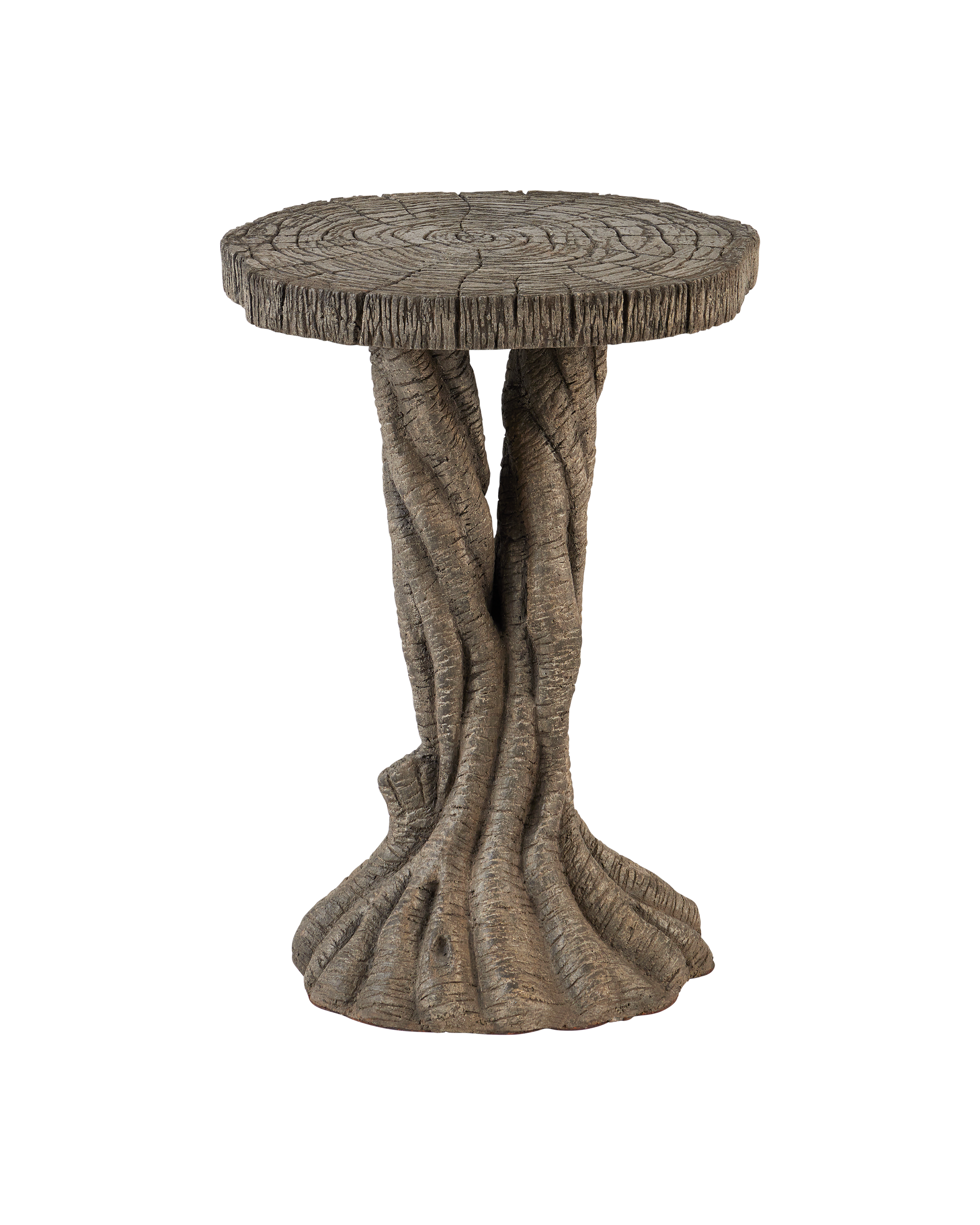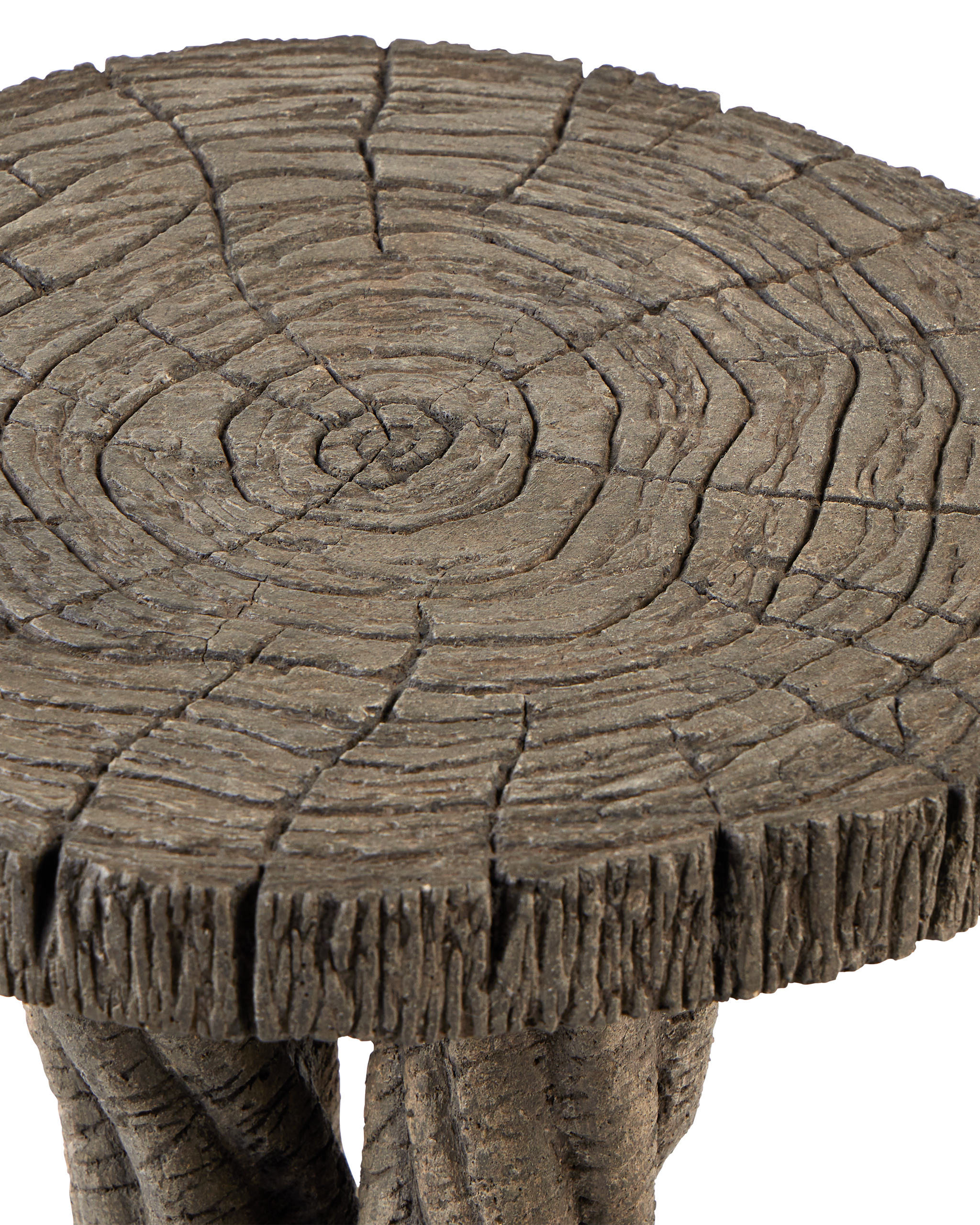 • In the Currey & Company fashion of producing exemplary designs in faux bois, the Dunmore Accent Table has a striated texture that makes it feel so convincingly like wood, it lives up to its centuries-old designation. Furthering the natural feel is the Charbon de Bois finish applied to the entire piece, and the top, which is formed to look like it has the life rings of a real tree. The way the root-like formations on the base twist is a graceful element to the design.