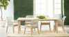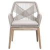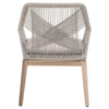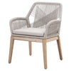 Style your backyard or patio with a touch of coastal design using the Loom Outdoor Arm Chair by Essentials For Living. It measures 24" wide, 26" deep, and 33" high, with a seat height of 19"Â_x009d_. Constructed with a reinforced aluminum frame and solid gray teak legs, this dining chair is not only sturdy, but durable for outdoor use. A taupe and white polypropylene rope is tightly woven to create a unique loom design on the seat back, while the gray teak legs have a beautiful wood grain finish. It is paired with a removable performance pumice olefin all-weather seat cushion. The cushion and chair should be stored away in extreme weather conditions. This dining arm chair provides comfort with style and will be the perfect addition to any outdoor space.