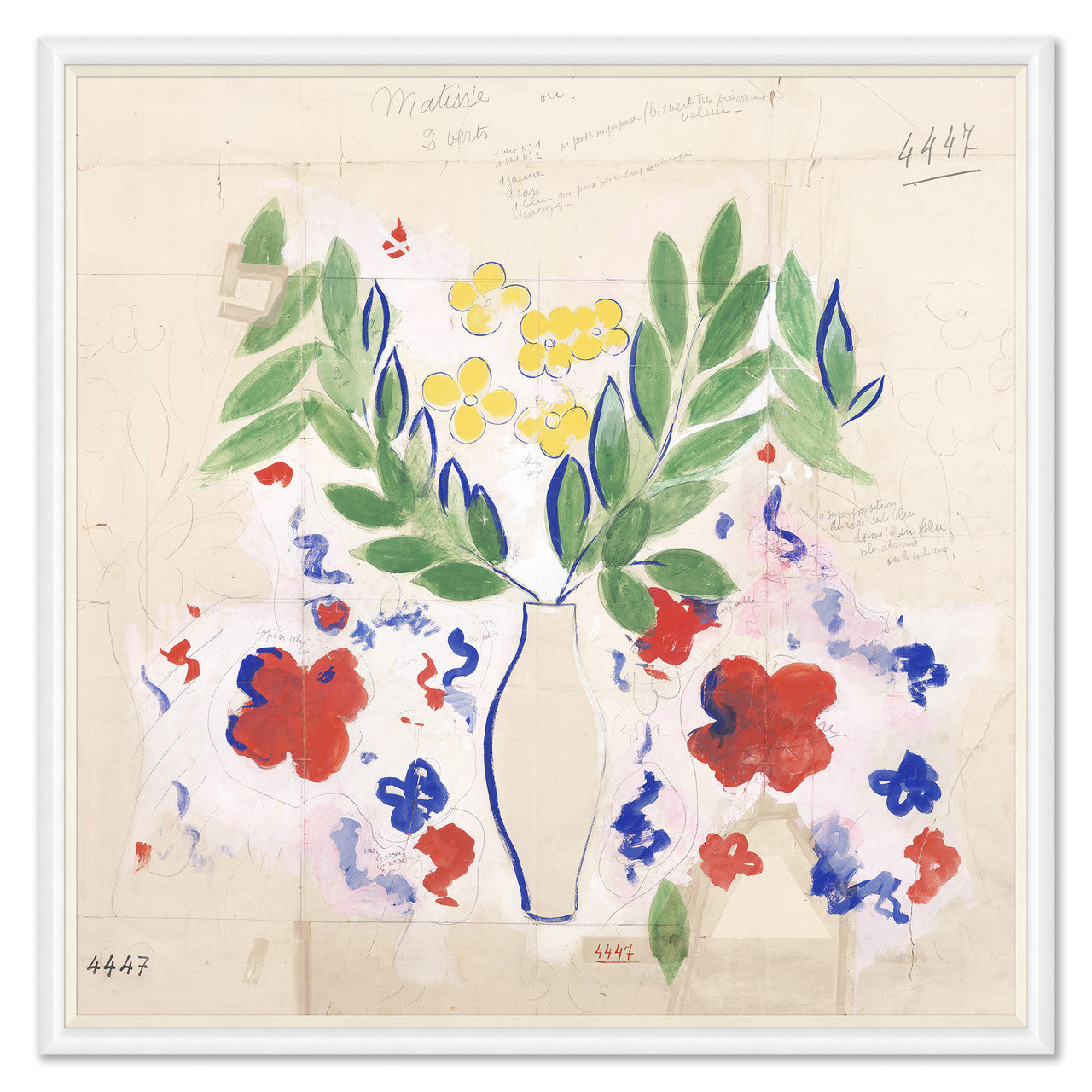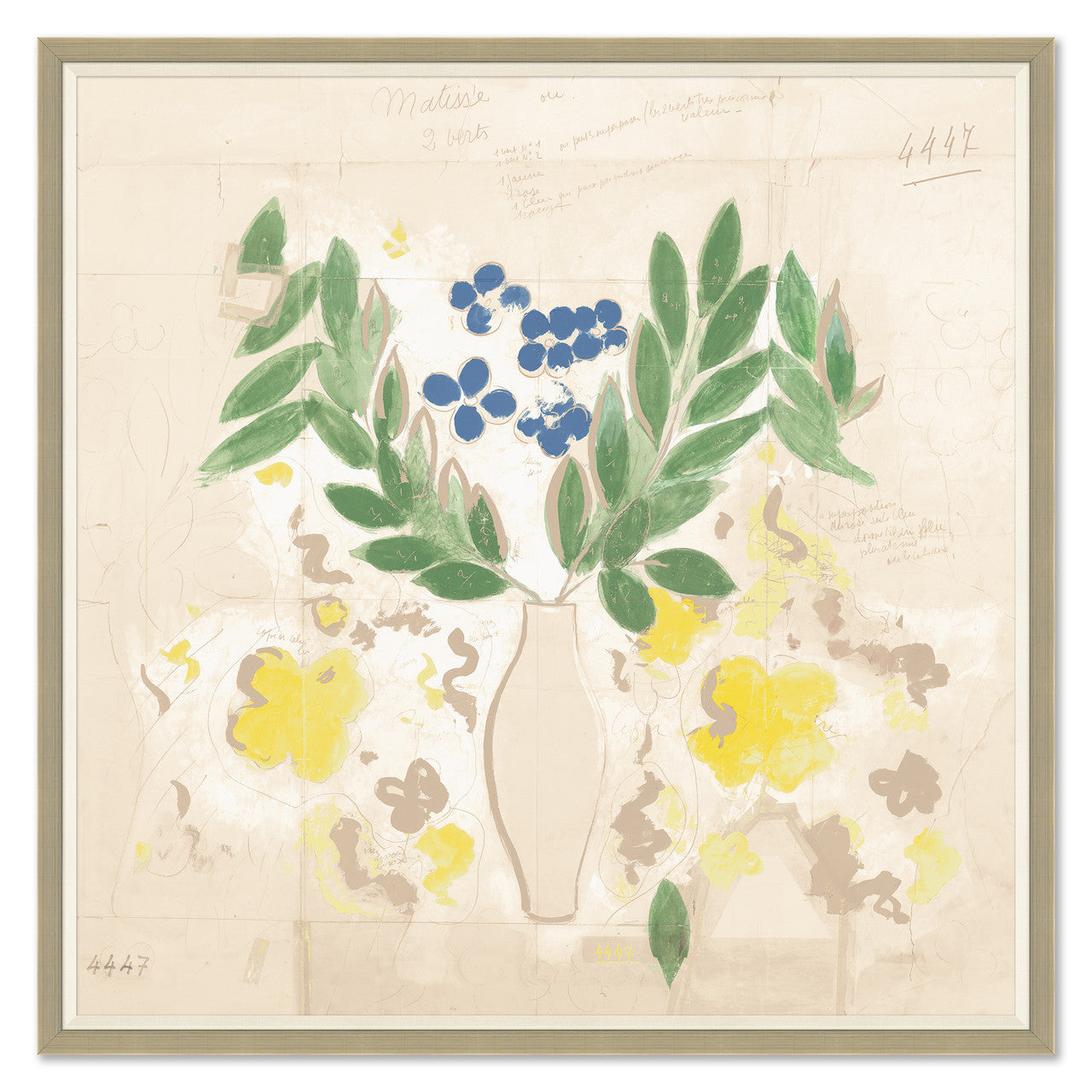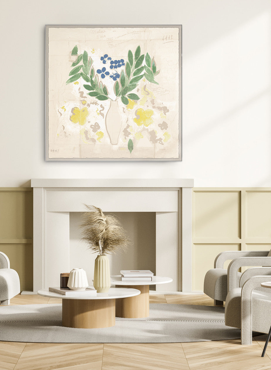 The Matisse I or II by Paule Marrot is a vibrant, modern floral that instantly brings life and color to any space. Featuring a beautifully styled vase overflowing with lush green leaves and bright notes of yellow and blue, this artwork feels both playful and refined. The crisp frame adds a clean, contemporary finish that lets the artwork shine while effortlessly elevating your walls.