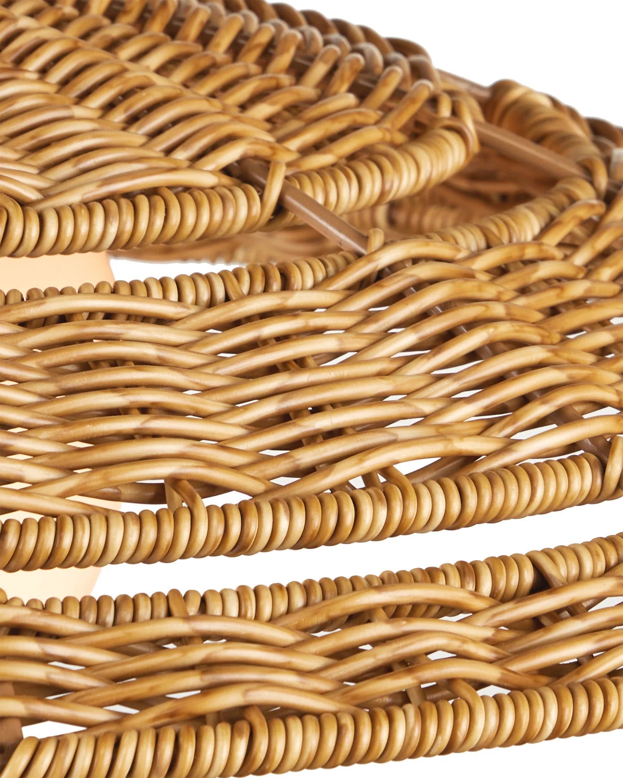 • The Barbary Small Outdoor Pendant features an inverted bowl-shaped shade woven by hand from durable, all-weather synthetic wicker in a warm tan tone. The tight, uniform weave showcases artisanal craftsmanship and surrounds a central circular cut-out that reveals a glowing milk-glass globe. Suspended from a black powder-coated rod, this one-light pendant is wet-location tested, making it a stylish and reliable choice for covered patios, porches, or outdoor entryways. Adjustable from 12.5" to 54.5" with use of included chain/rod kit/cable. If your space calls for a longer drop, additional chain/rods/cable is available for purchase.