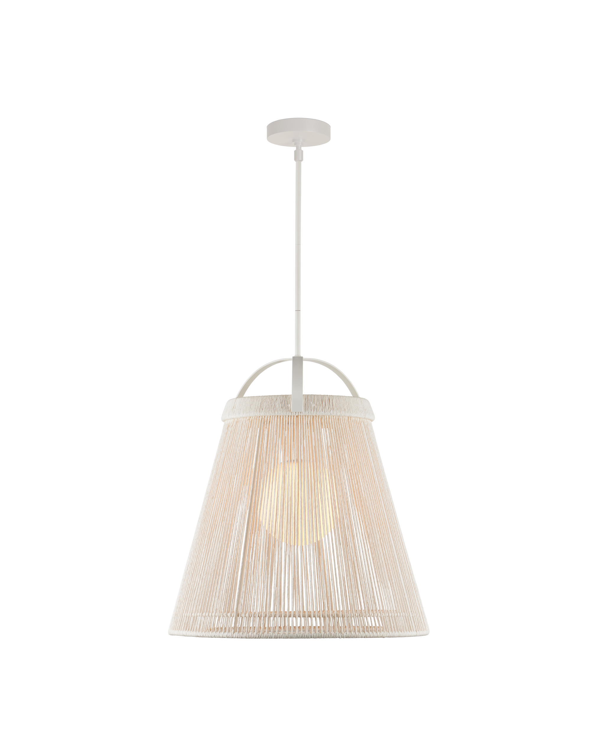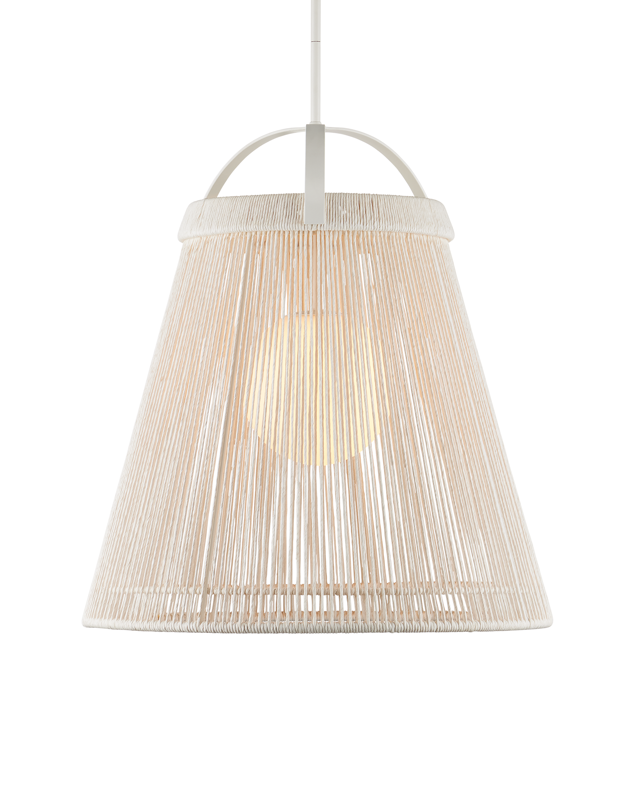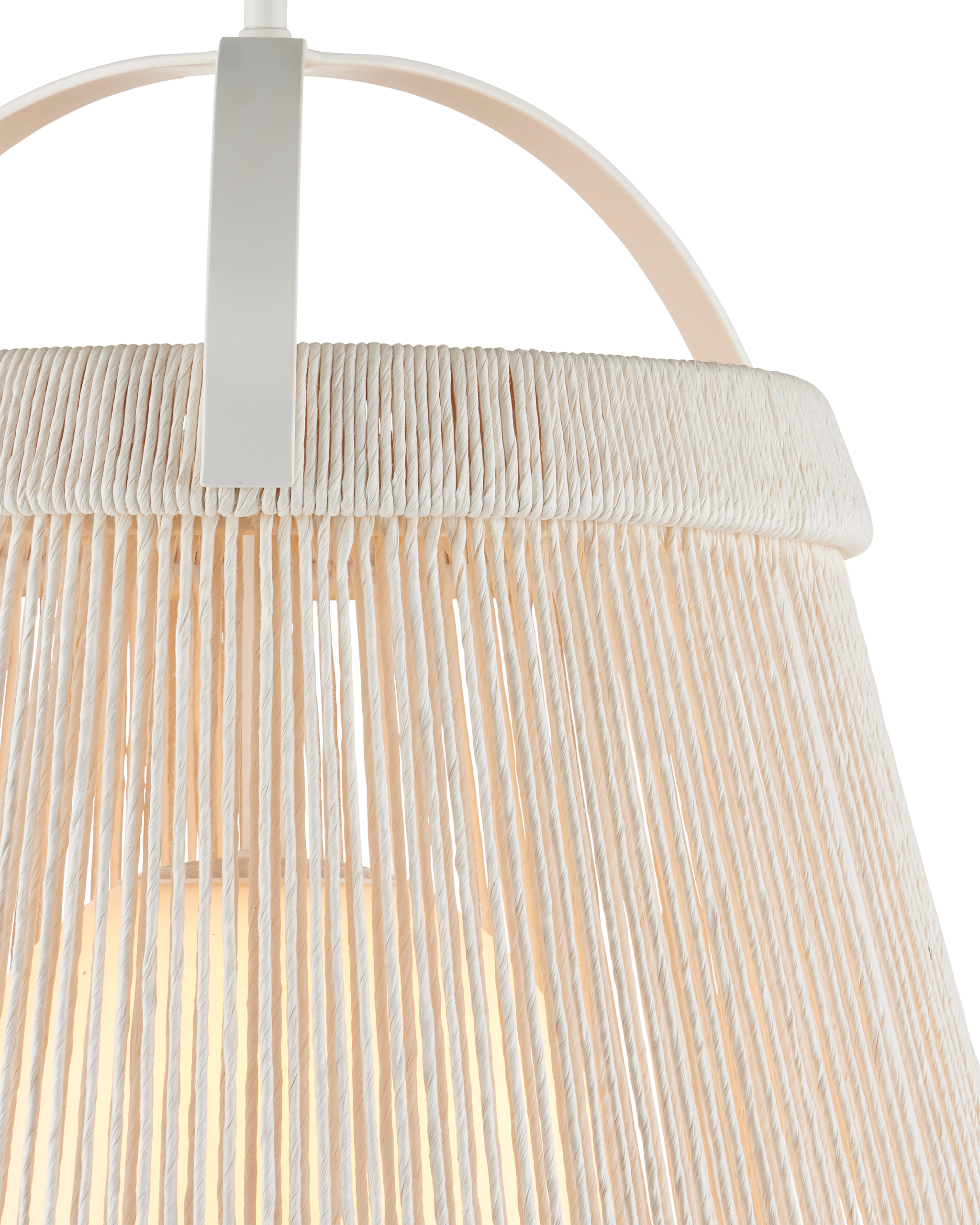 • The Parnell Medium White Pendant resembles a bell made of Kraft Paper twine that is painstakingly double-wrapped on both the outside and the inside of the wrought iron frame in a gesso white finish. A frosted white glass globe holds the one light, which is dimmable, within the textured shade that flares to 24 inches in diameter at the bottom. Adjustable from 32.75" to 74.75" with use of included chain/rod kit/cable. If your space calls for a longer drop, additional chain/rods/cable is available for purchase.