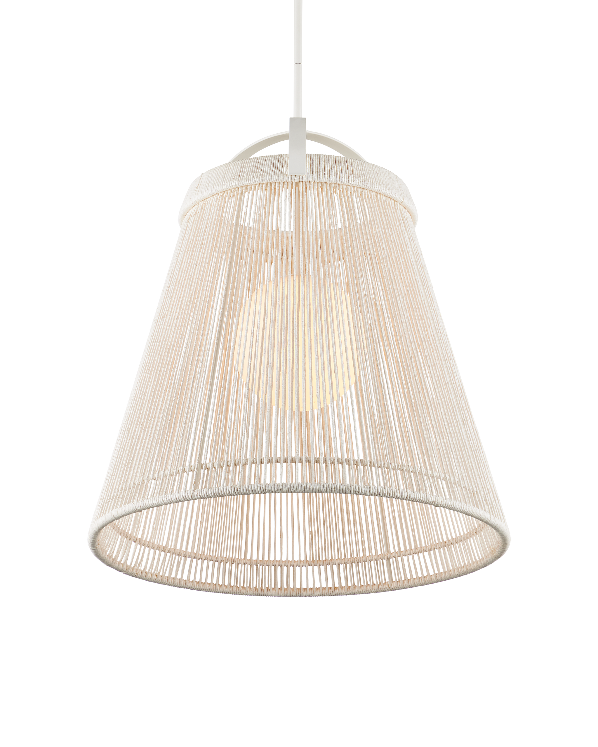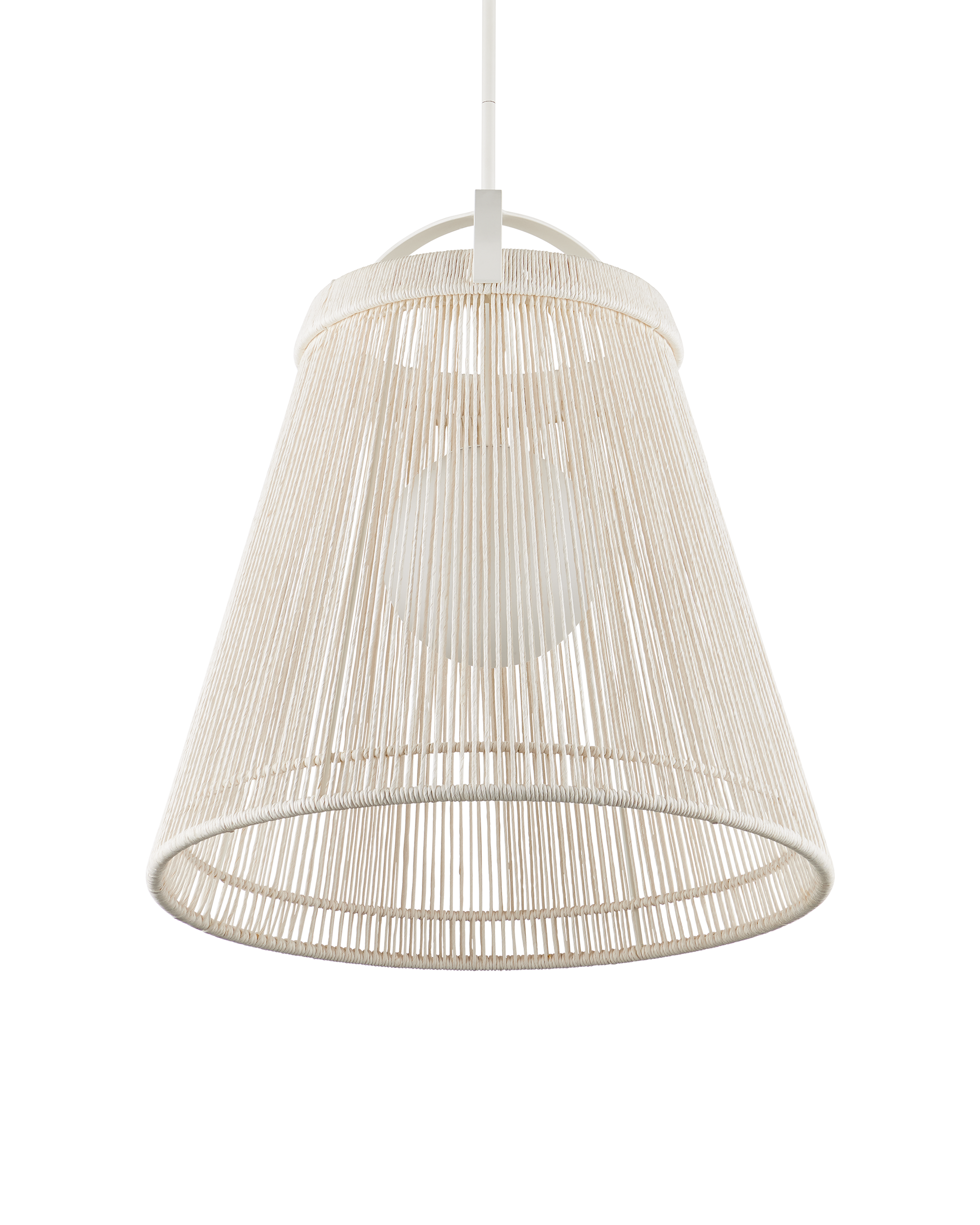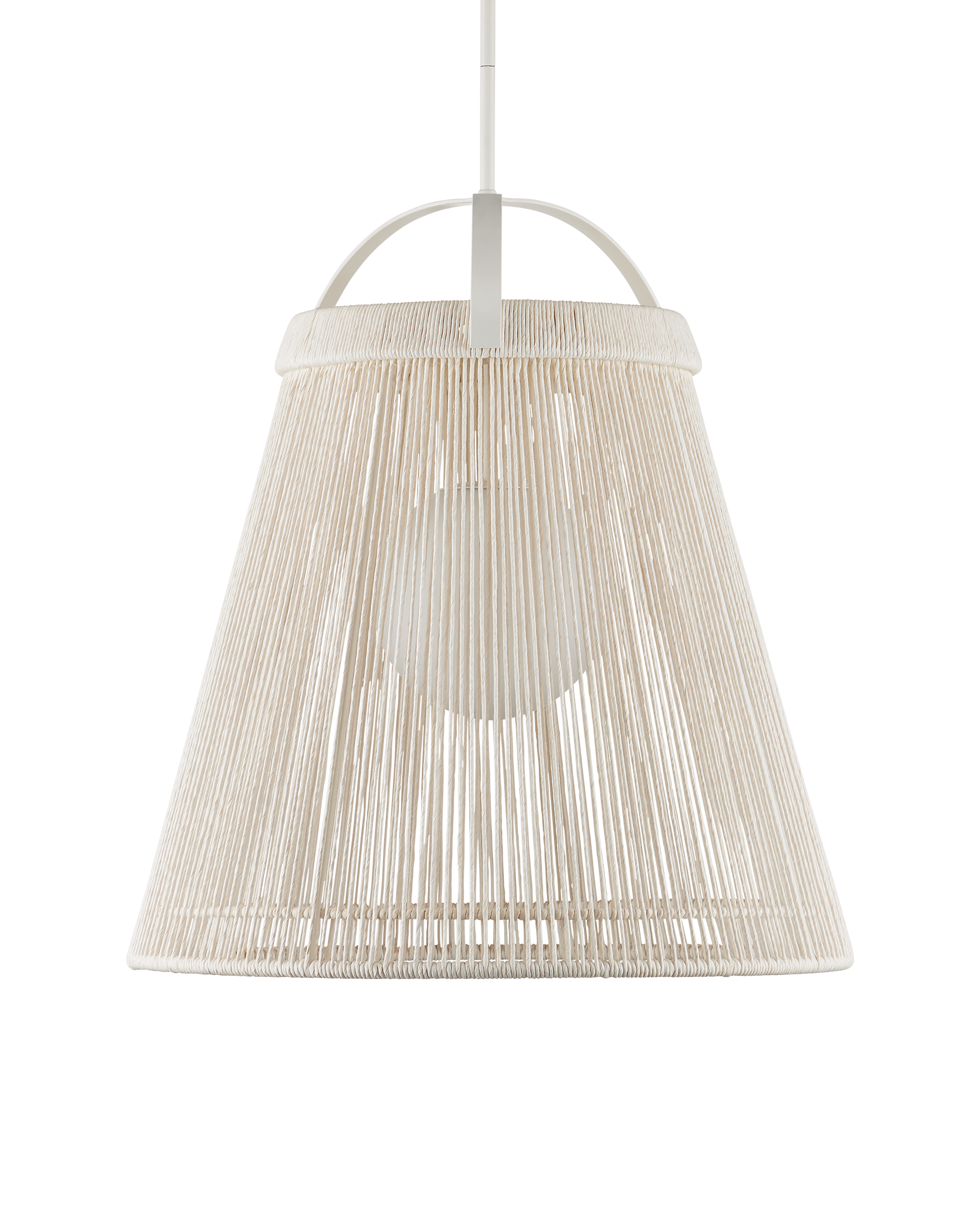 • The Parnell Medium White Pendant resembles a bell made of Kraft Paper twine that is painstakingly double-wrapped on both the outside and the inside of the wrought iron frame in a gesso white finish. A frosted white glass globe holds the one light, which is dimmable, within the textured shade that flares to 24 inches in diameter at the bottom. Adjustable from 32.75" to 74.75" with use of included chain/rod kit/cable. If your space calls for a longer drop, additional chain/rods/cable is available for purchase.