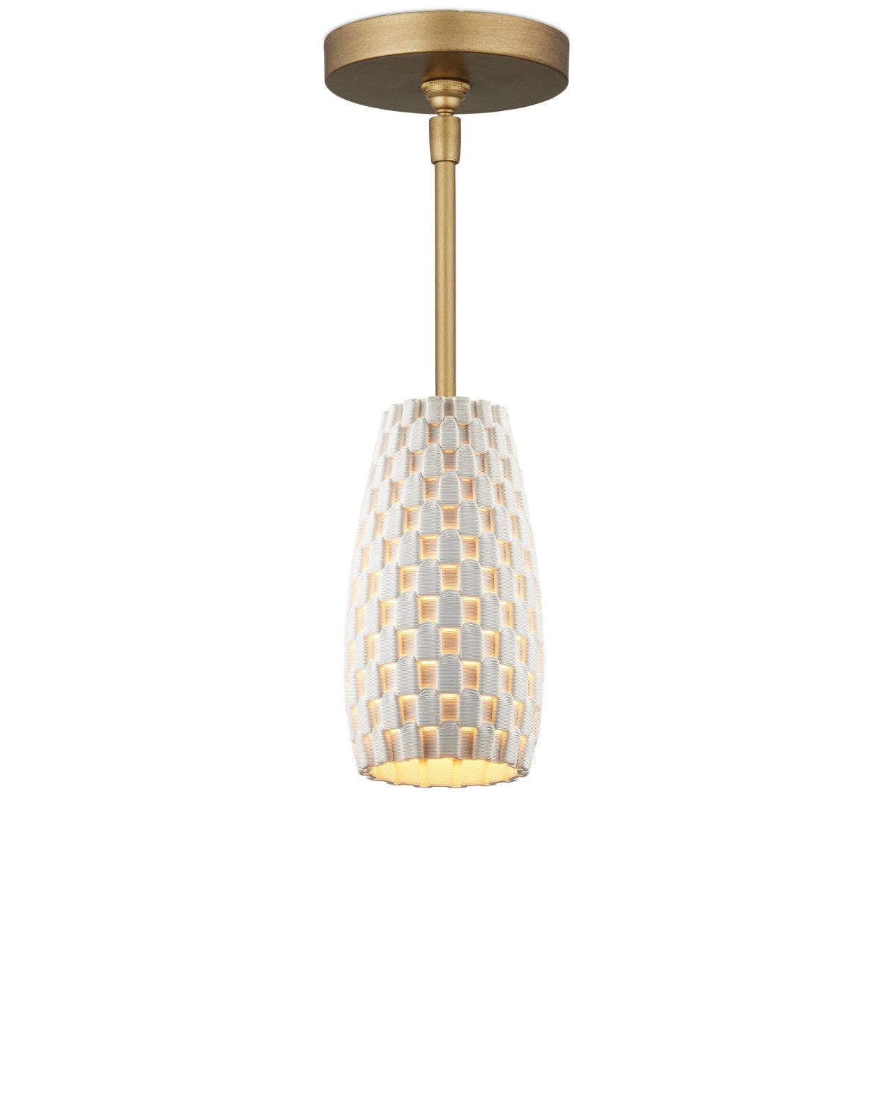 • The Currey & Company Tessitura Pendant has a shade made of white 3D-printed porcelain with a grid pattern and slits that diffuse light. Adjustable from 17" to 59" with use of included chain/rod kit/cable. If your space calls for a longer drop, additional chain/rods/cable is available for purchase.