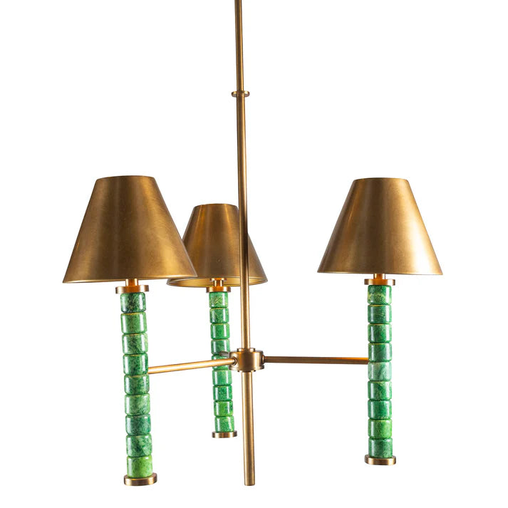 Natural green stone marble turnings are accented with aged brass finished metal hardware for this transitional pendant. The natural green stone has a patina and natural detail. Simple, casual and ever so timeless, this stone pendant is scaled for a dining table and may be hung in multiples of 2-3 pendants over the kitchen island.