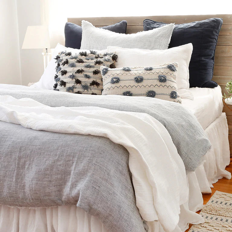 The handwoven Pippa pillow features black and blue tassels with ivory knots.