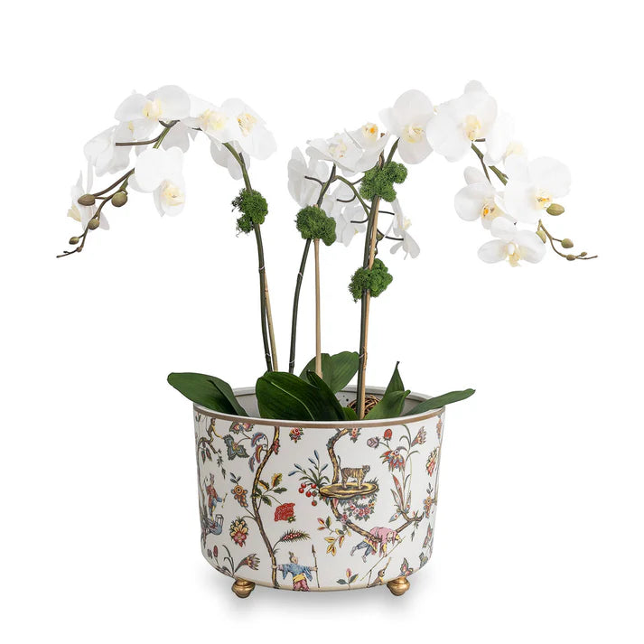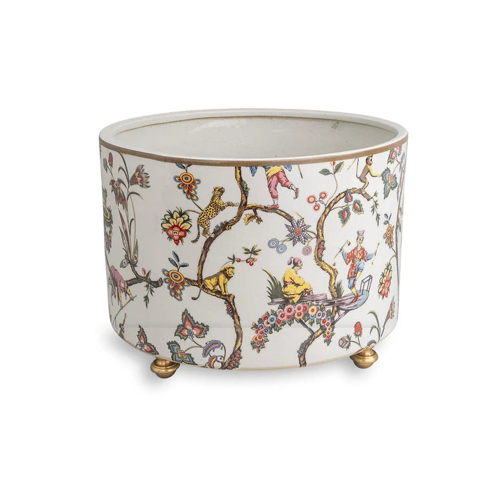 Chinoise Exotique is inspired from Scalamandre's iconic wallpaper and fabric pattern. A charming tableau of stylized blossoms, vines, figures and animals. The round planter is scaled for large plants or palms. It may also be used as a beverage container on the sideboard. We do suggest lining the interior bottom with bubble wrap, then adding ice to chill your champagne bottles.