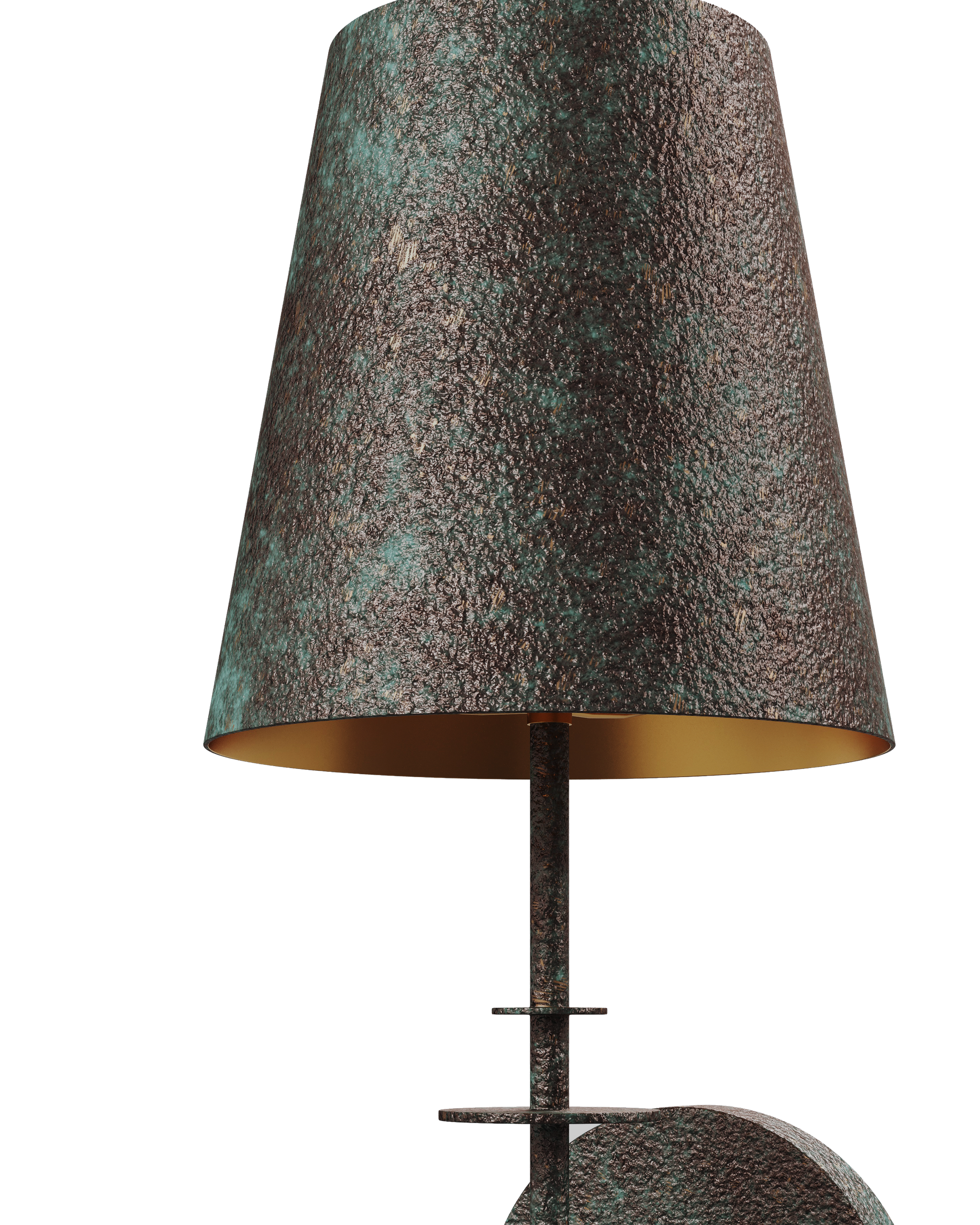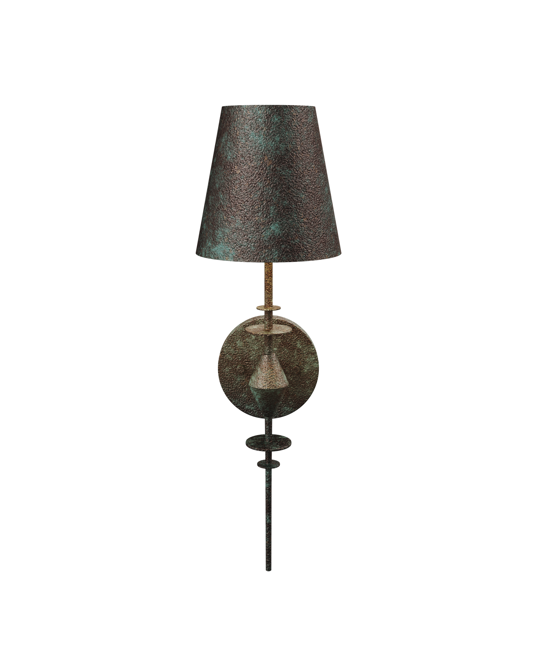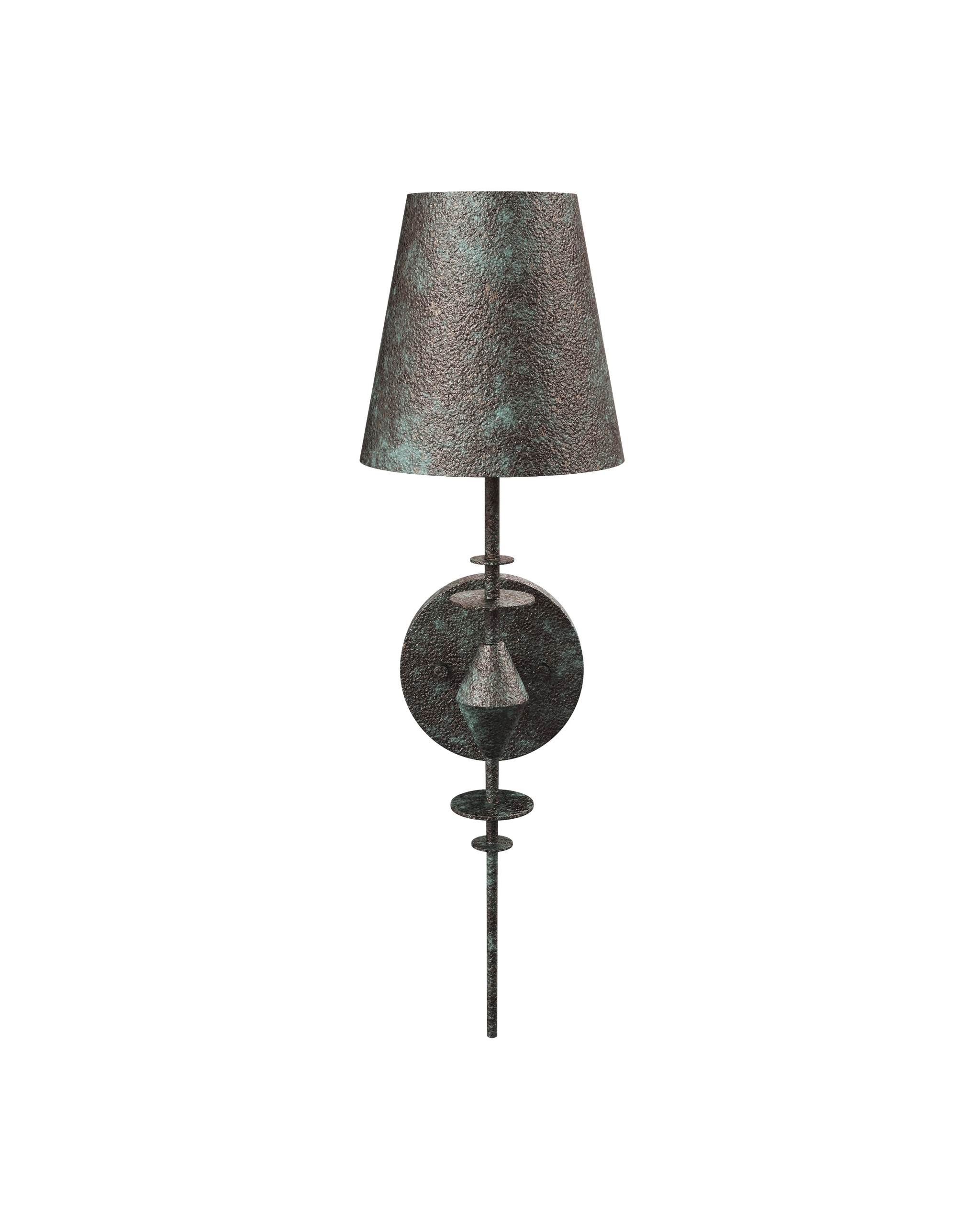 • The Anselm Wall Sconce is crafted from wrought iron in a richly toned verde bronze finish, which brings the fixture tremendous surface texture that has a handcrafted quality. Its slender stem is accented with geometric shapes, adding architectural flair. The coordinating textured shade echoes the finish, creating a cohesive look. The one-light sconce, which is dimmable, will introduce depth and character to hallways, entryways, or accent walls.
