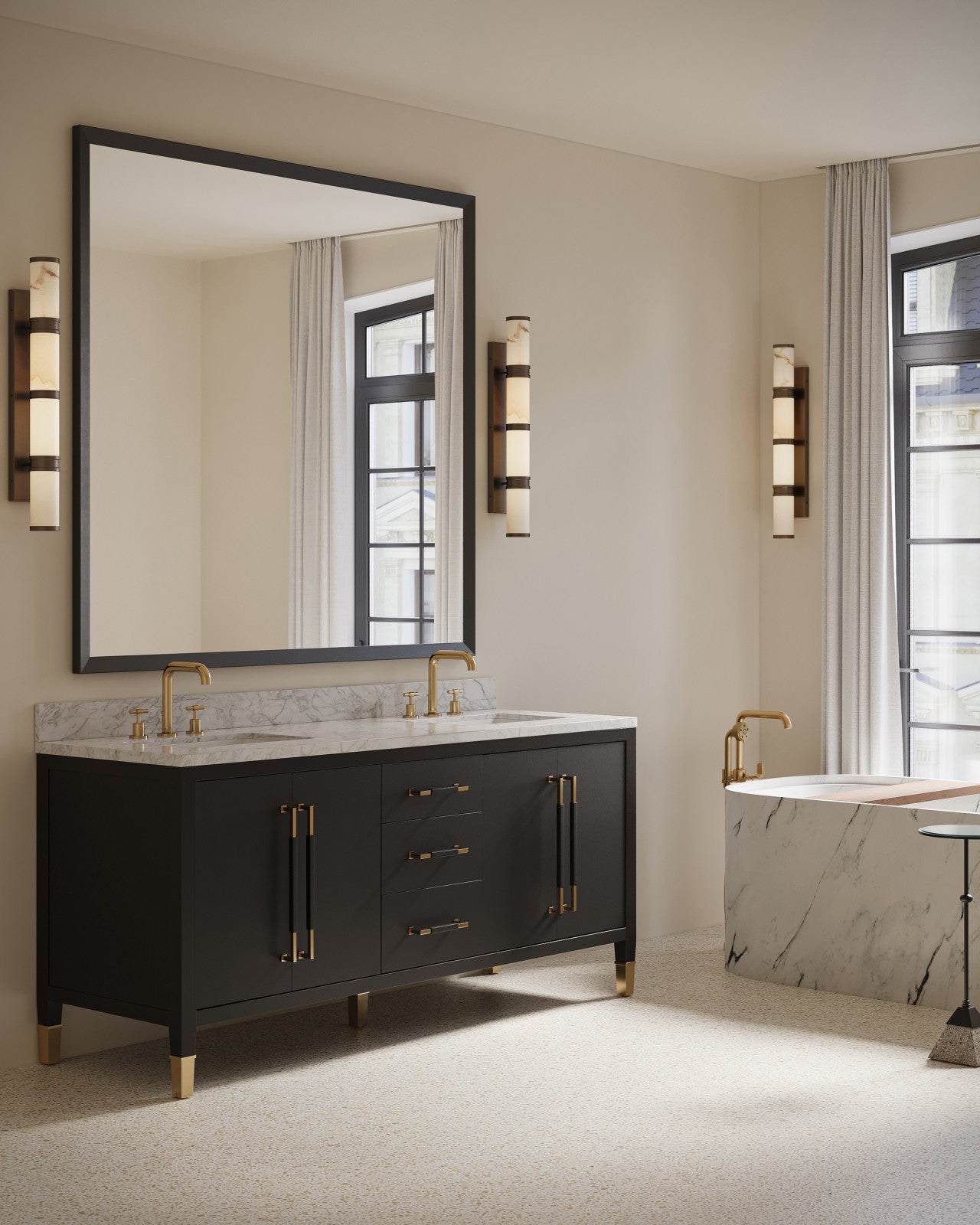 • The Currey & Company Brenham Large Bronze Wall Sconce features a central band of cast brass fitted with two alabaster tubes.