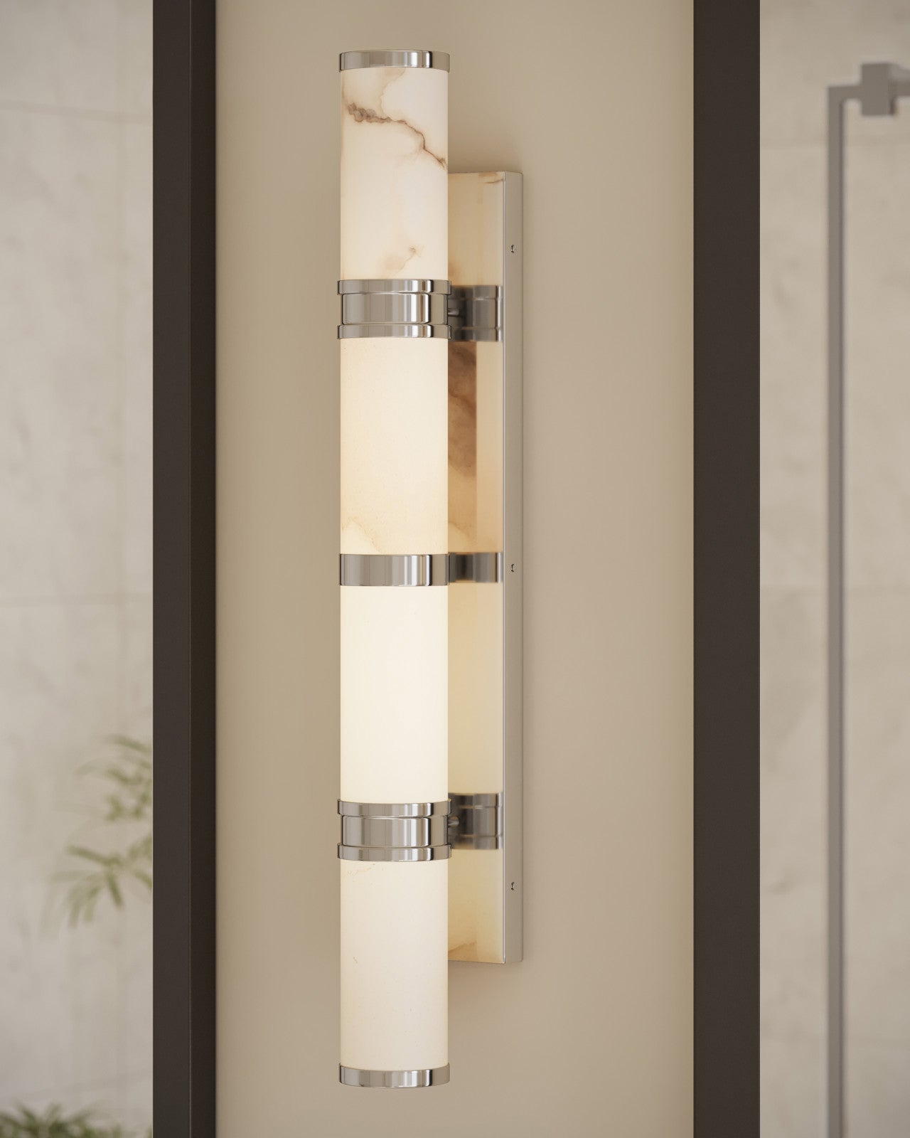 • The Currey & Company Brenham Large Nickel Wall Sconce features a central band of cast brass fitted with two alabaster tubes.
