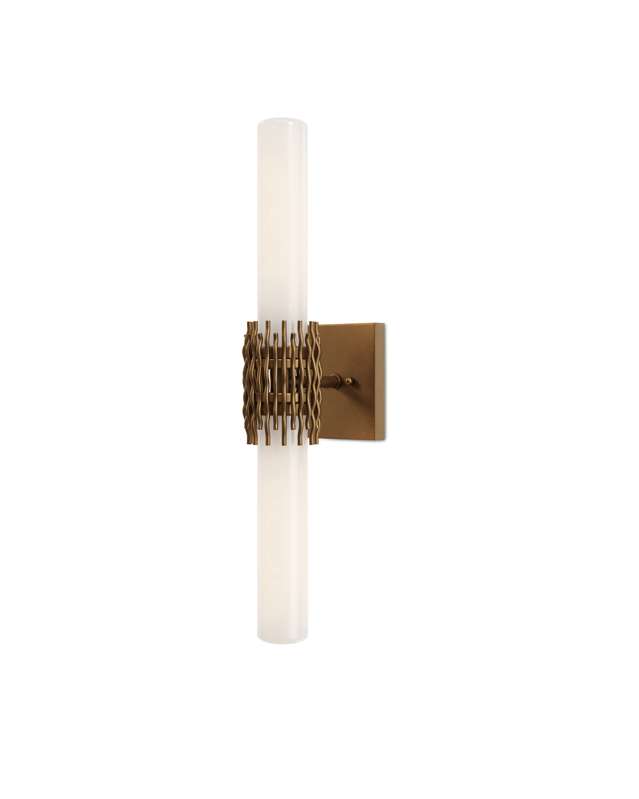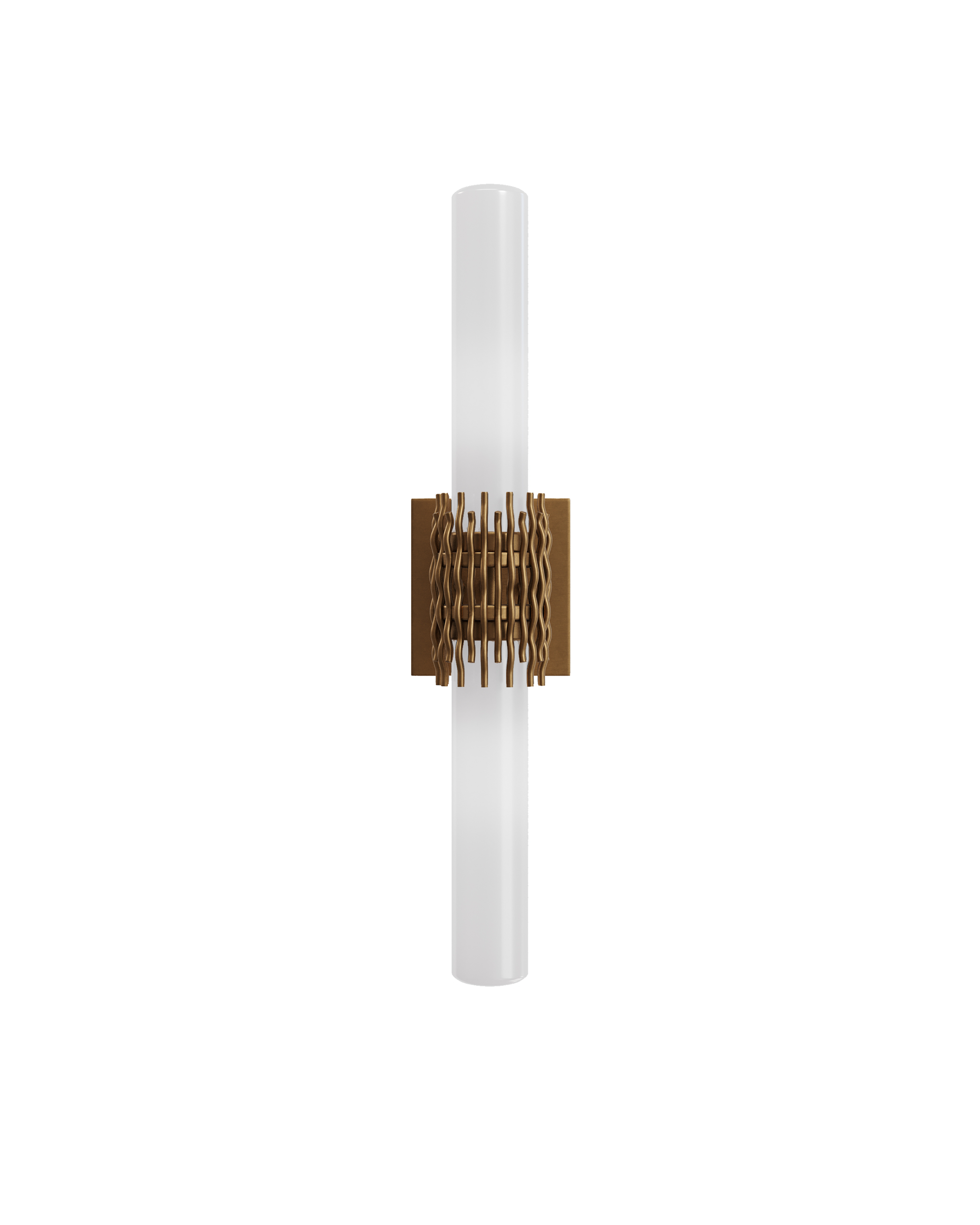 • The Brietta Brass Bath Wall Sconce, which is made of metal in an antique brass finish, is a study in textural movement and smooth stillness. The way the two milky glass tubes are designed to sit within the undulant wires is a sophisticated design detail, as they leave an open negative space in the middle. The gold sconce, which is fitted with two bulbs that are elongated to fully light the tubes, is 23 inches tall, damp rated, and dimmable.