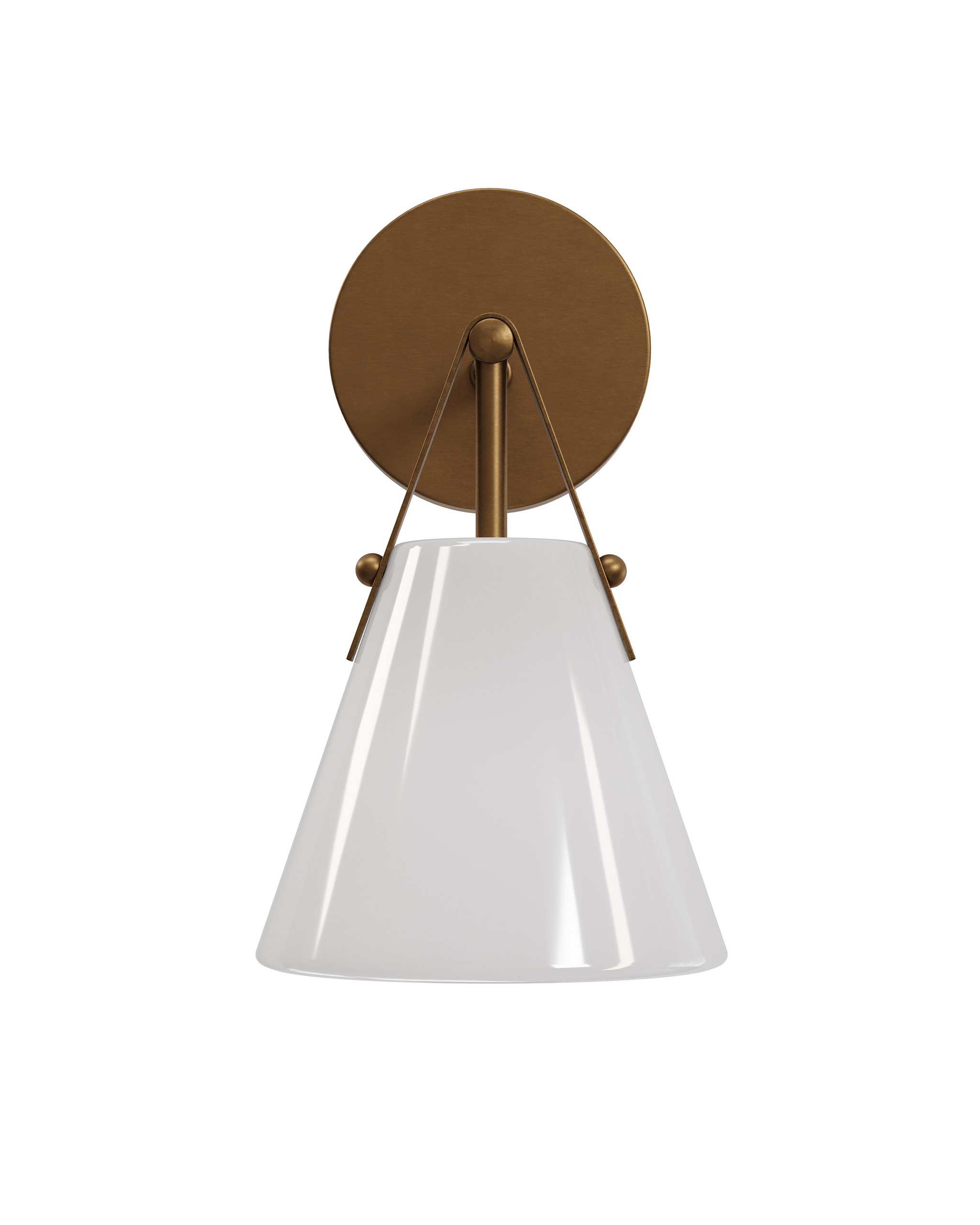 • The Bronwen Brass Bath Wall Sconce is an equestrian-inspired design with a flaring white glass shade fastened to the round wallplate with a sophisticated strap—a subtle nod to classic tack hardware. It can lean modern farmhouse, though it also complements other design styles. The metal in an antique brass finish is a nice contrast to the paleness of the shade, which has a glossy surface that glows. At nearly 12 inches tall, the one-light sconce is damp rated and dimmable.