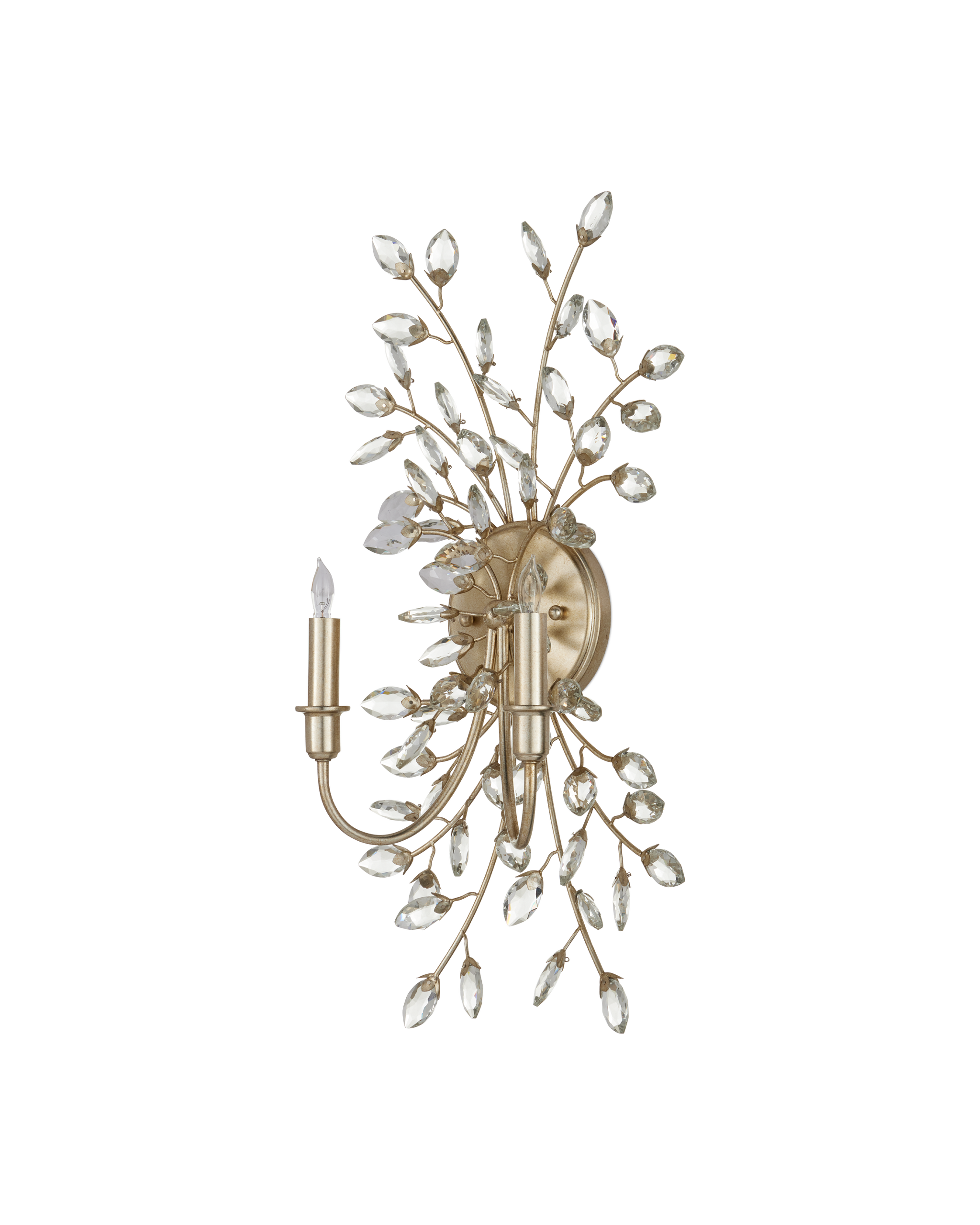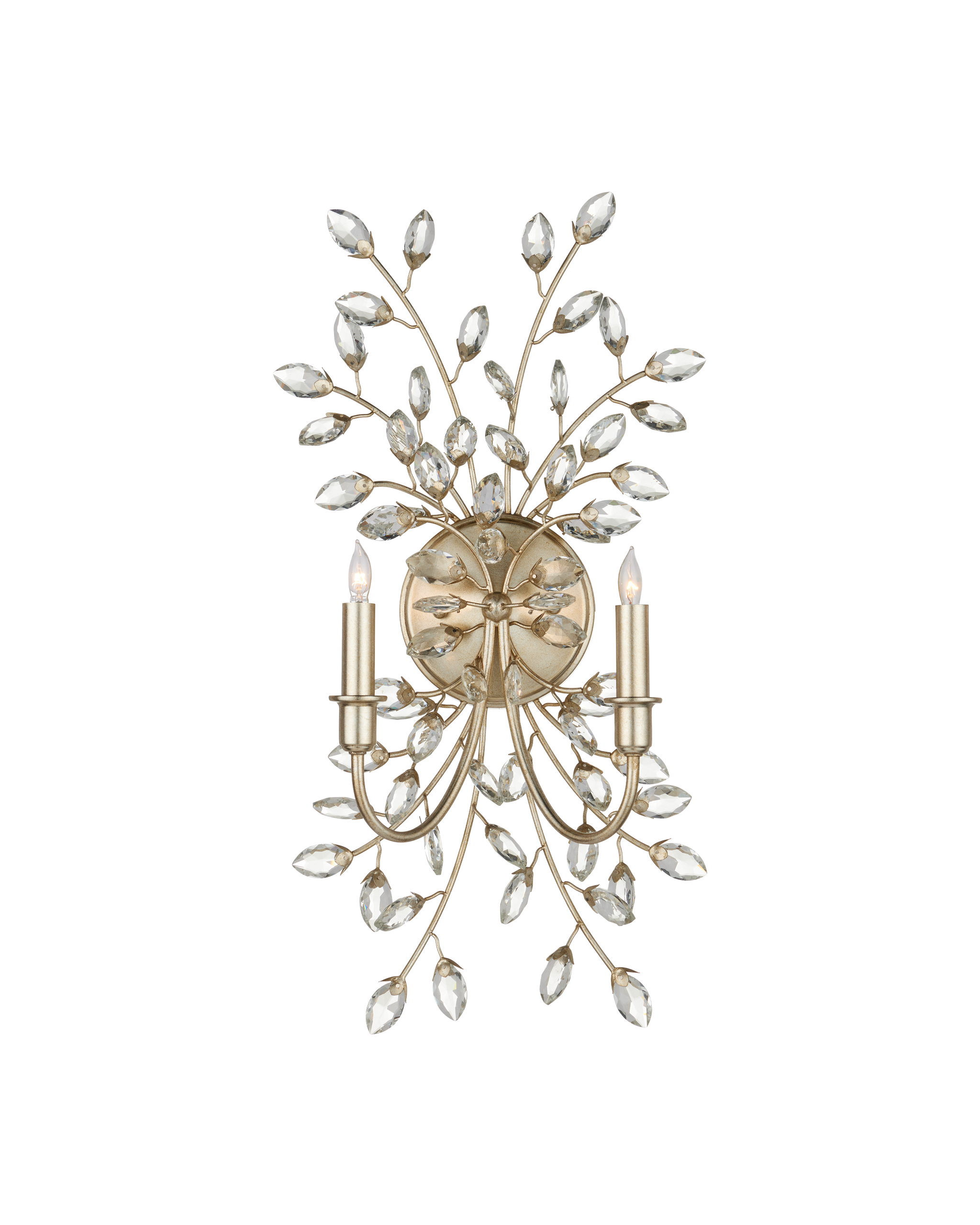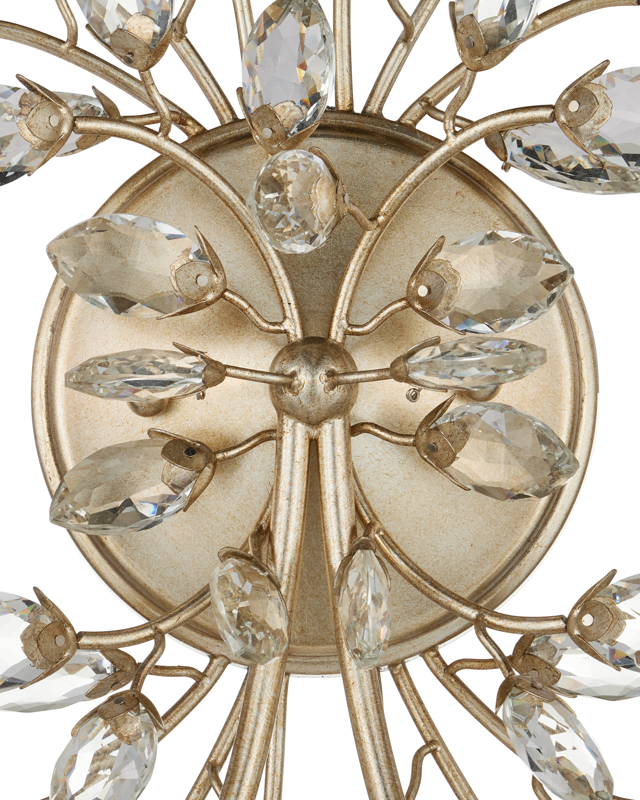 • The Forget-Me-Not Silver Wall Sconce has sparkling floral accents with flowing buds made of crystals. Glowing as brightly as the silver leaf finish, the sprays of crystal are cinched in the middle, flowing upward and downward to capture the illumination. The fixture is a functional piece and a work of art, as each crystal is hand-pinned. The nicely sized sconce, which measures 25.5 inches high and 14 inches wide, has two lights and is dimmable.