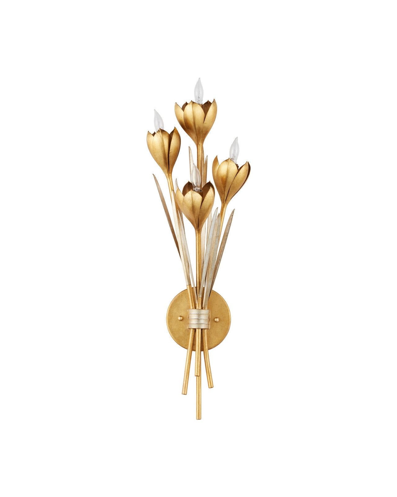 • The Hortensia Wall Sconce from Currey & Company is a gold chandelier with billowing blossoms inspired by the Crocus flower ornamented by leaves in a silver finish.
