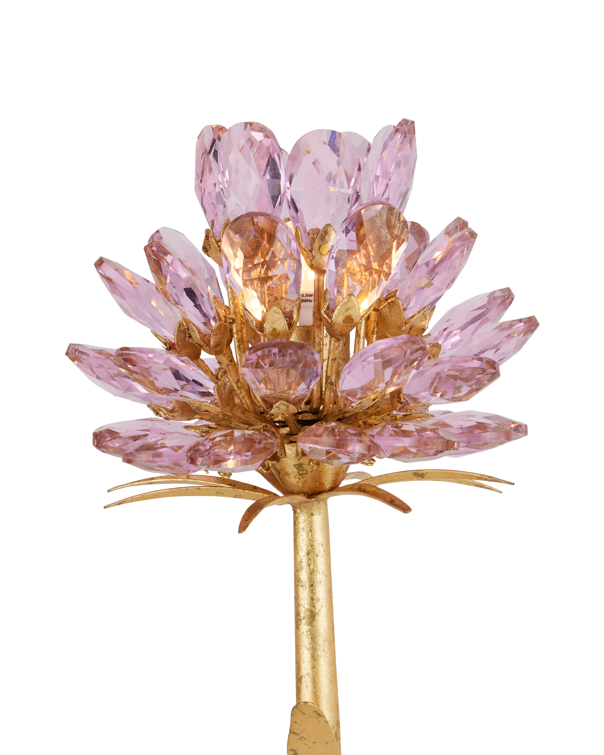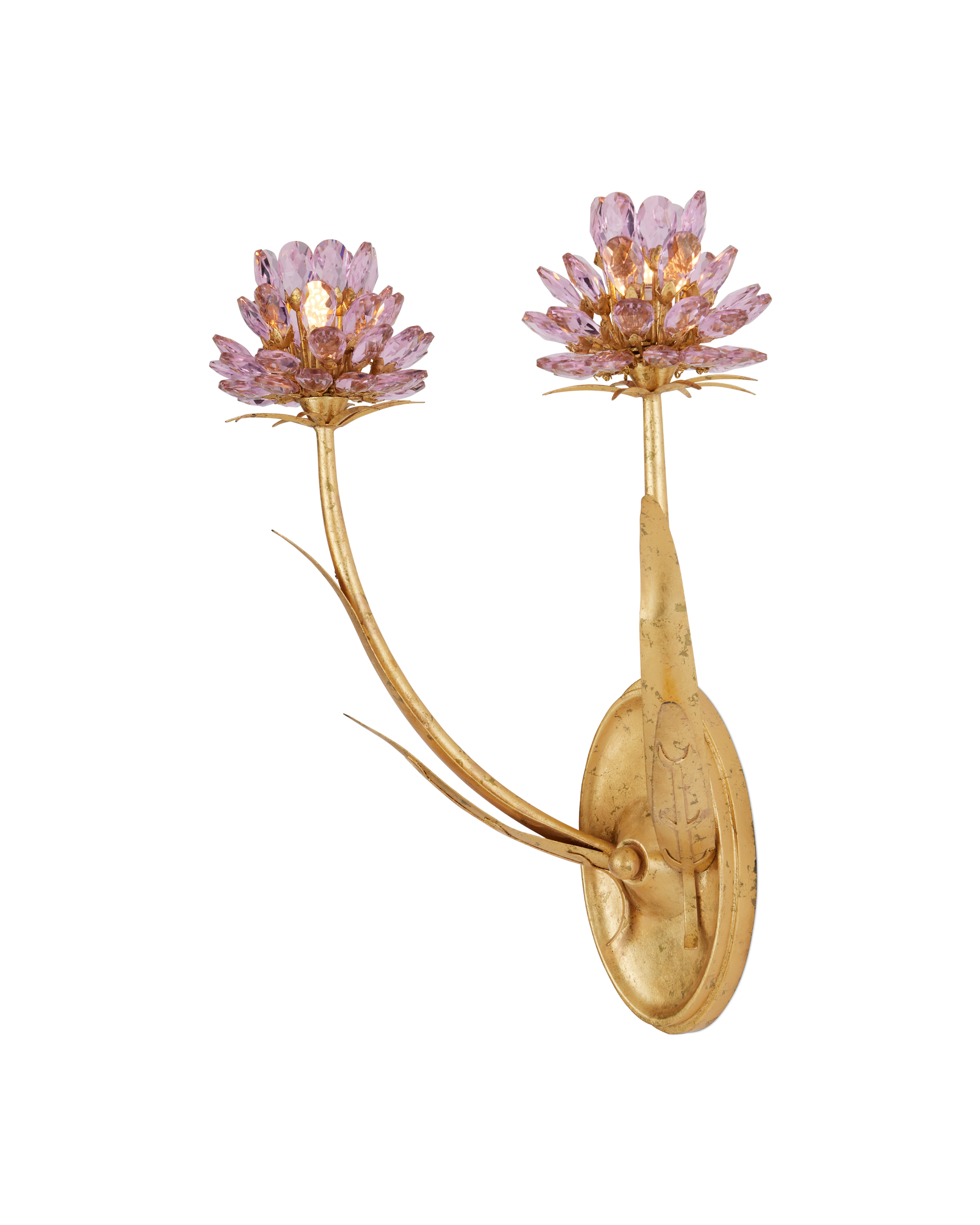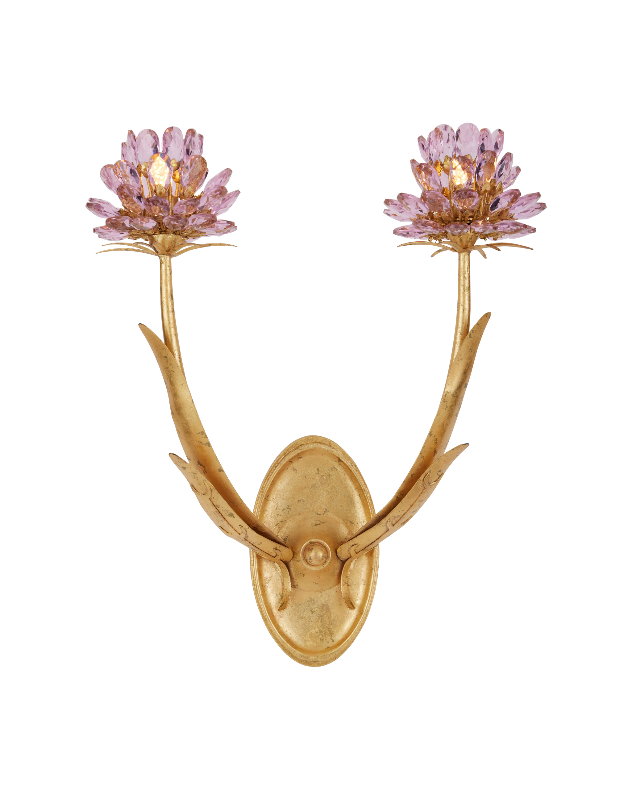 • Everything about the Marilee Double-Light Wall Sconce is luminous, from its Dutch Gold Leaf finish to the crystal blossoms that rise from the ends of its stems. The bulbs are nestled into the faceted pink crystals to bring effervescence to the glass. The detailing on the arms looks like leaves flowing up from the wallplate and a palm detail spritzes beneath the blossoms like implied bobeches. The gold wall sconce, which is made of wrought iron, is dimmable.