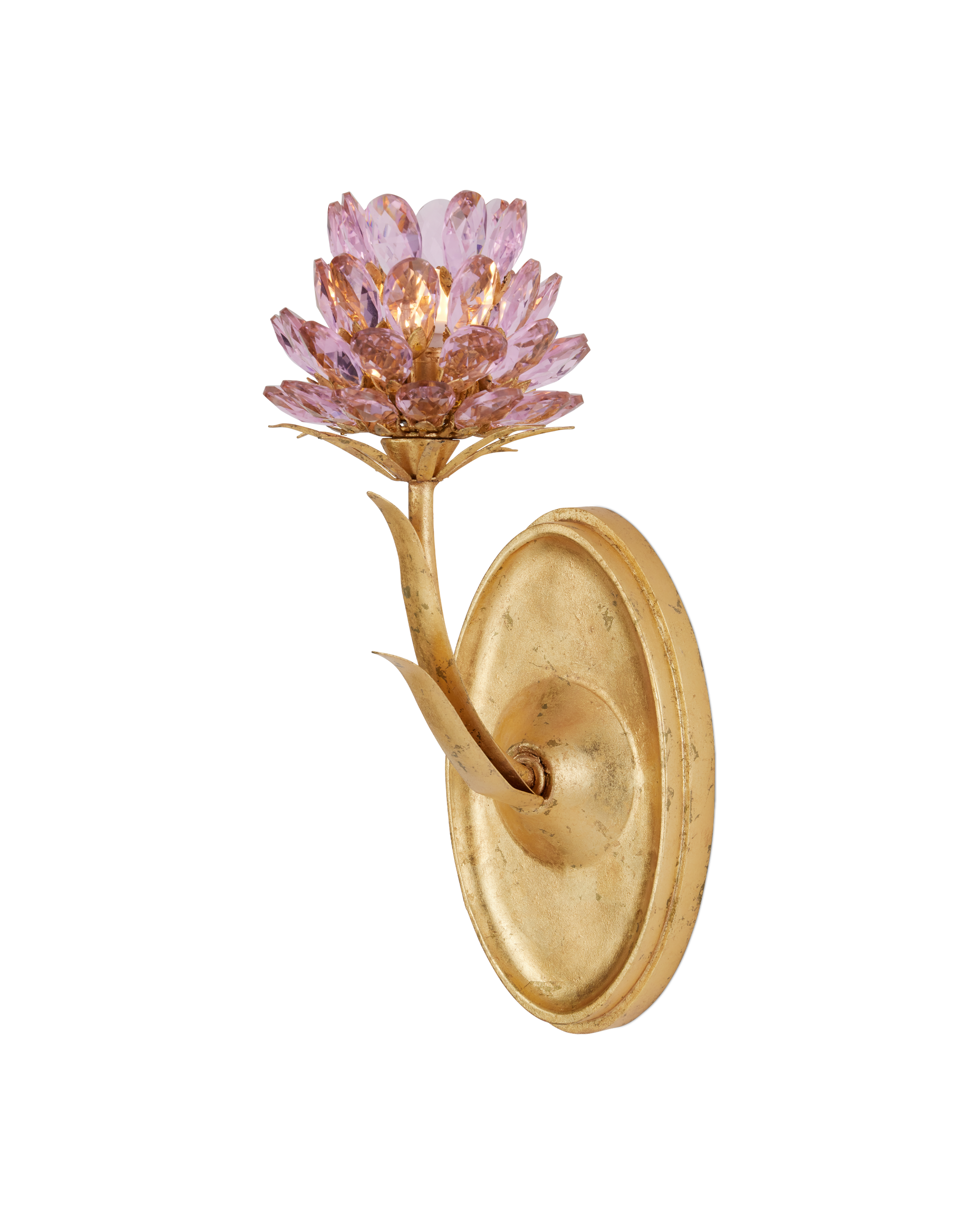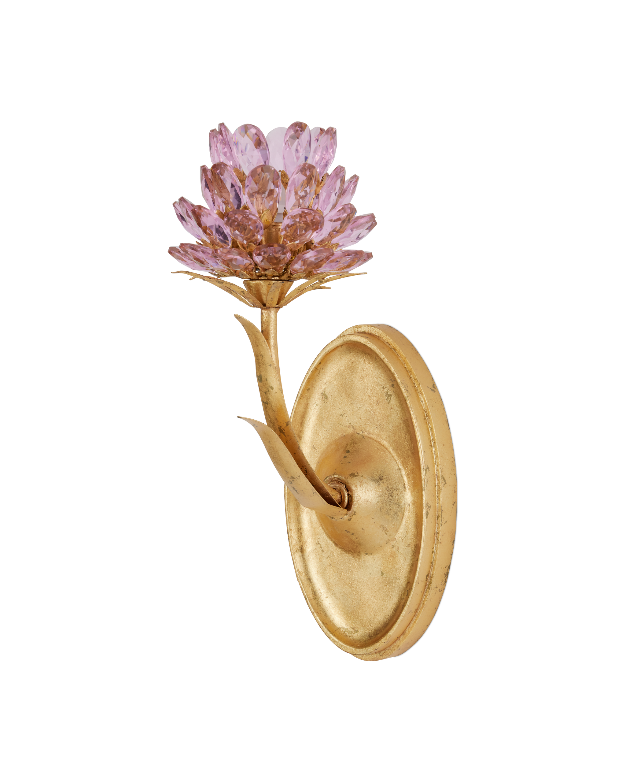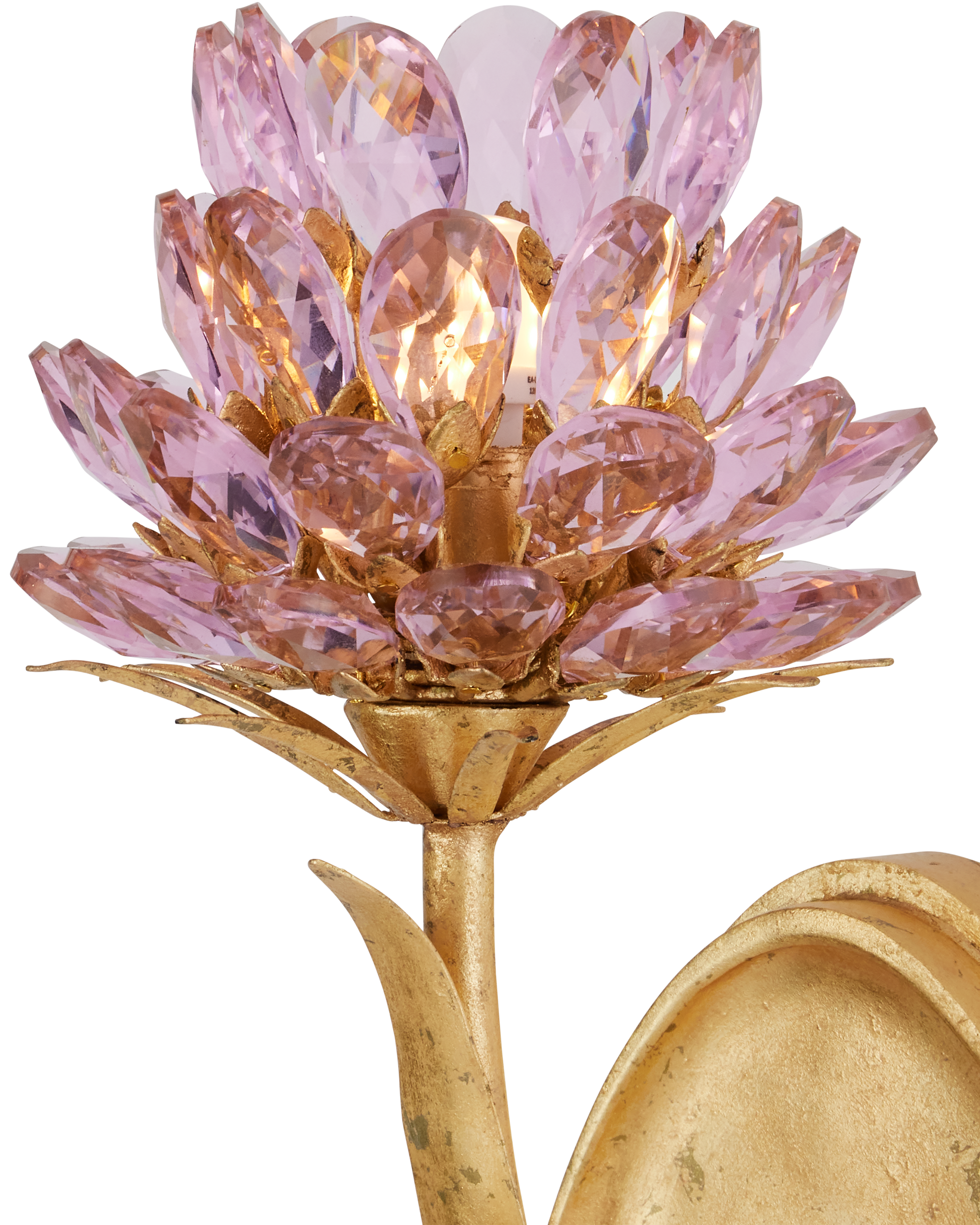 • Everything about the Marilee Single-Light Wall Sconce is luminous, from its Dutch Gold Leaf finish to the crystal blossom that rises from the end of its stem. The bulb is nestled into the faceted pink crystals to bring effervescence to the glass. The detailing on the arm looks like leaves flowing up from the wallplate and a palm detail spritzes beneath the blossom like an implied bobeche. The gold wall sconce, which is made of wrought iron, is dimmable.