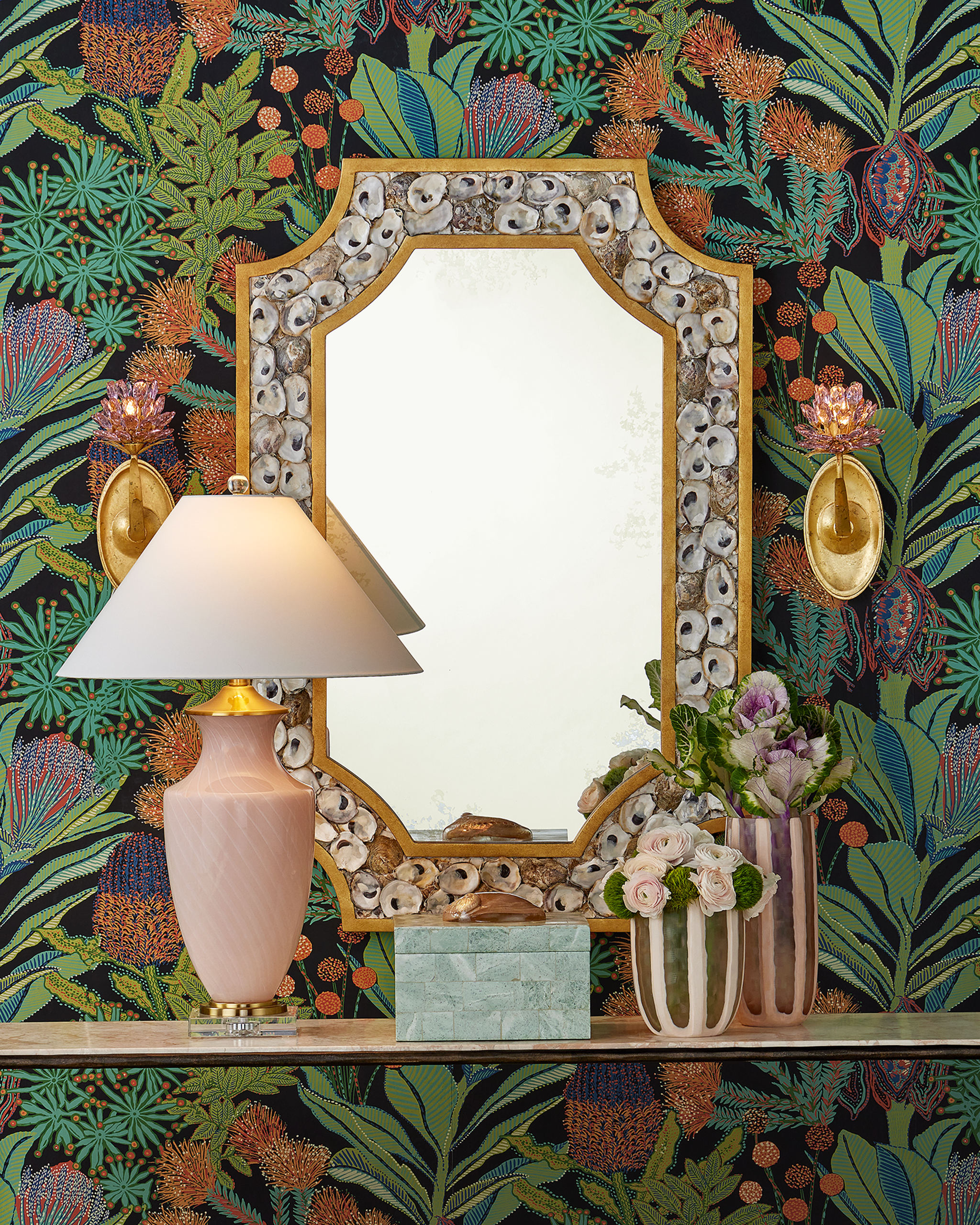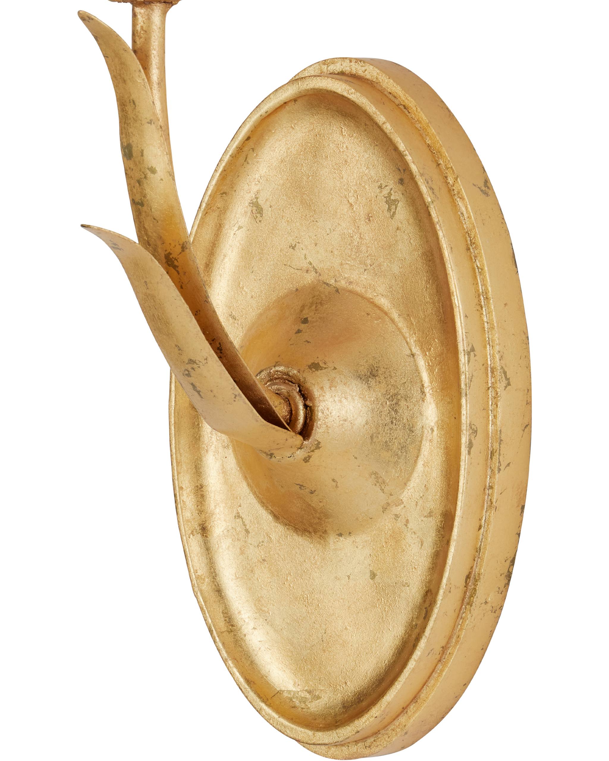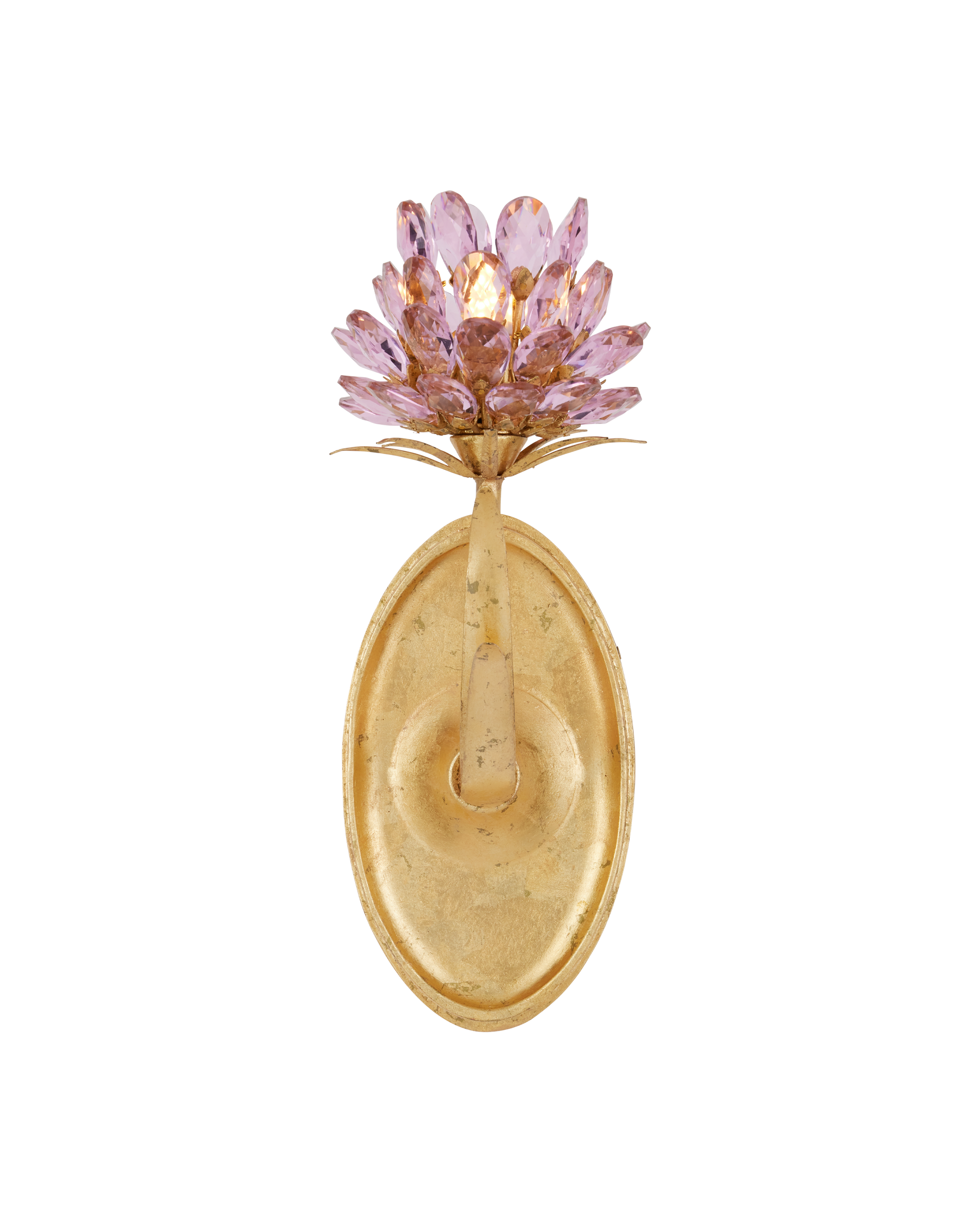 • Everything about the Marilee Single-Light Wall Sconce is luminous, from its Dutch Gold Leaf finish to the crystal blossom that rises from the end of its stem. The bulb is nestled into the faceted pink crystals to bring effervescence to the glass. The detailing on the arm looks like leaves flowing up from the wallplate and a palm detail spritzes beneath the blossom like an implied bobeche. The gold wall sconce, which is made of wrought iron, is dimmable.