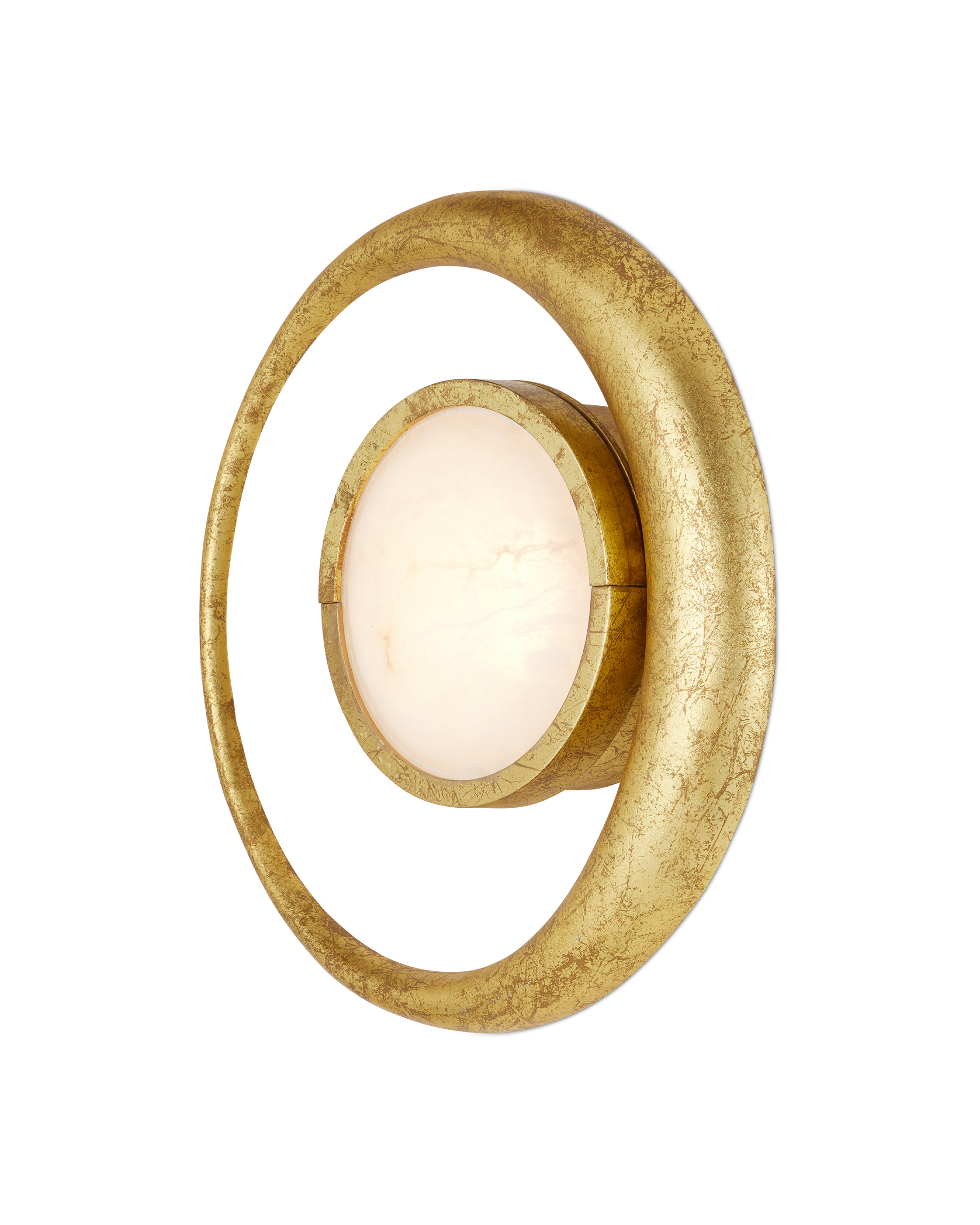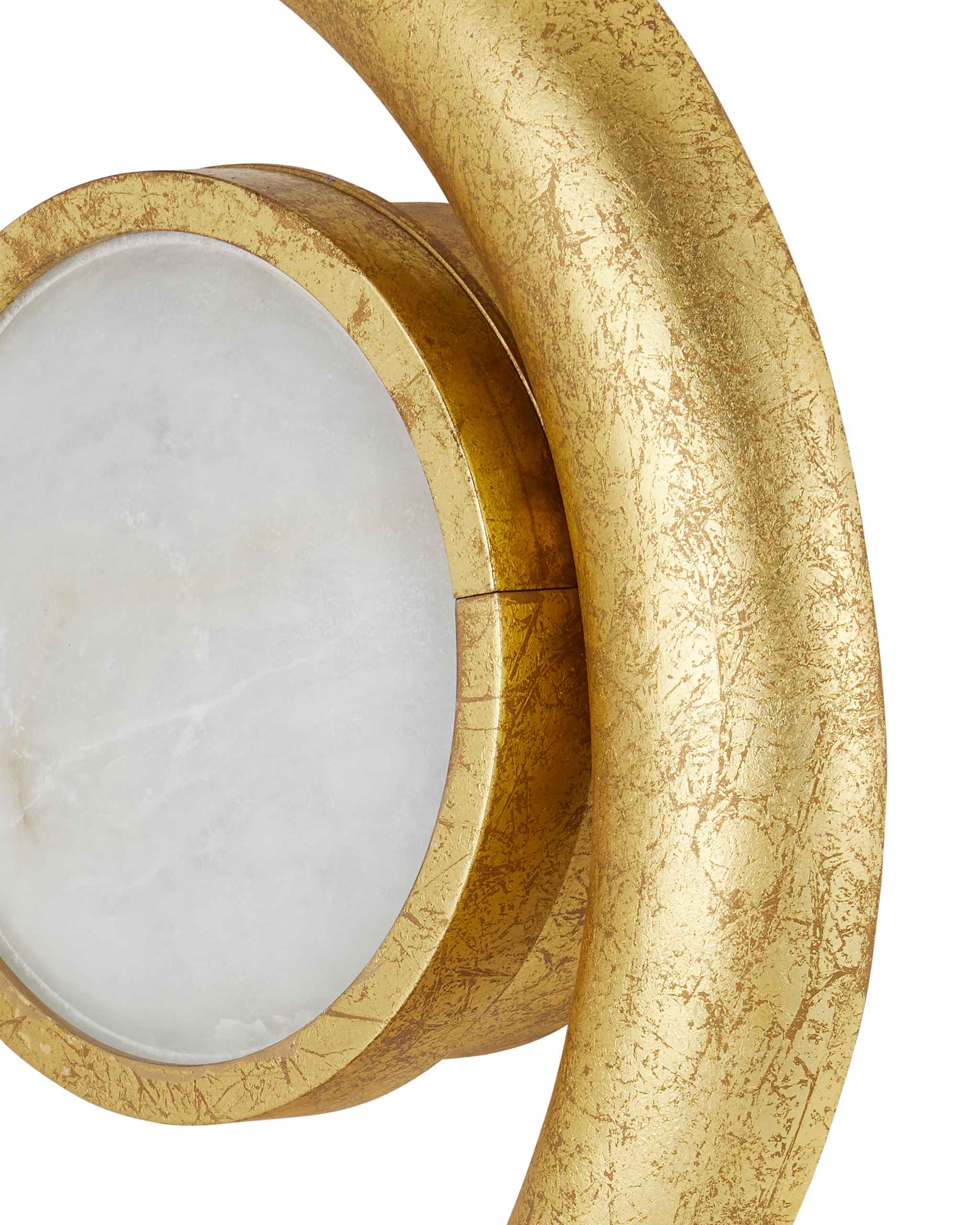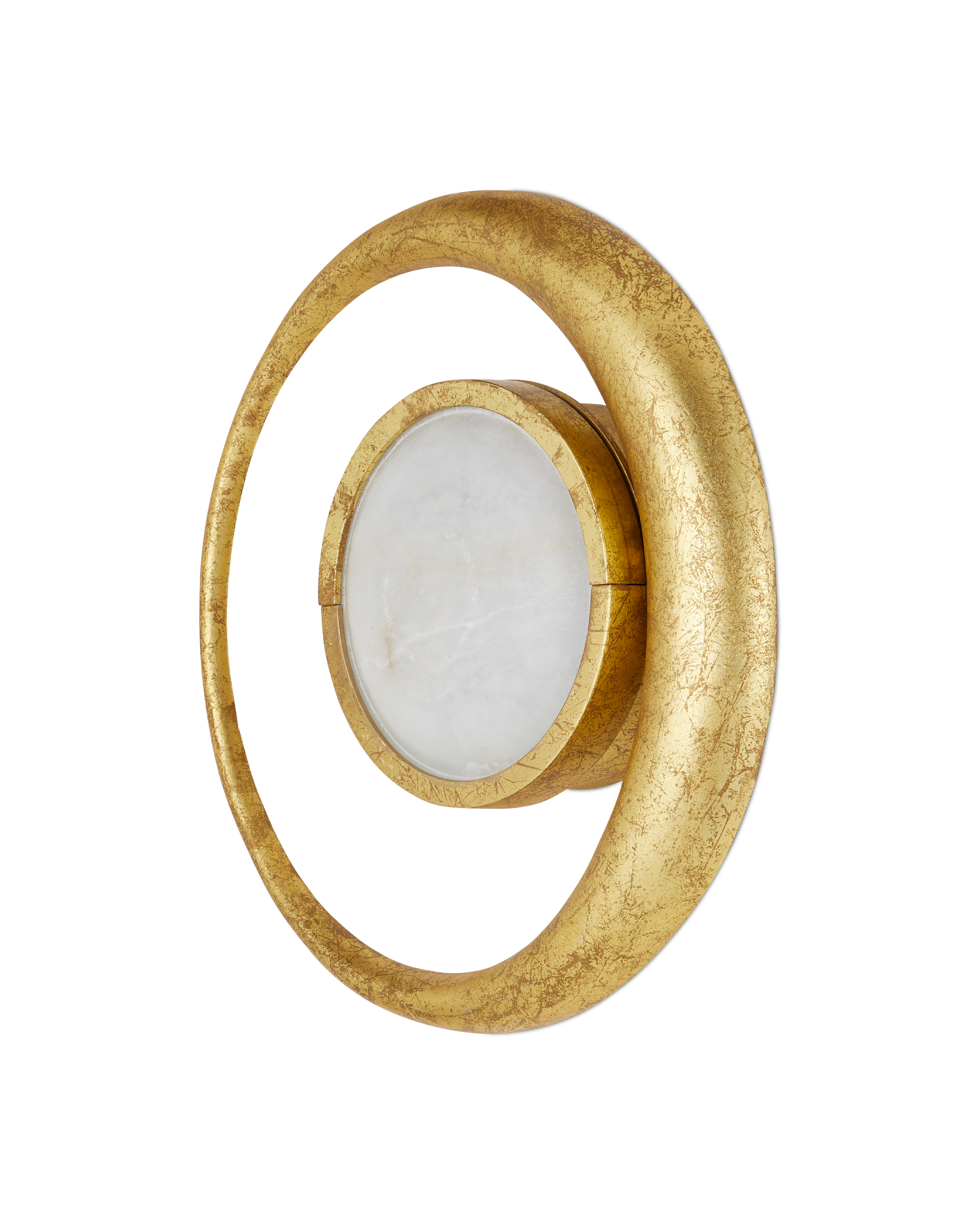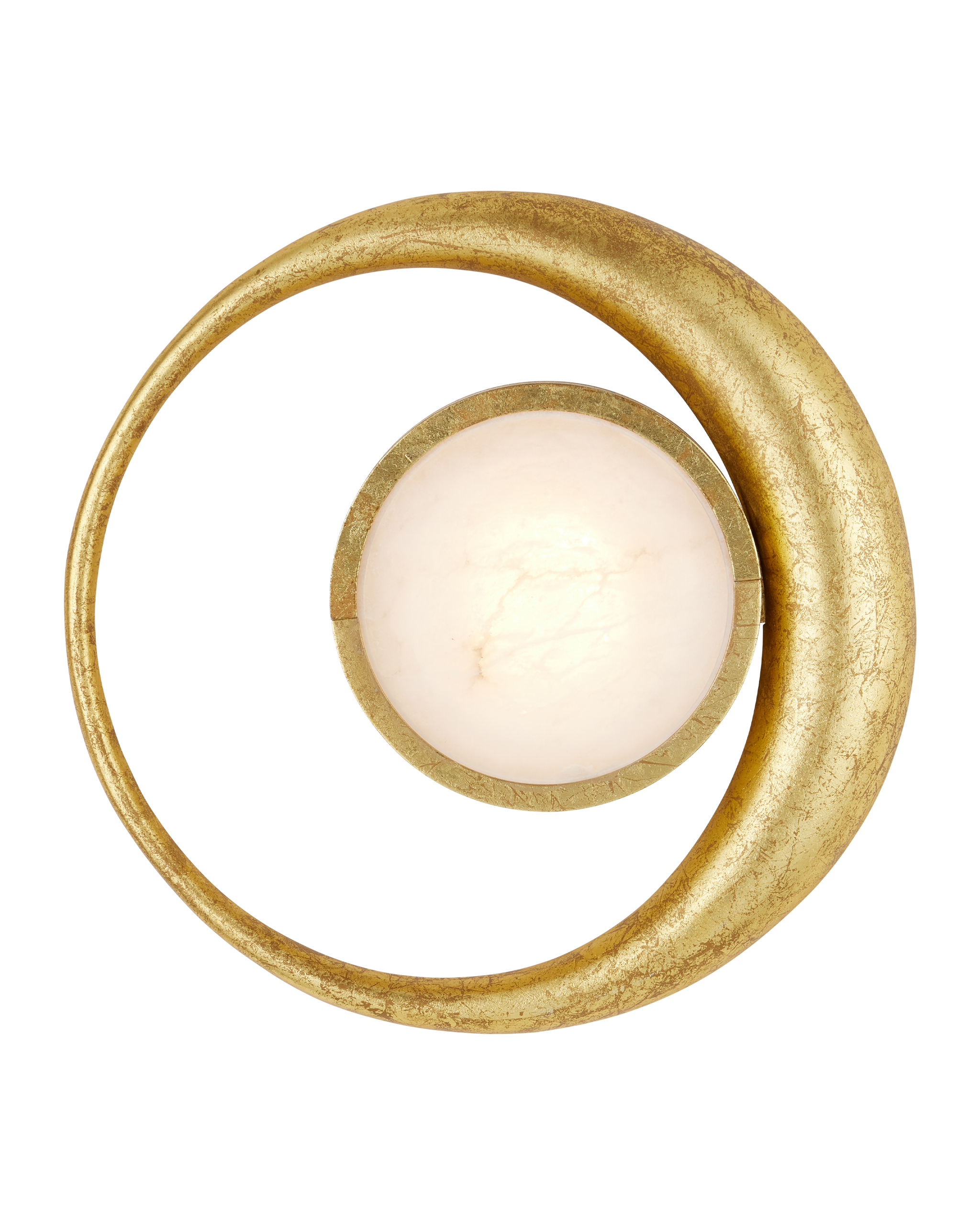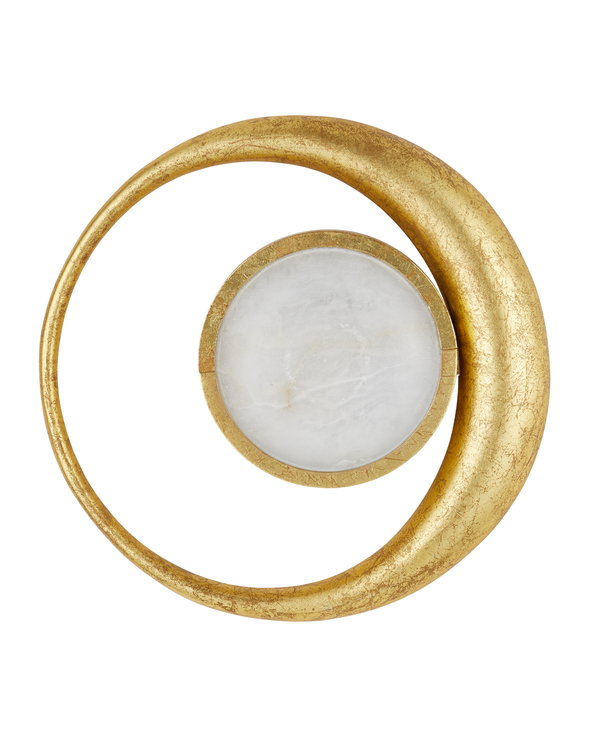• In Mayan, one of the ancient languages of the culture of the same name, Muluk means Moon. It is in the spirit of honoring these early people in Mexico that Marjorie Skouras designed the Muluk Wall Sconce. Her initial spark was a vintage brooch she found that spoke to her of the motifs proliferating throughout the country during that dynamic era. Made of iron in a gold leaf finish, the delicate lines of a fingernail moon encircle a disc of white marble that glows warmly when the lights are on. The artistry with which the finish has been applied to this ADA-compliant gold sconce brings it a luxe feel.