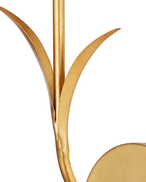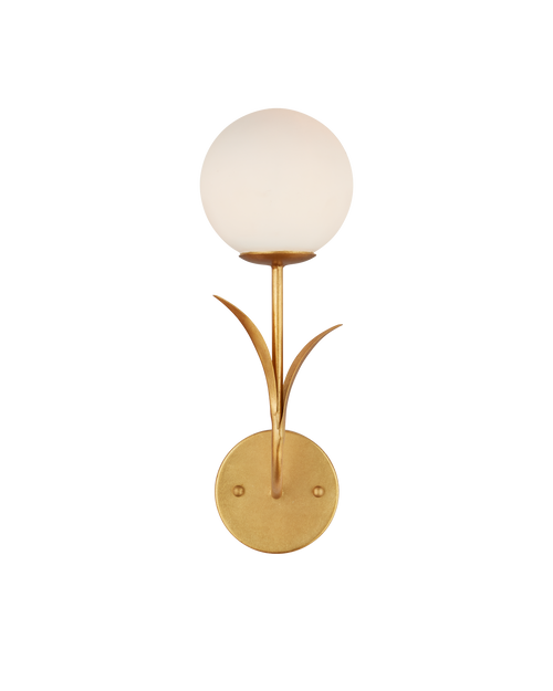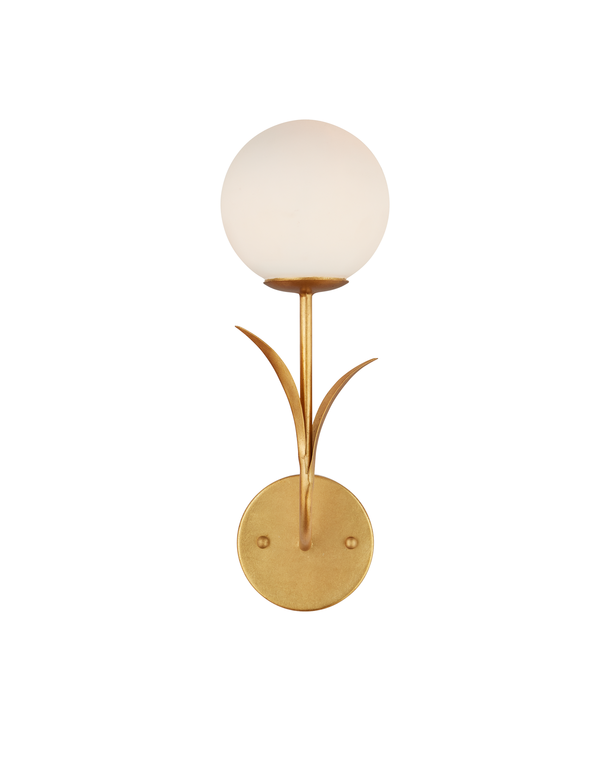 • The Rossville Wall Sconce exudes a contemporary retro vibe with its globe-shaped bulb. This nature-inspired gold sconce is modern in its makeup with the thin arcing leaves that flow from it. Made of wrought iron in a contemporary gold leaf finish, the bobeche balances its white glass globe brilliantly.