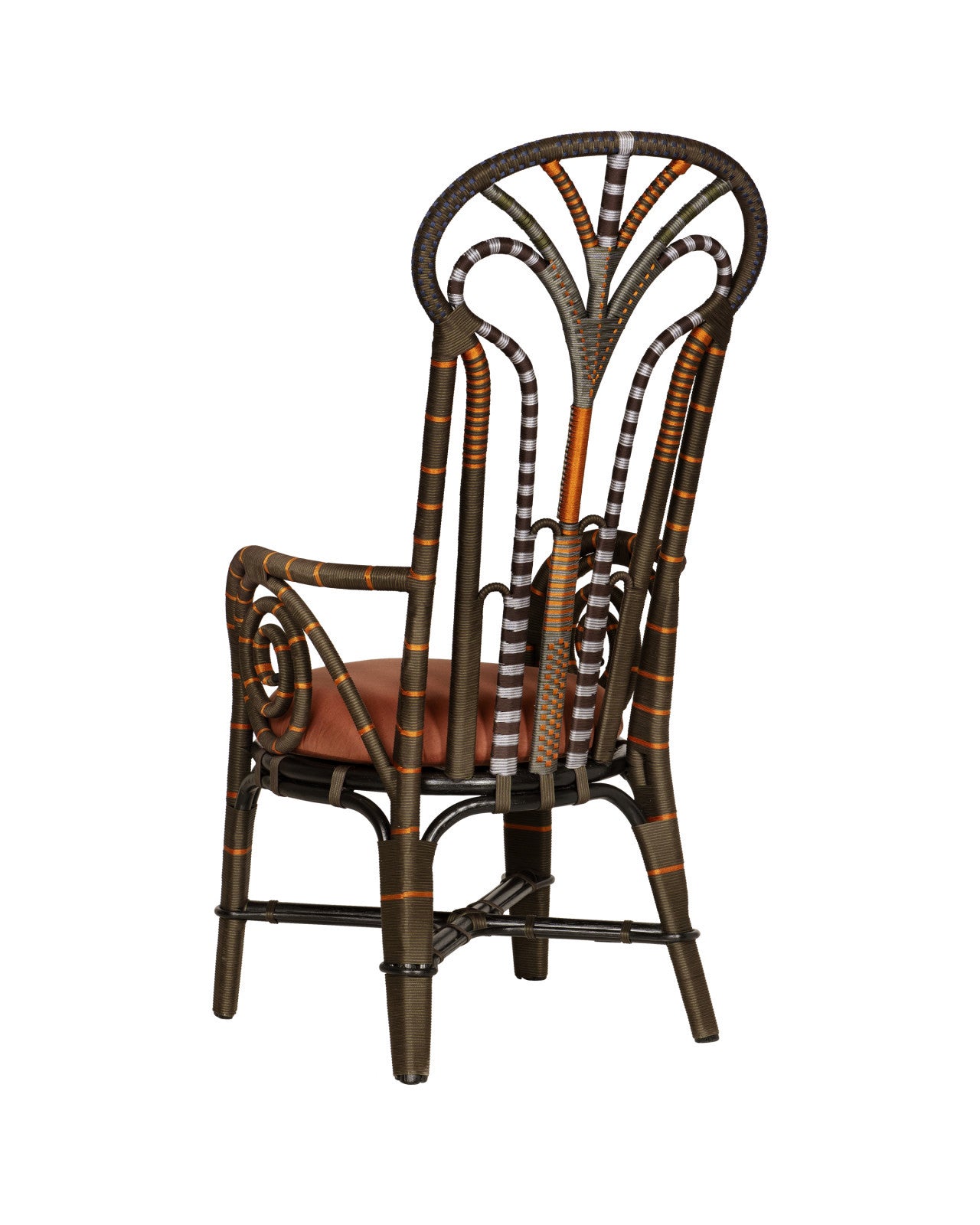 • The Currey & Company Benin Throne Brown Armchair is a narrow and tall-backed derivative of the classic Peacock chair silhouette with rich brown, vivid orange and smooth silver performance rope wrapped over a bent rattan frame. This style of rattan chair has long been symbolic of royalty and empowerment, and now celebrates bohemian luxury. While this iteration is slender in scale, it’s a dramatic design demanding of attention. The loose seat cushion is covered in Trevino Julep 100% silk upholstery.