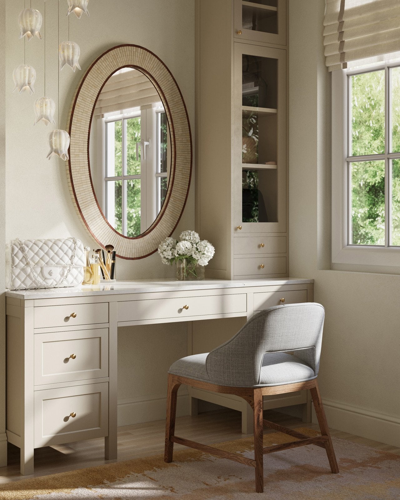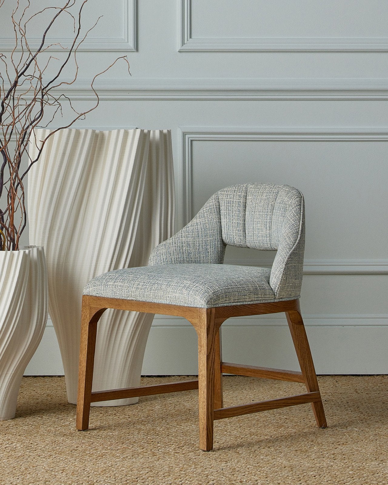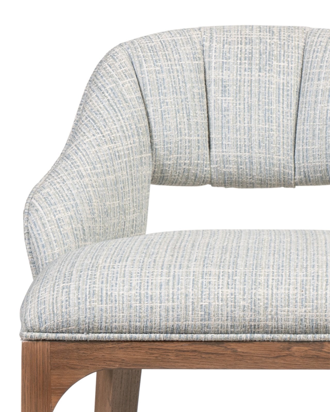 • The Currey & Company Inga Chair with an upholstered back and seat in a Greenlight Powder fabric has a solid oak frame.