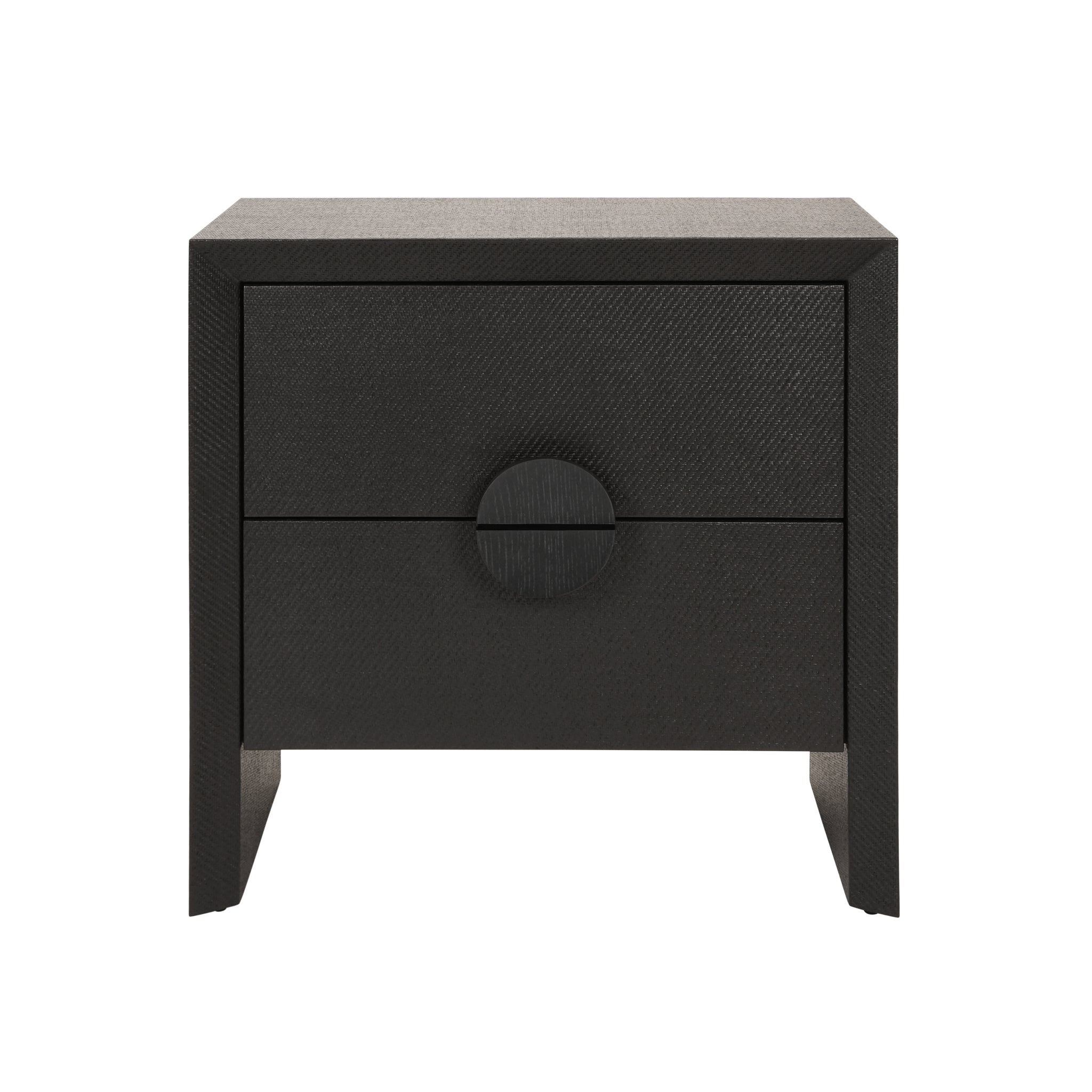 The Worlds Away Ezra side table or nightstand features two drawers for storage. Available in natural grasscloth with cerused oak handles or black painted grasscloth with black oak handles, each piece showcases the unique texture of grasscloth. Works equally well next to a bed as a nightstand or in a living room as a side table.
