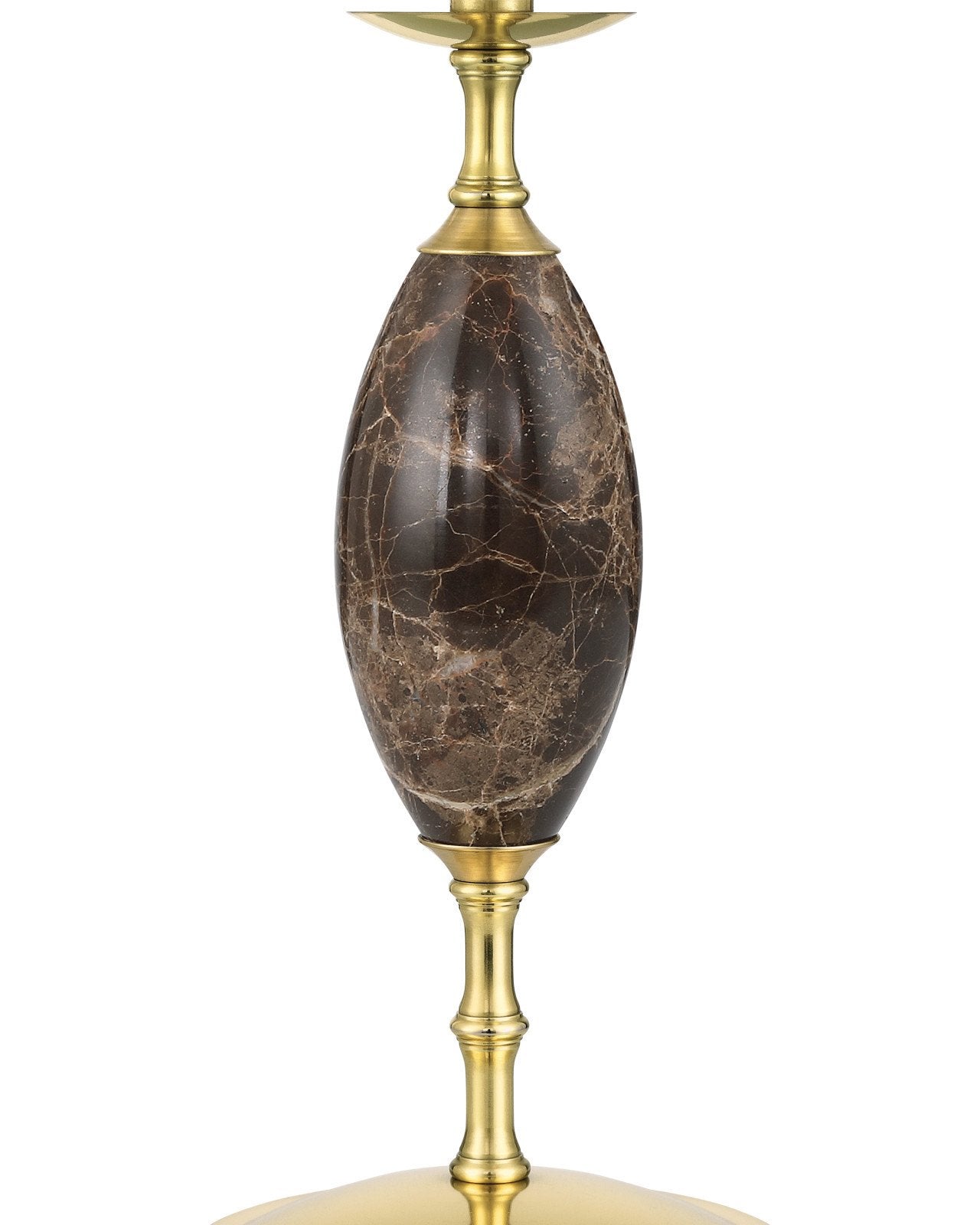 • A slim brass body frames an oval insert of coffee-colored marble.