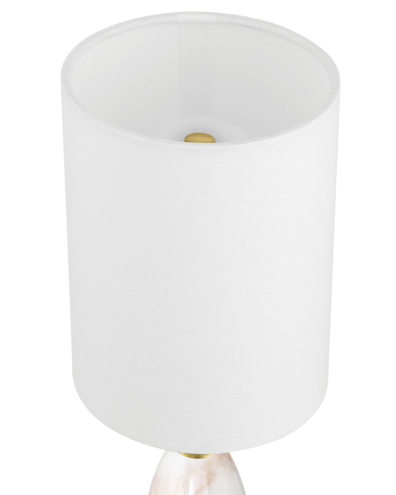 • The Currey & Company Marche White Cordless Table Lamp features a slim metal body in a brass finish that frames an oval insert of white marble at its center.