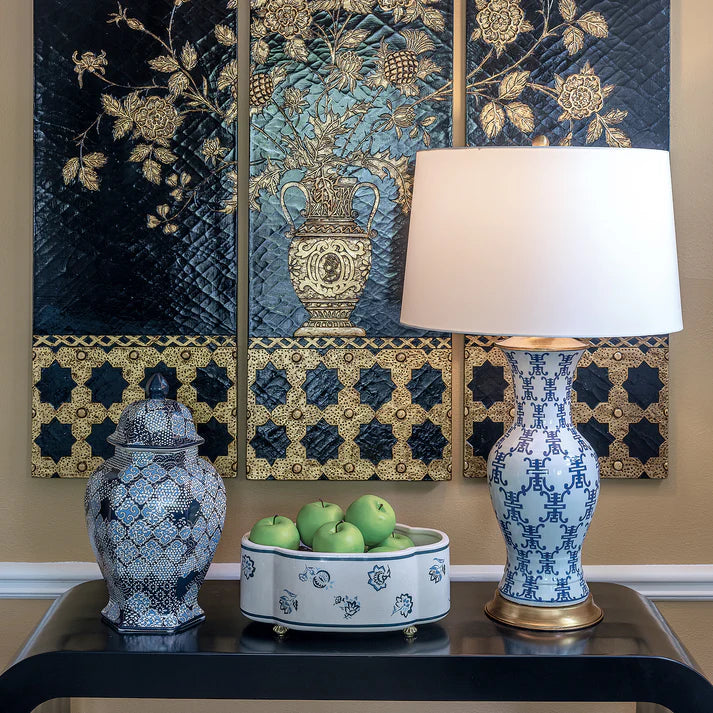Long considered the symbol of a wishful long life and longevity, we celebrate this iconic symbol in classic blue & white porcelain with our Longevity lamp. Accented with solid brass hardware and metal ball finial.