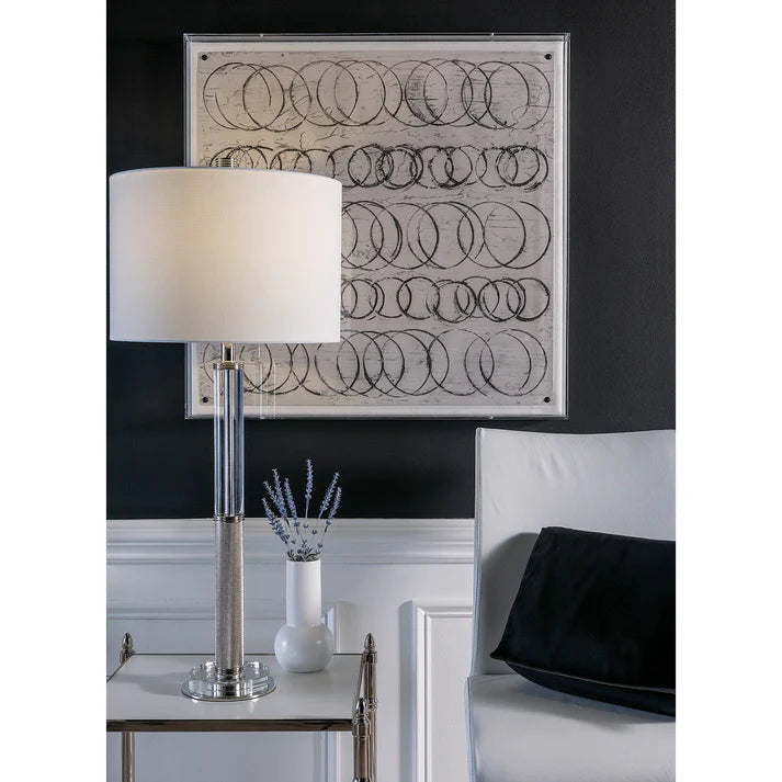 Mid century, modern style narrow column lamp featuring a crystal turning joined with aged brass, bronze, or nickel finished knurled textured metal base column. Stacked crystal base accented with a metal aged brass finished bottom.