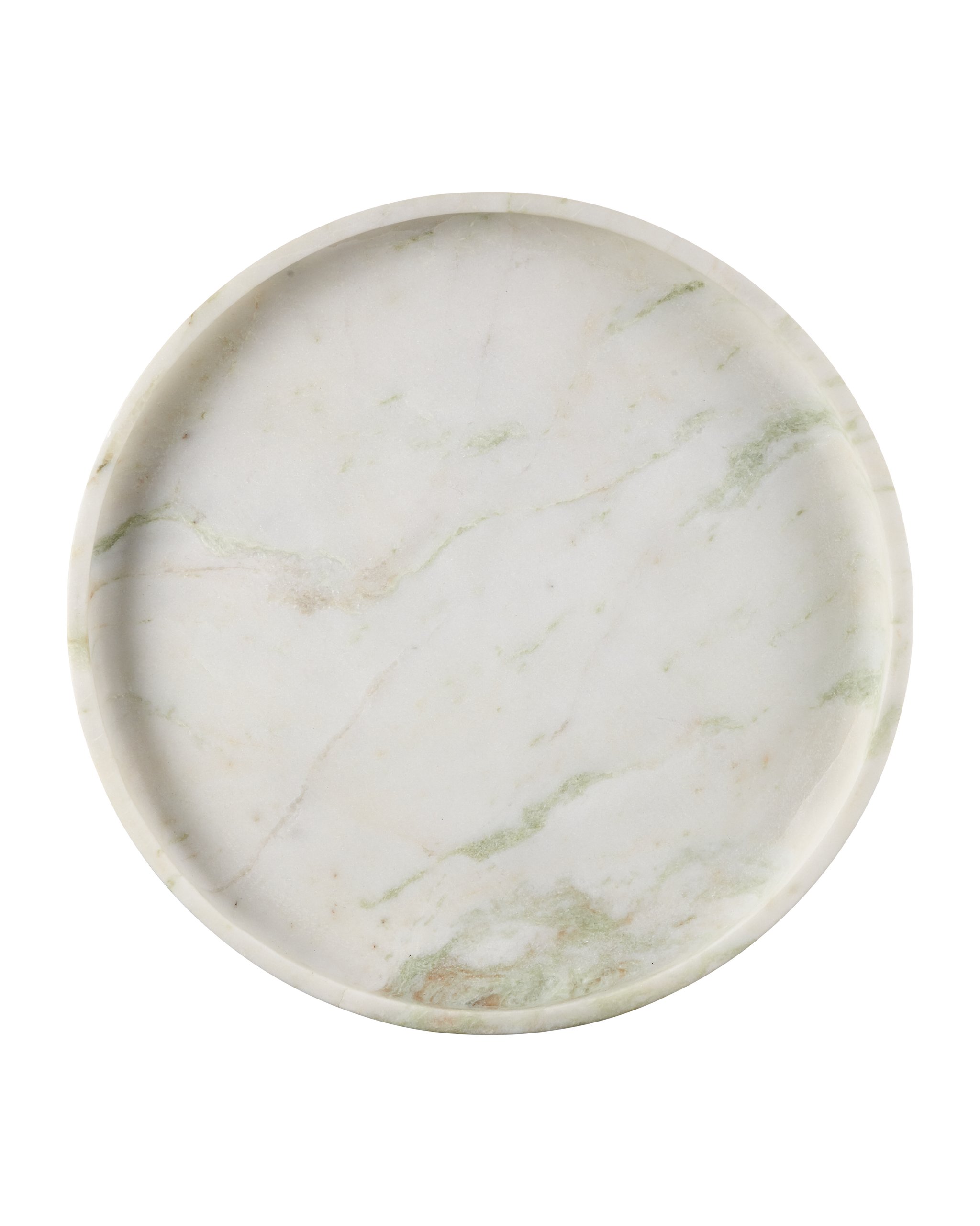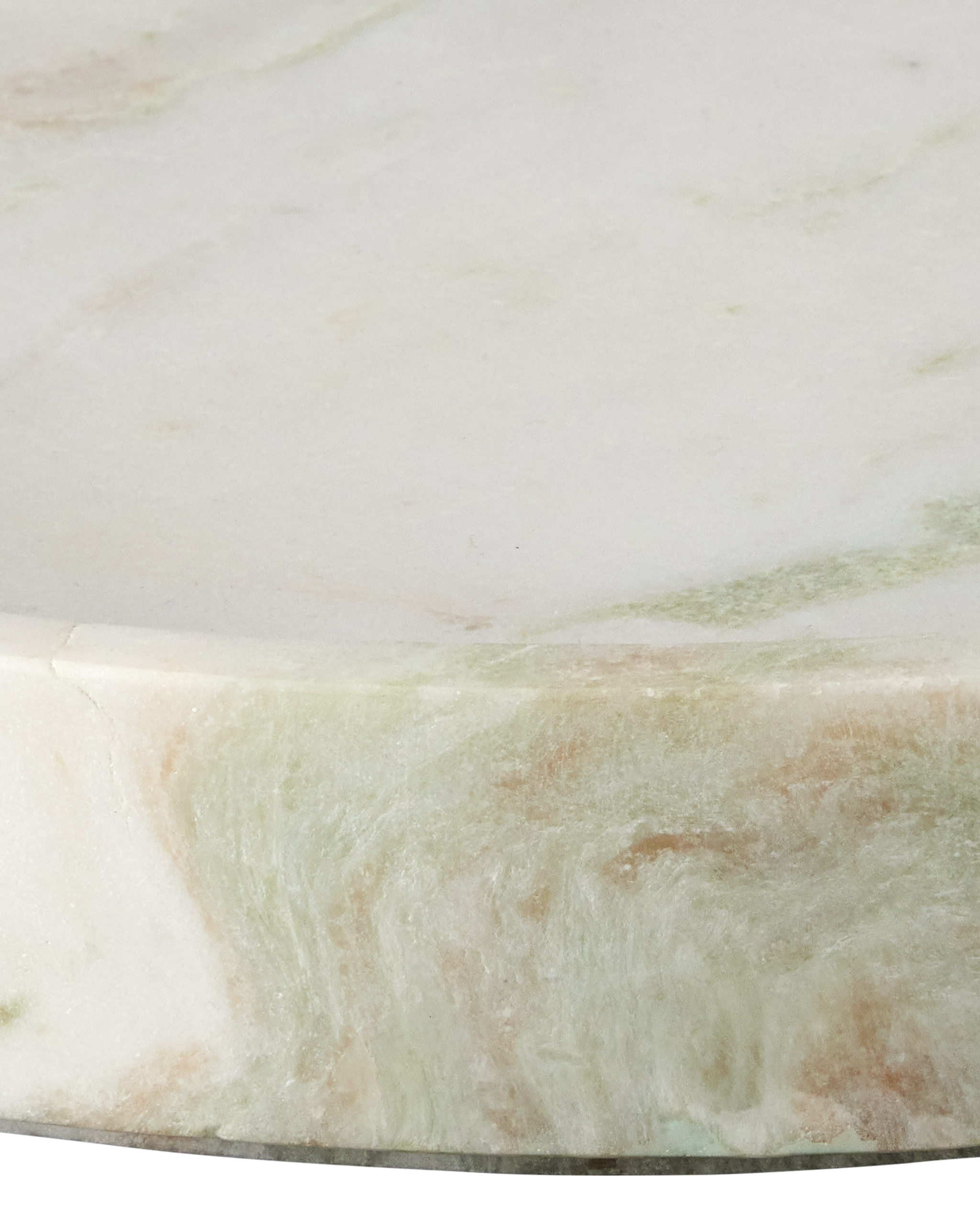 • The Bilbao Aravali Onyx Round Tray is made of natural stone with lovely pastel pink and green veining flowing along its surface. The material is sourced from the Aravali Mountain Range in India. Design details include a narrow plinth where the tray tapers off at the bottom and feet that elevate it slightly from the surface. Because this is a natural stone, the veining will vary from piece to piece.