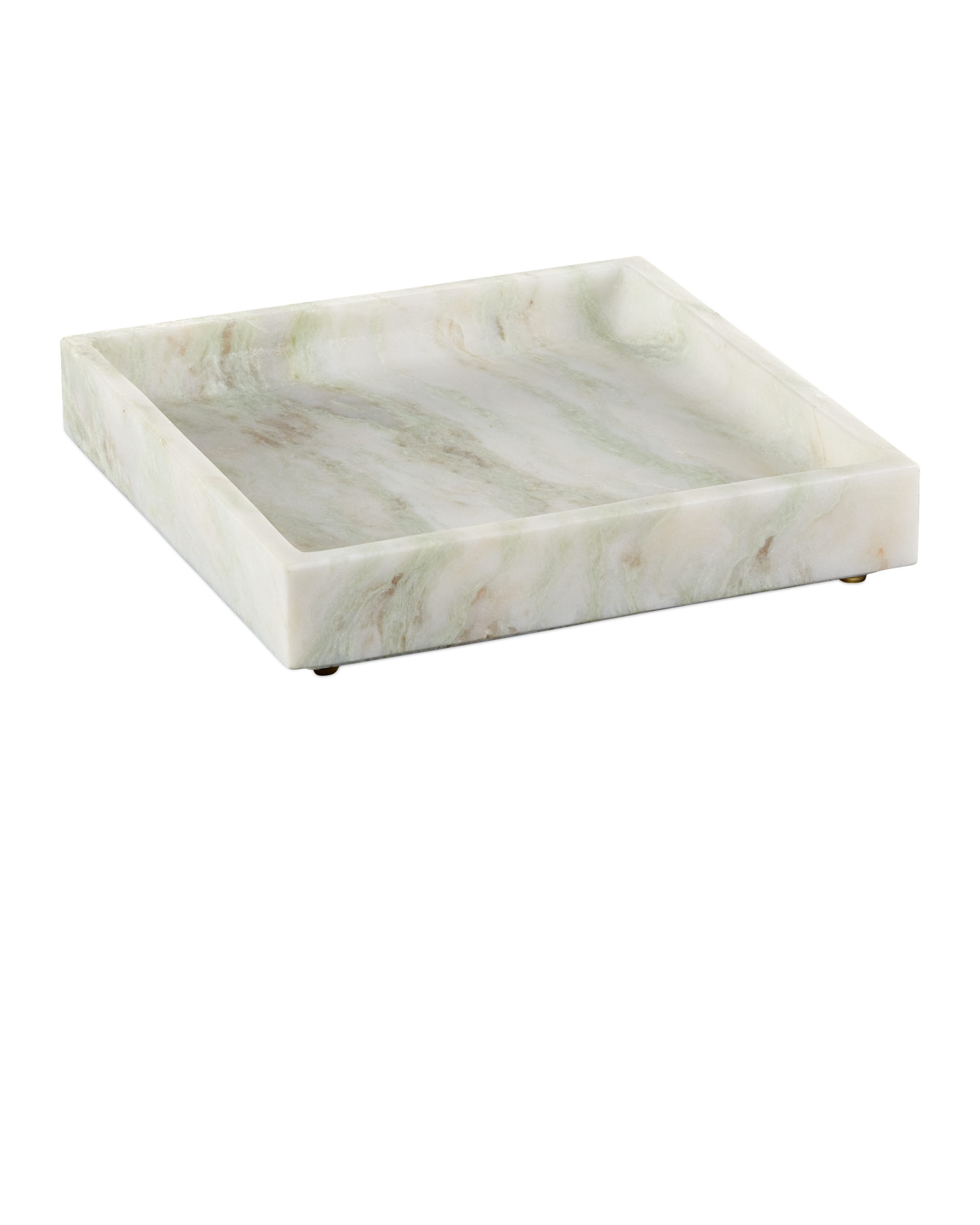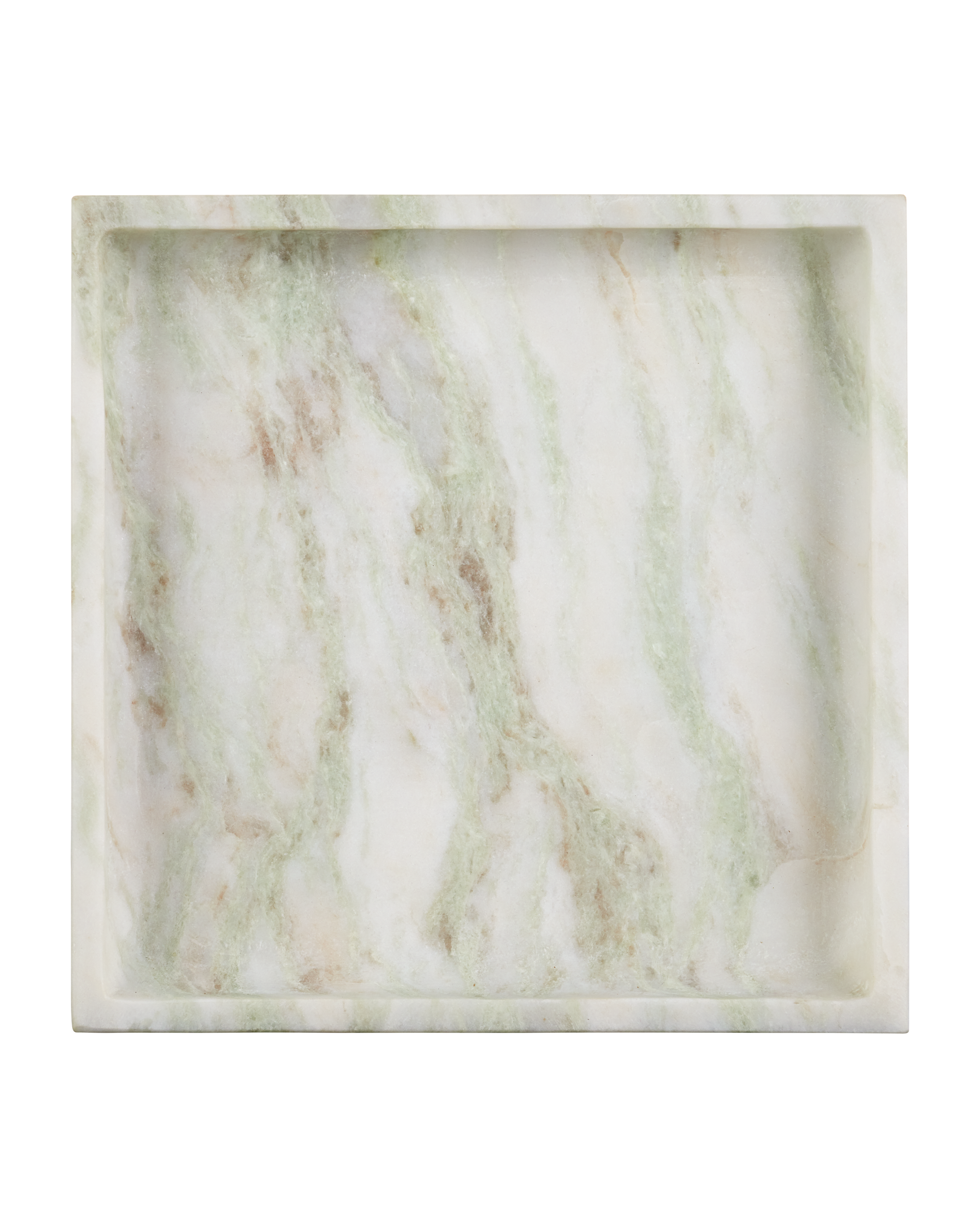 • The Bilbao Aravali Onyx Rectangular Tray is made of natural stone with lovely pastel pink and green veining flowing along its surface. The material is sourced from the Aravali Mountain Range in India. Design details include a narrow plinth where the tray tapers off at the bottom and feet that elevate it slightly from the surface. Because this is a natural stone, the veining will vary from piece to piece.
