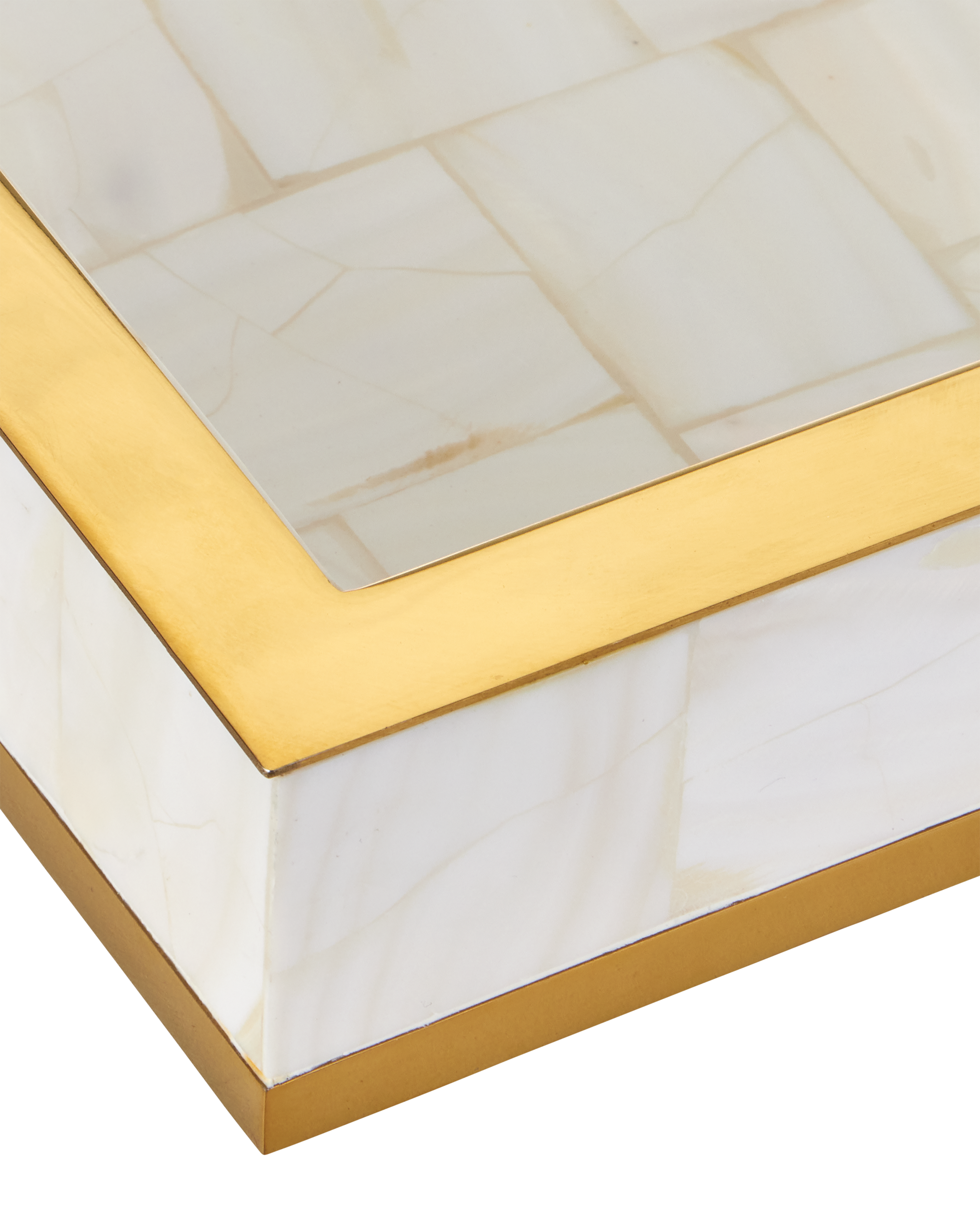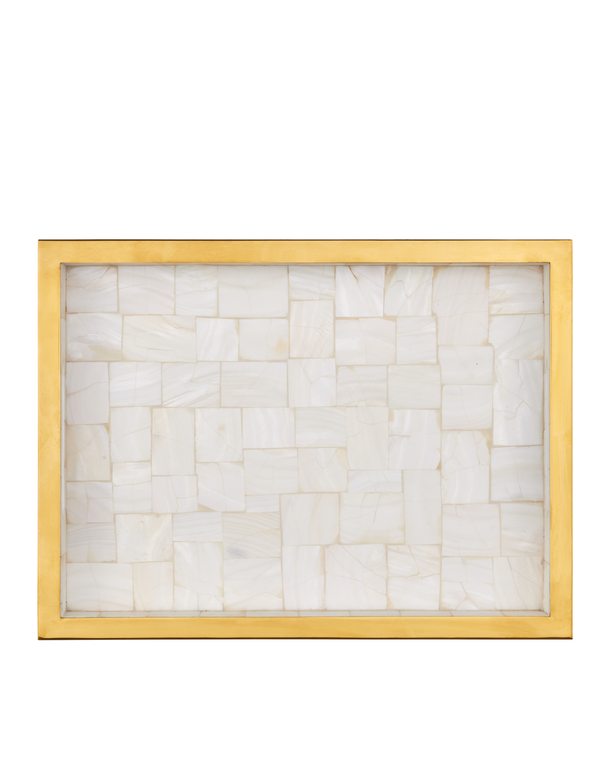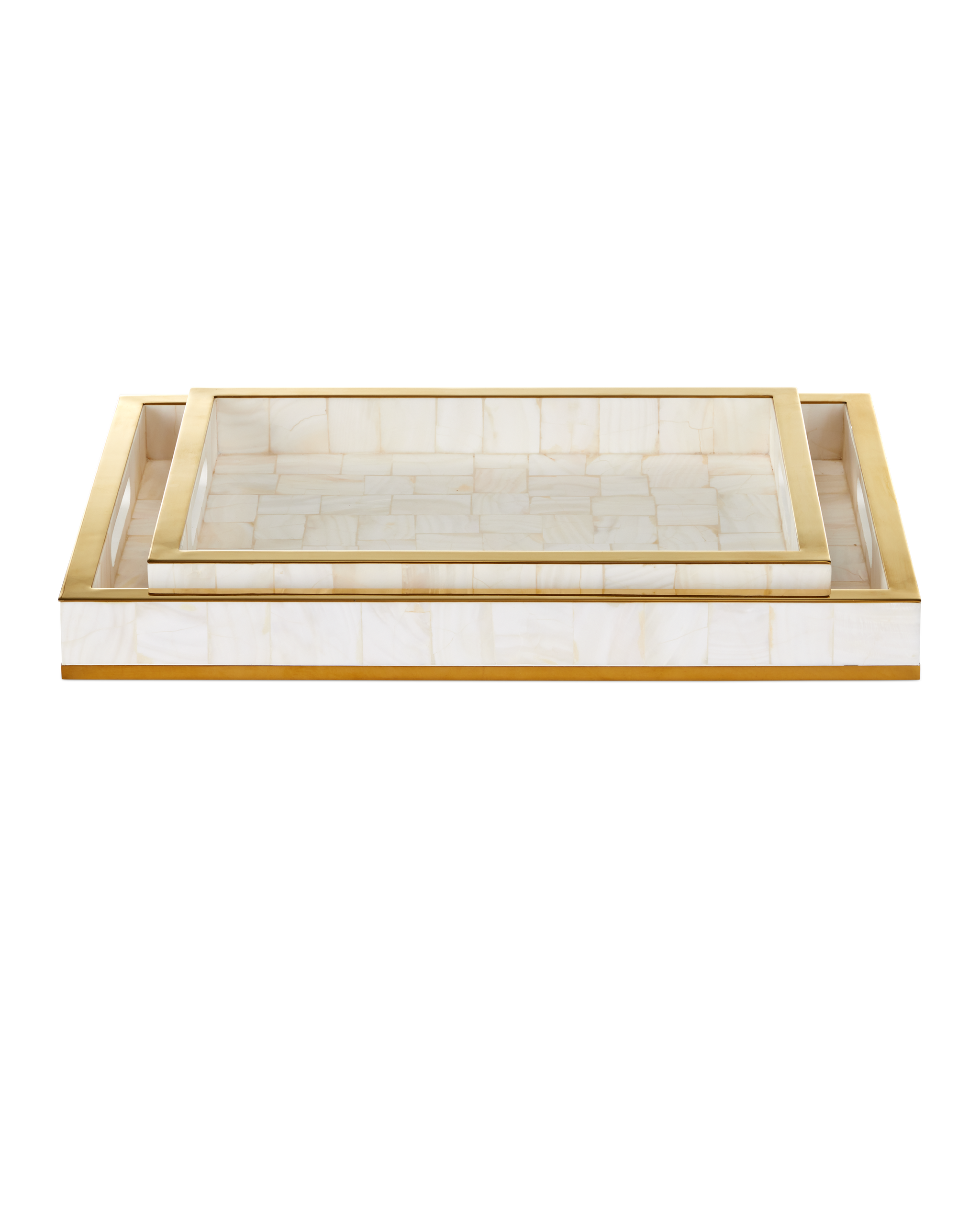 • The luxuriousness of mother-of-pearl has been prized in interiors through the ages and the Casey Mother of Pearl Tray Set -- a pair of nesting decorative trays -- is a fine example of the artisanship that has given the material lasting appeal. Made of wood, the trays' crisp ivory surfaces are rimmed in rich gold on the tops and bottom of the sides. These trays are not food safe and not heat- or cold-resistant.