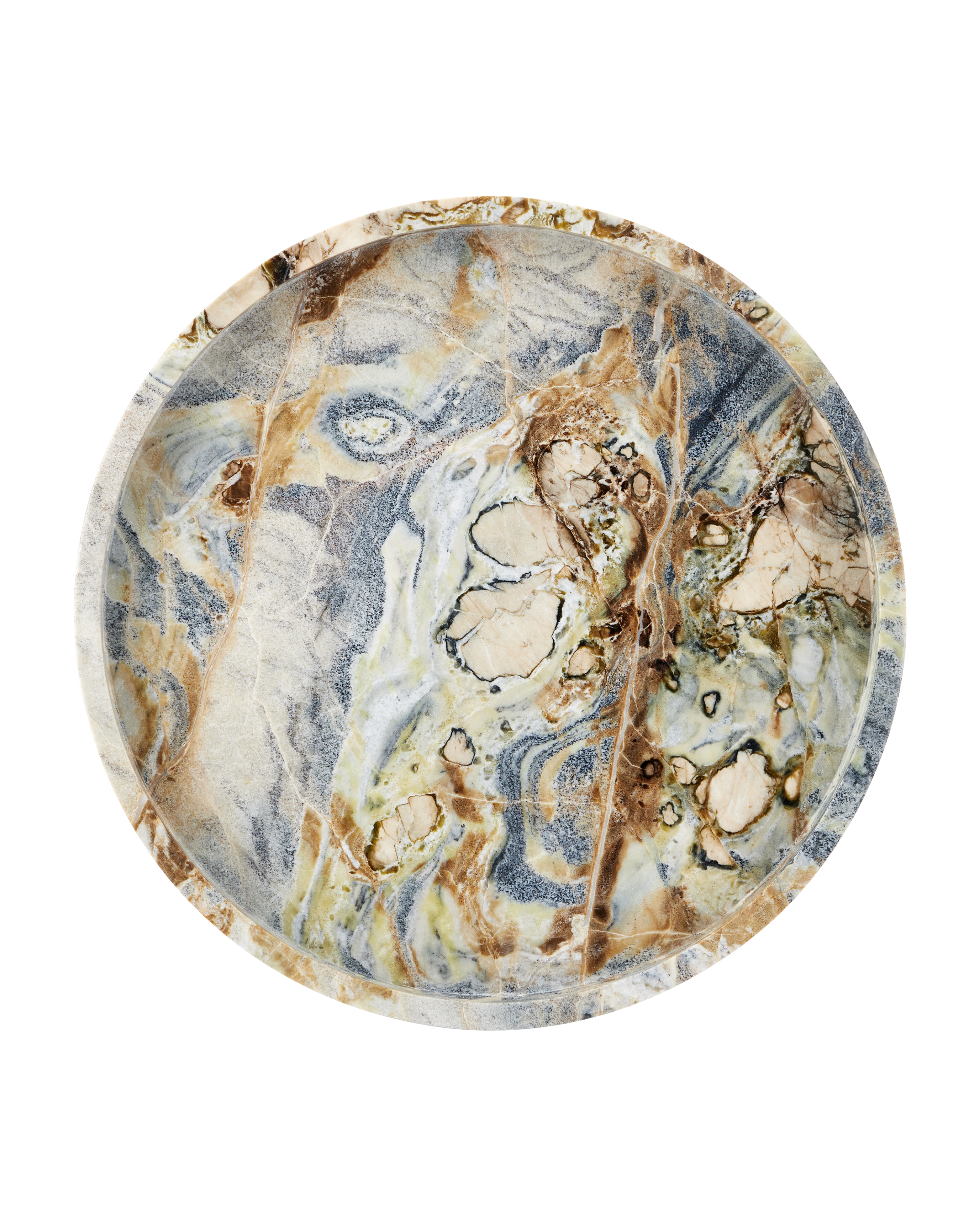 • The Freya Floral Jade Tray has bold natural markings that are so dynamic, its surface reads like a modernist painting. The characteristics of the flower jade marble include waves of color and strong patterns. The clean lines of the decorative tray with its outer rim drilled uniformly with holes serves as the ideal canvas for the stone’s painterly feel. There will be significant variations from piece to piece given the material from which it is made.