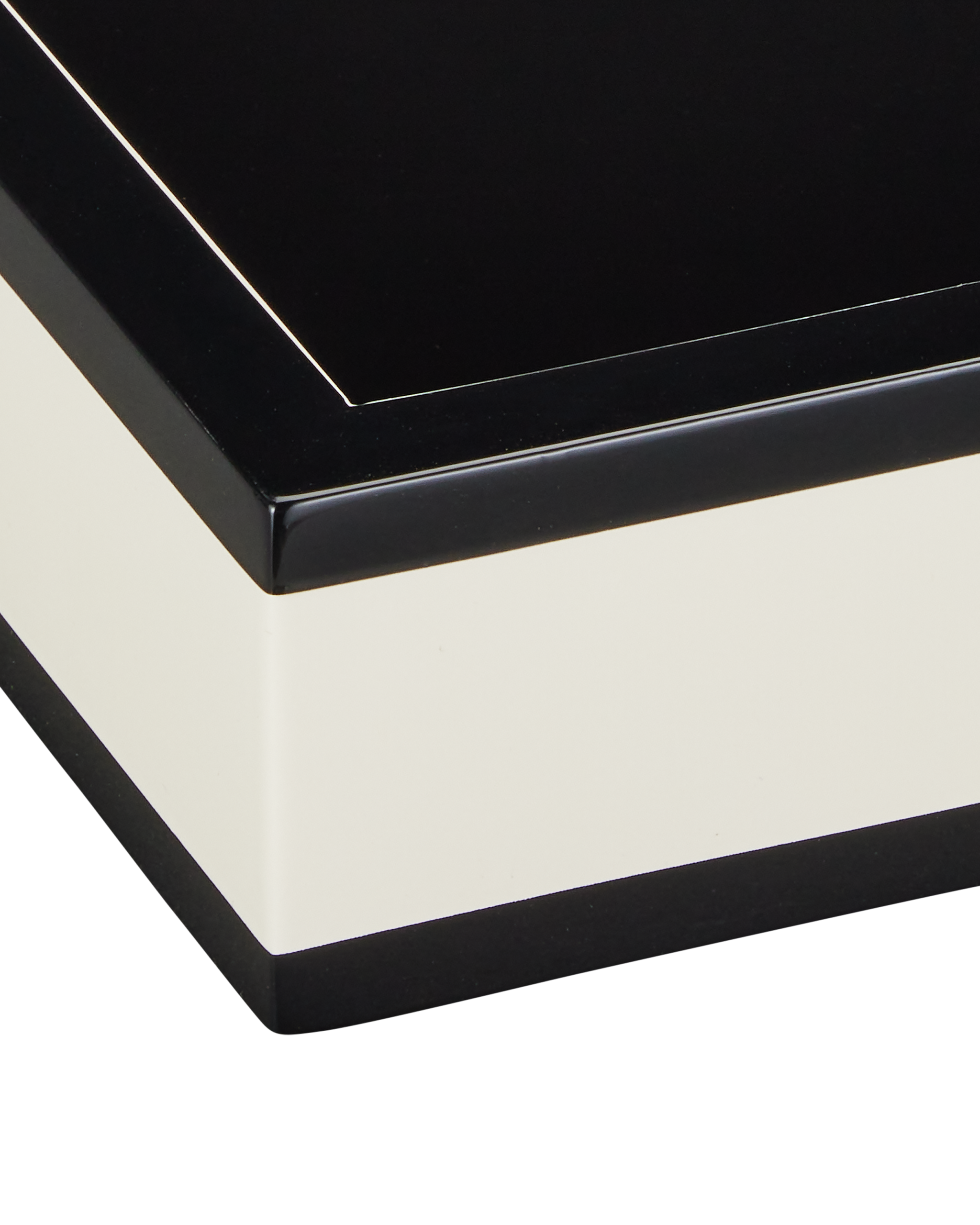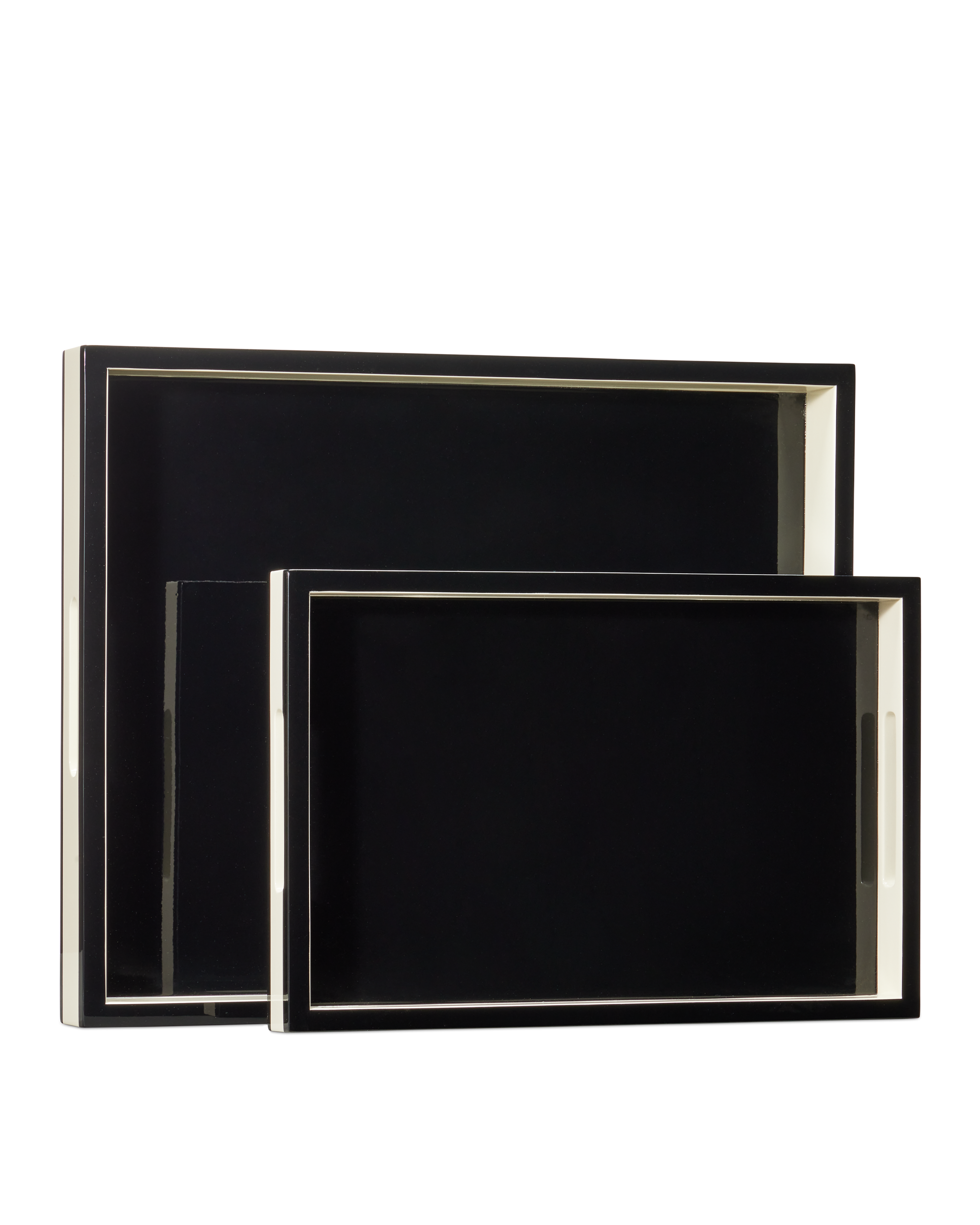 • The luxuriousness of lacquer has been prized in interiors through the ages, and the Ivory Lacquer Tray Set -- a pair of nesting decorative trays -- is an example of the artisanship that has given the treatment such lasting appeal. Made of wood, the pair of larger-than-average trays feature vibrant navy surfaces rimmed in rich black, which also covers the interior bottom surface. These trays are not food safe and not heat- or cold-resistant.
