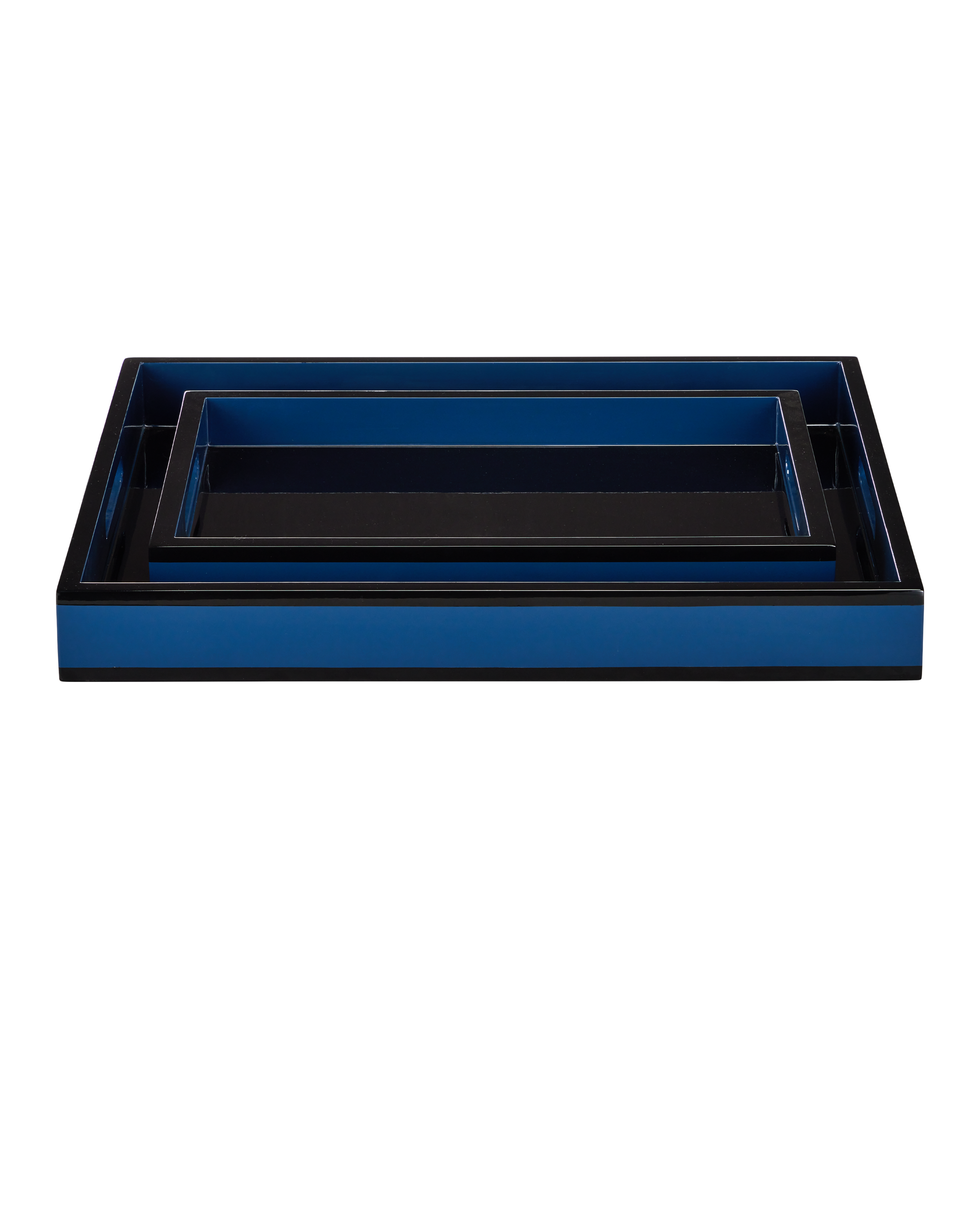 • The luxuriousness of lacquer has been prized in interiors through the ages, and the Navy Lacquer Tray Set -- a pair of nesting decorative trays -- is an example of the artisanship that has given the treatment such lasting appeal. Made of wood, the pair of larger-than-average trays feature vibrant navy surfaces rimmed in rich black, which also covers the interior bottom surface. These trays are not food safe and not heat- or cold-resistant.